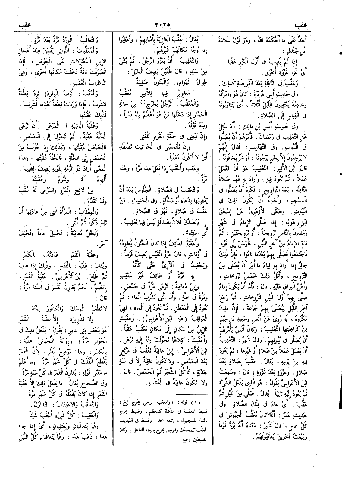 أَحدٌ على ما أَحكمَه اللّهُ وهو قول سلامة بن جَنْدل [ ص 615 ] إِذا لم يُصِبْ في أَوَّلِ الغَزْوِ عَقَّبا أَي غَزا غَزوةً أُخْرى وعَقَّبَ في النافِلَةِ بعدَ الفَريضَةِ كذلك وفي حديث أَبي هريرة كان هو وامرأَته وخادِمُه يَعْتَقِبونَ الليل أَثلاثاً أَي يَتَناوَبُونه في القيام إِلى الصلاة وفي حديث أَنس بن مالك أَنه سُئِلَ عن التَّعْقِيبِ في رَمَضانَ فأَمَرَهم أَن يُصَلُّوا في البُيوت وفي التهذيب فقال إِنهم لا يَرْجِعُون إِلا لخير يَرْجُونَه أَو شَرٍّ يَخافُونَه قال ابن الأَثير التَّعْقِيبُ هو أَن تَعْمَلَ عَمَلاً ثم تَعُودَ فيه وأَراد به ههنا صلاةَ عقب عَقِبُ كُلِّ شيءٍ وعَقْبُه وعاقِبتُه وعاقِبُه وعُقْبَتُه النافلة بعد التراويح فكَرِهَ أَن يُصَلُّوا في المسجد وأَحَبَّ أَن يكون ذلك في البيوت وحكى الأَزهري عن إِسحق بن راهويه إِذا صَلَّى الإِمامُ في شهر رمضان بالناس تَرْويحةً أَو تَرويحتين ثم قام الإِمام من آخر الليل فأَرسل إِلى قوم فاجْتمعوا فصَلى بهم بعدما ناموا فإِن ذلك جائز إِذا أَراد به قيامَ ما أُمِرَ أَن يُصَلى من التَّرويح وأَقلُّ ذلك خَمْسُ تَرويحات وأَهلُ العراق عليه قال فاما أَن يكون إِمام صلى بهم أَوَّلَ الليل الترويحات ثمَّ رَجَعَ آخِرَ الليل ليُصليَ بهم جماعةً فإِن ذلك مكروه لما روي عن أَنس وسعيد بن جبير من كراهيتهما التَّعْقِيبَ وكان أَنس يأْمُرُهم أَن يُصَلُّوا في بُيوتهم وقال شمر التَّعْقِيبُ أَن يَعْمَلَ عَمَلاً من صلاة أَو غيرها ثم يعود فيه من يومه يقال عَقَّبَ بصلاة بعد صلاة وغزوة بعد غزوة قال وسمعت ابن الأَعرابي يقول هو الذي يفعلُ الشيءَ ثم يَعُود إِليه ثانيةً يقال صَلى من الليل ثم عَقَّبَ أَي عاد في تلك الصلاة وفي حديث عمر أَنه كان يُعَقِّبُ الجُيوشَ في كل عام قال شمر معناه أَنه يَرُدُّ قوماً ويَبْعَثُ آخرين يُعاقِبُونَهم يقال عُقِّبَ الغازيةُ بأَمثالهم وأُعْقِبُوا إِذا وُجِّه مكانَهم غيرُهم والتَّعْقِيبُ أَن يَغْزُوَ الرجلُ ثم يُثَنِّي من سَنَته قال طفيل يصف الخيل