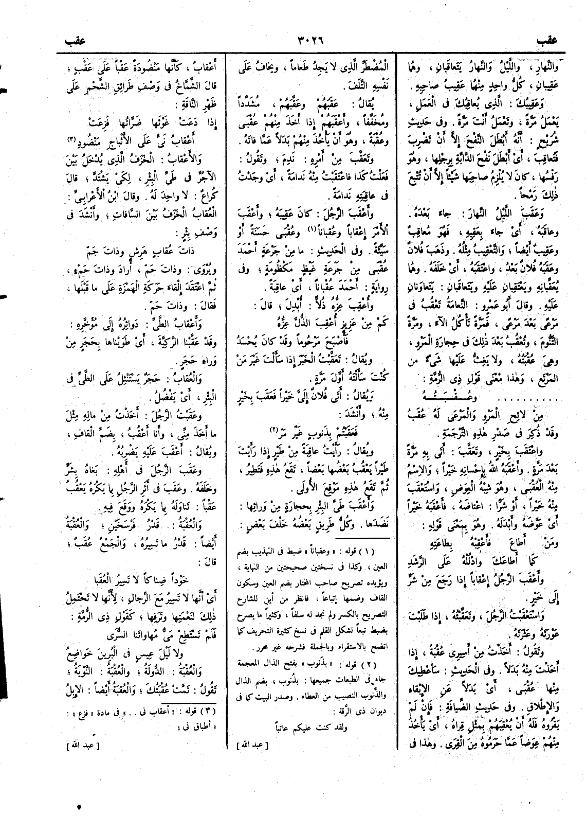 والنهار والليلُ والنهارُ يَتَعاقَبانِ وهما عَقيبان كلُّ واحدٍ منهما عَقِيبُ صاحبه وعَقِيبُك الذي يُعاقِبُك في العَمَل يَعْمَلُ مرَّةً وتَعْمَلُ أَنت مَرَّةً وفي حديث شُرَيْح أَنه أَبْطَلَ النَّفْحَ إِلا أَن تَضْرِبَ فتُعاقِبَ أَي أَبْطَلَ نَفْحَ الدابة برجلها وهو رَفْسُها كانَ لا يُلْزِمُ صاحِبَها شيئاً إِلا أَن تُتْبِعَ ذلك رَمْحاً وعَقَبَ الليلُ النهارَ جاءَ بعدَه وعاقَبه أَي جاءَ بعَقِبه فهو مُعاقِبٌ وعَقِيبٌ أَيضاً والتَّعْقِيبُ مثله وذَهَبَ فلانٌ وعَقَبَهُ فلانٌ بعدُ واعْتَقَبَه أَي خَلَفَه وهما يُعَقِّبانِه ويَعْتَقِبانِ عليه ويَتَعاقَبانِ يَتَعاونانِ عليه وقال أَبو عمرو النَّعامَةُ تَعْقُبُ في مَرْعًى بعد مَرْعًى فمرَّةً تأْكل الآءَ ومَرة التَّنُّوم وتَعْقُبُ بعد ذلك في حجارة المَرْوِ وهي عُقْبَته ولا يَغِثُّ عليها شيء من المَرْتَع وهذا معنى قول ذي الرمة
