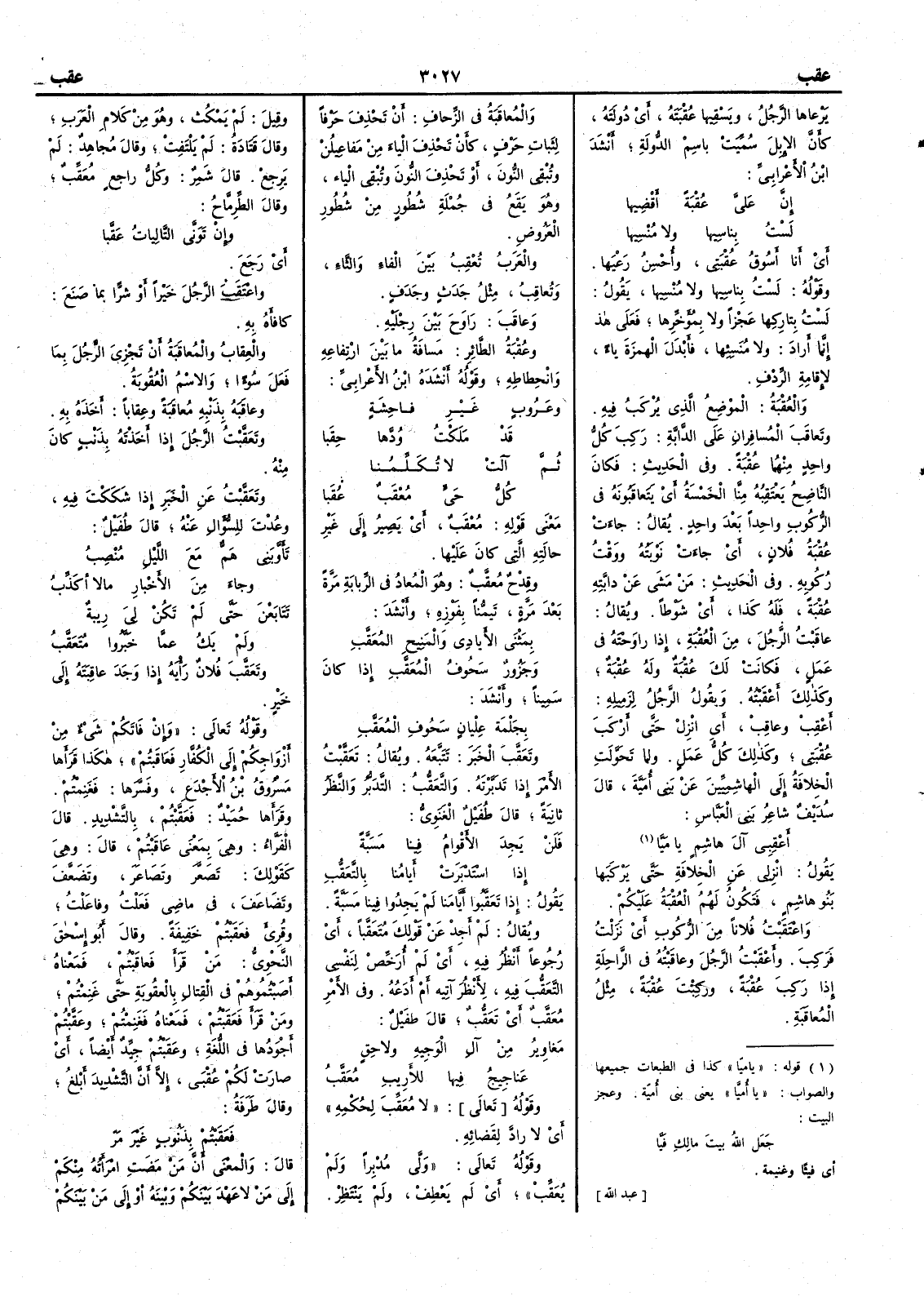 وقوله لا مُعَقِّبَ لِحُكْمِه أَي لا رادَّ لقضائِه وقوله تعالى وَلَّى مُدْبِراً ولم يُعَقِّبْ أَي لم يَعْطِفْ ولم يَنْتَظِرْ وقيل لم يمكُثْ وهو من كلام العرب وقال قتادة لم يَلْتَفِتْ وقال مجاهد لم يَرْجِعْ قال شمر وكُلُّ راجع مُعَقِّبٌ وقال الطرماح وإِنْ تَوَنَّى التَّالِياتُ عَقَّبا عقب عَقِبُ كُلِّ شيءٍ وعَقْبُه وعاقِبتُه وعاقِبُه وعُقْبَتُه أَي رَجَعَ واعْتَقَبَ الرجلَ خيراً أَو شرّاً بما صَنَع كافأَه به والعِقابُ والمُعاقَبة أَن تَجْزي الرجلَ بما فَعل سُوءًا والاسمُ العُقُوبة وعاقَبه بذنبه مُعاقَبة وعِقَاباً أَخَذَه به وتَعَقَّبْتُ الرجلَ إِذا أَخَذْتَه بذَنْبٍ كان منه وتَعَقَّبْتُ عن الخبر إِذا شَكَكْتَ فيه وعُدْتَ للسُّؤَال عنه قال