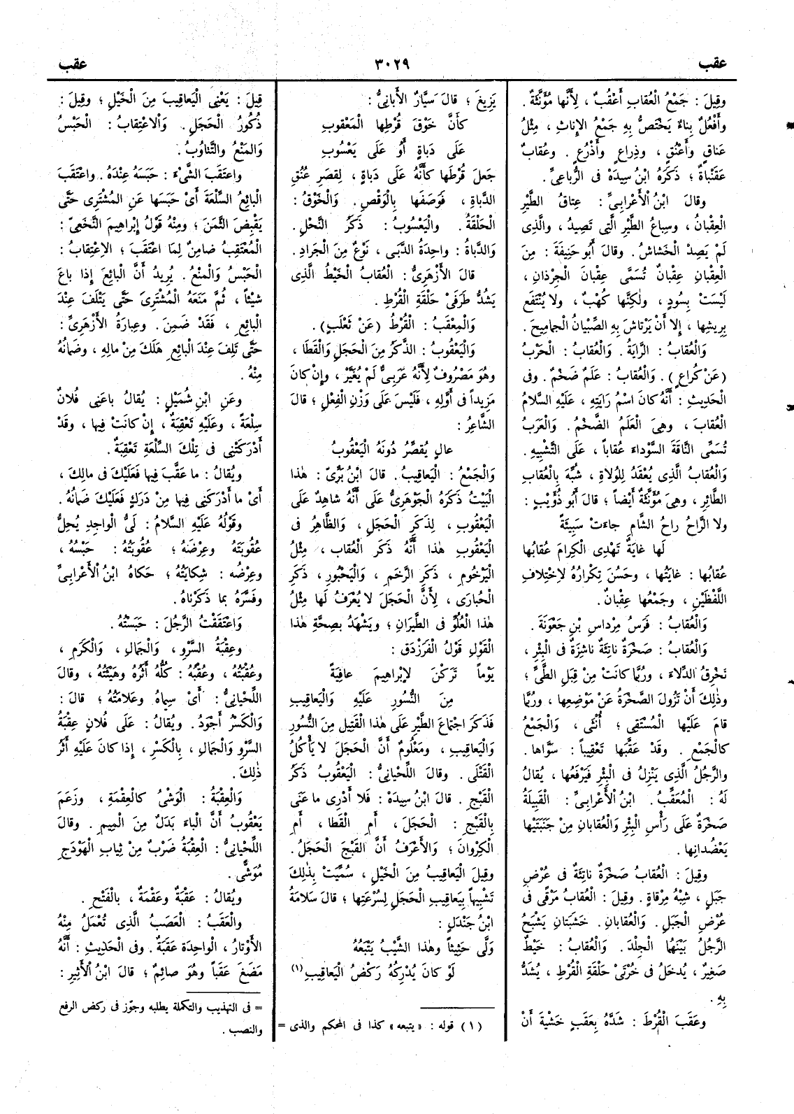 عُقابُها غايَتُها وحَسُنَ تكرارُه لاختلاف اللفظين وجَمْعُها عِقْبانٌ والعُقابُ فرس مِرْداس بن جَعْوَنَةَ والعُقابُ صَخْرة ناتئةٌ ناشِزَةٌ في البئر تَخْرِقُ الدِّلاءَ وربما كانت من قِبَلِ الطَّيِّ وذلك أَن تَزُولَ الصَّخْرَةُ عن موضعها وربما قام عليها المُسْتَقي أُنثى والجمع كالجَمْعِ وقد عَقَّبها تَعْقِيباً سَوّاها والرجُل الذي يَنْزِلُ في البئر فيَرْفَعُها يقال له المُعَقِّبُ ابن الأَعرابي القَبِيلَة صَخْرَةٌ على رأْس البئر والعُقابانِ من جَنَبَتَيْها يَعْضُدانِها وقيل العُقابُ صخرة ناتئة في عُرْضِ جَبل شِبْهُ مِرْقاة وقيل العُقابُ مَرْقًى في عُرْضِ الجَبَل والعُقابانِ خَشَبتان يَشْبَحُ الرجلُ بينهما الجِلْدَ والعُقاب خَيْطٌ صغيرٌ يُدْخَلُ في خُرْتَيْ حَلْقَةِ القُرْطِ يُشَدُّ به وعَقَبَ القُرْطَ شَدَّه بعَقَبٍ خَشْيةَ أَن يَزِيغَ قال سَيّارٌ الأَبانِيُّ [ ص 622 ]