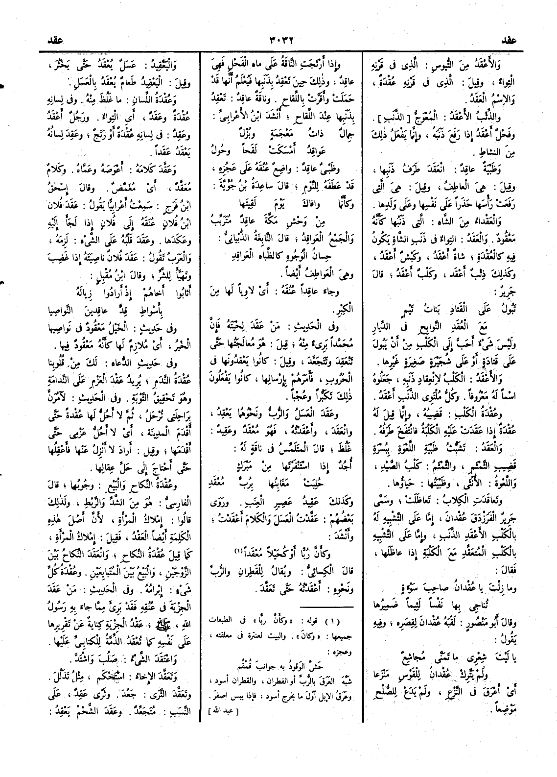 والأَعْقَدُ من التُّيوس الذي في قَرْنِه الْتِواء وقيل الذي في قرنه عُقْدة والاسم العَقَد والذئبُ الأَعْقَدُ المُعْوَجُّ وفحل أَعْقَدُ إِذا رفع ذَنَبَه وإِنما يفعل ذلك من النشاط وظبية عاقد انعقد طرَفُ ذنبها وقيل هي العاطف وقيل هي التي رفعت رأْسها حذراً على نفسها وعلى ولدها والعَقْداءُ من الشاء التي ذنبها كأَنه معقود والعَقَدُ التواءٌ في ذنَب الشاة يكون فيه كالعُقْدة شاةٌ أَعْقَدُ وكَبْشٌ أَعْقد وكذلك ذئب أَعقد وكلب أَعقد قال جرير تَبُول على القَتادِ بناتُ تَيْمٍ مع العُقَدِ النَّوابحِ في الدِّيار وليس شيءٌ أَحَبَّ إِلى الكلب من أَن يبول على قَتادةٍ أَو على شُجَيْرَةٍ صغيرة غيرها والأَعْقَدُ الكلب لانعقاد ذنبه جعلوه اسماً له معروفاً وكلُّ مُلْتَوي الذنَب أَعْقَدُ وعُقْدَة الكلب قضيبه وإِنما قيل عُقدة إِذا عَقَدَت عليه الكلبةُ فانتفخ طَرَفه والعَقَدُ تَشبُّثُ ظبيةِ اللَّعْوَةِ ببُسْرَة قَضِيبِ له الثَّمْثَم والثمثمُ كلب الصَّيْد واللعوة الأُنثى وظَبْيَتَهُا حَياؤُها وتعاقدت الكلابُ تَعاظَلَتْ وسمى جرير الفرزدقَ عُقْدانَ إِما على التشبيه له بالكلب الأَعْقَدِ الذنبِ وإِما على التشبيه بالكلب المُتعَقِّدِ مع الكلبة إِذا عاظَلَها فقال وما زِلْتَ يا عُقْدانُ صاحِبَ سَوْأَةٍ تُناجِي بها نَفْساً لَئِيماً ضَمِيرُها وقال أَبو منصور لقبه عُقْدانَ لِقِصَرِه وفيه يقول يا لَيْتَ شِعْرى ما تَمَنَّى مُجاشِعٌ ولم يَتَّرِكْ عُقْدانُ لِلقَوْسِ مَنْزَعا أَي أَعرَقَ في النَّزْع ولم يَدَعْ للصلح موضعاً وإِذا أَرْتَجَتِ الناقةُ على ماءِ الفحل فهي عاقِدٌ وذلك حين تَعْقِدُ بذنبها فَيُعْلَمُ أَنها قد حملت وأَقرت باللِّقاحِ وناقة عاقد تعقد بذَنَبِها عند اللِّقاح أَنشد ابن الأَعرابي جِمالٌ ذاتُ مَعْجَمَةٍ وبُزْلٌ عَواقِدُ أَمْسَكَتْ لَقَحاً وحُولُ وظَبْيٌ عاقِدٌ واضِعً عُنَقَه على عَجُزه قد عطَفَه للنوم قال ساعدة بن جؤية وكأَنما وافاكَ يومَ لَقِيتَها من وحشِ مكةَ عاقِدٌ مُتَرَبِّبُ والجمع العَواقِدُ قال النابغة الذبياني حِسان الوُجوهِ كالظباءِ العَواقِد وهي العواطِفُ أَيضاً وجاءَ عاقِداً عُنُقَه أَي لاوياً لها من الكِبْر وفي الحديث من عَقَدَ لِحْيَتَه فإِن محمداً بَرِيءٌ منه قيل هو معالجتها حتى تَنْعَقِد وتَتَجَعَّد وقيل كانوا يَعْقِدونها في الحروب فأَمرهم بإِرسالها كانوا يفعلون ذلك تكبراً وعُجْباً وعقدَ العسلُ والرُّبُّ ونحوُهما يَعْقِدُ وانعَقَدَ وأَعْقَدْتُه فهو مُعْقَدٌ وعَقِيد غَلُظَ قال المتلمس في ناقة له أُجُدٌ إِذا اسْتَنْفَرْتَها مِن مَبْرَكٍ حَلَبَتْ مَغَابِنَها بِرُبٍّ مِعْقَدِ وكذلك عَقيدُ عَصير العنب وروى بعضهم عَقَّدْتُ العسلَ والكلامَ أَعْقَدْتُ وأَنشد وكان رُبًّا أَوْ كُحَيْلاً مُعْقَدا قال الكسائي ويقال للقطران والربّ ونحوه أَعْقَدْتُه حتى تَعَقَّد واليَعْقِيدُ عسل يُعْقَدُ حتى يَخْثُرَ وقيل اليَعْقِيدُ طعامٌ يُعْقَدُ بالعسل وعُقْدَةِ اللسان ما غُلظَ منه وفي لسانه عُقْدَةٌ وعَقَدٌ أَي التِواء ورجل أَعْقَدُ وعَقِدٌ في لسانه عُقْدَة أَو رَتَجٌ وعَقِدَ لسانهُ يَعْقَدُ عَقَداً وعَقَّد كلامَه أَعوَصَه وعَمَّاه وكلامٌ مُعَقَّدٌ أَي مُغَمَّضٌ وقال إِسحق بن فرج سمعت أَعرابيّاً يقول عَقَدَ فلانُ بن فلان عُنقَه إِلى فلان إِذا لجأَ إِليه وعَكَدَها وعَقَدَ قَلْبه على الشيء لَزِمَه والعرب تقول عَقَد فلان ناصيته إِذا غضب وتهيأَ للشر وقال ابن مقبل أَثابُوا أَخاهُمْ إِذْ أَرادُوا زِيالَه بأَسْواطِ قِدٍّ عاقِدِينَ النَّواصِيا وفي حديث الخيلُ مَعقودٌ في نواصيها الخيْرُ أَي ملازم لها كأَنه معقود فيها وفي حديث الدعاء لك من قلوبنا عُقْدَةُ النَّدم يريد عَقْدَ العزم على الندامة وهو تحقيق التوبة وفي الحديث لآمُرَنَّ براحلتي تُرْحَلُ ثم لا أَحُلُّ لها عُقْدةً حتى أَقدَمَ المدينة أَي لا أَحُلُّ عزمي حتى أَقدَمَها وقيل أَر