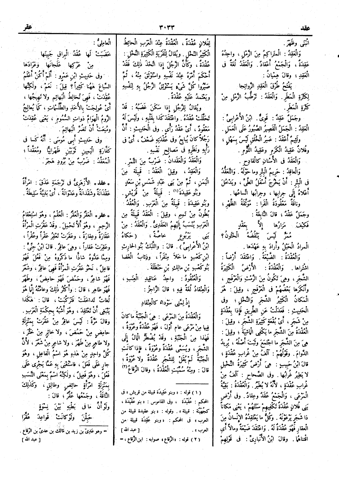انبنى وظهر والعَقِدُ المتراكِمُ من الرمل واحده عَقِدَة والجمع أَعقادٌ والعَقَدُ لغة في العَقِدِ وقال هميان يَفْتَحُ طُرْقَ العَقِدِ الرَّواتِجا لكثرة المطر والعَقدُ ترطُّبُ الرمل من كثرة المطر وجمل عَقِدٌ قويّ ابن الأَعرابي العَقِدُ الجمل القصير الصبور على العمل ولئيم أَعقد عسر الخُلُق ليس بسهل وفلان عَقِيدُ الكرَم وعَقِيدُ اللُّؤْمِ والعَقَدُ في الأَسنان كالقادِحِ والعاقِدُ حريم البئر وما حوله والتَّعَقُّدُ في البئر أَن يَخْرخَ أَسفَلُ الطيِّ ويدخل أَعلاه إِلى جِرابها وجِرابُها اتساعها وناقة مَعْقُودَةُ القَرا مُوَثَّقَهُ الظهر وجمل عَقْدٌ قال النابغة فكيْفَ مَزارُها إِلا بِعَقْدٍ مُمَرٍّ ليس يَنْقُضُه الخَو ون ؟ المراد الحَبْلُ وأَراد به عَهْدَها والعُقْدَةُ الضَّيْعَةُ واعتَقَدَ أَيضاً اشتراها والعُقْدة الأَرض الكثيرة الشجر وهي تكون من الرِّمْثِ والعَرْفَجِ وأَنكرها بعضهم في العرفج وقيل هو المكان الكثير الشجر والنخل وفي الحديث فعدلت عن الطريق فإِذا بعقدة من شجر أَي بقعة كثيرة الشجر وقيل العقدة من الشجر ما يكفي الماشية وقيل هي من الشجر ما اجتمع وثبت أَصله يريد الدوامَ وقولهم آلَفُ من غُرابِ عُقْدَة قال ابن حبيب هي أَرض كثيرة النخيل لا يطيرُ غُرابُها وفي الصحاح آلفُ من غُراب عُقْدة لأَنه لا يُطَيَّرُ والعُقْدَة بقية المَرْعَى والجمع عُقَدٌ وعِقادٌ وفي أَرض بني فلان عَقْدة تكفيهم سنتهم يعني مكاناً ذا شجر يرعونه وكل ما يعتقده الإِنسان من العقار فهو عقدة له واعتقد ضَيْعة ومالاً أَي اقتناهما وقال ابن الأَنباري في قولهم لفلان عُقْدة العقدة عند العرب الحائط الكثير النخل ويقال للقَرْية الكثيرة النخل عُقْدة وكأَنّ الرجل إِذا اتخذ ذلك فقد أَحكم أَمره عند نفسه واستوثق منه ثم صيروا كل شيء يستوثق الرجل به لنفسه ويعتمد عليه عُقْدة ويقال للرجل إِذا سكن غضبه قد تحللت عُقَدُه واعتقد كذا بقلبه وليس له معقودٌ أَي عقدُ رأْي وفي الحديث أَن رجلاً كان يبايع وفي عُقْدته ضعف أَي في رأْيه ونظره في مصالح نفسه والعَقَدُ والعَقَدانُ ضرب من التمر والعَقِدُ وقيل العَقَد قبيلة من اليمن ثم من بني عبد شمس بن سعد وبنو عَقِيدَةَ قبيلة من قريش وبنو عَقِيدَةَ قبيلة من العرب والعُقُدُ بطون من تميم وقيل العَقَدُ قبيلة من العرب يُنْسَبُ إِليهم العَقَدِيُّ والعَقَدُ من بني يربوع خاصة حكاه ابن الأَعرابي قال واللبَّكُ بنو الحرث بن كعب ما خلا مِنْقَراً وذِئابُ الغضا بنو كعب بن مالك بن حَنْظَلَة والعُنْقُودُ واحد عناقِيدِ العنب والعِنقادُ لغة فيه قل الراجز إِذ لِمَّتي سَوْداء كالعِنْقادِ والعُقْدَةُ من المَرْعَى هي الجَنْبَةُ ما كان فيها من مَرْعَى عام أَوّلَ فهو عُقْدَةٌ وعُرْوَةٌ فهذا من الجَنْبَة وقد يضطرُّ المالُ إلى الشجر ويسمى عقدة وعروة فإِذا كانت الجنبة لم يقل للشجر عقدة ولا عروة قال ومنه سميت العُقْدَة وقال الرقاع العاملي خَضَبَتْ لها عُقَدُ البِراقِ جَبينَها مِن عَرْكِها عَلَجانَها وعَرادَها وفي حديث ابن عمرو أَلم أَكن أَعلم السباعَ ههنا كثيراً ؟ قيل نعم ولكنها عُقِدَت فهي تخالط البهائم ولا تَهِيجُها أَي عُولِجَتْ بالأُخَذِ والطلمسات كما يعالج الرومُ الهوامَّ ذواتِ السموم يعني عُقِدت ومُنِعتْ أَن تضر البهائم وفي حديث أَبي موسى أَنه كسا في كفَّارة اليمين ثوبين ظَهْرانِيًّا ومُعَقَّداً المُعَقَّدُ ضرب من برودِ هَجَرَ