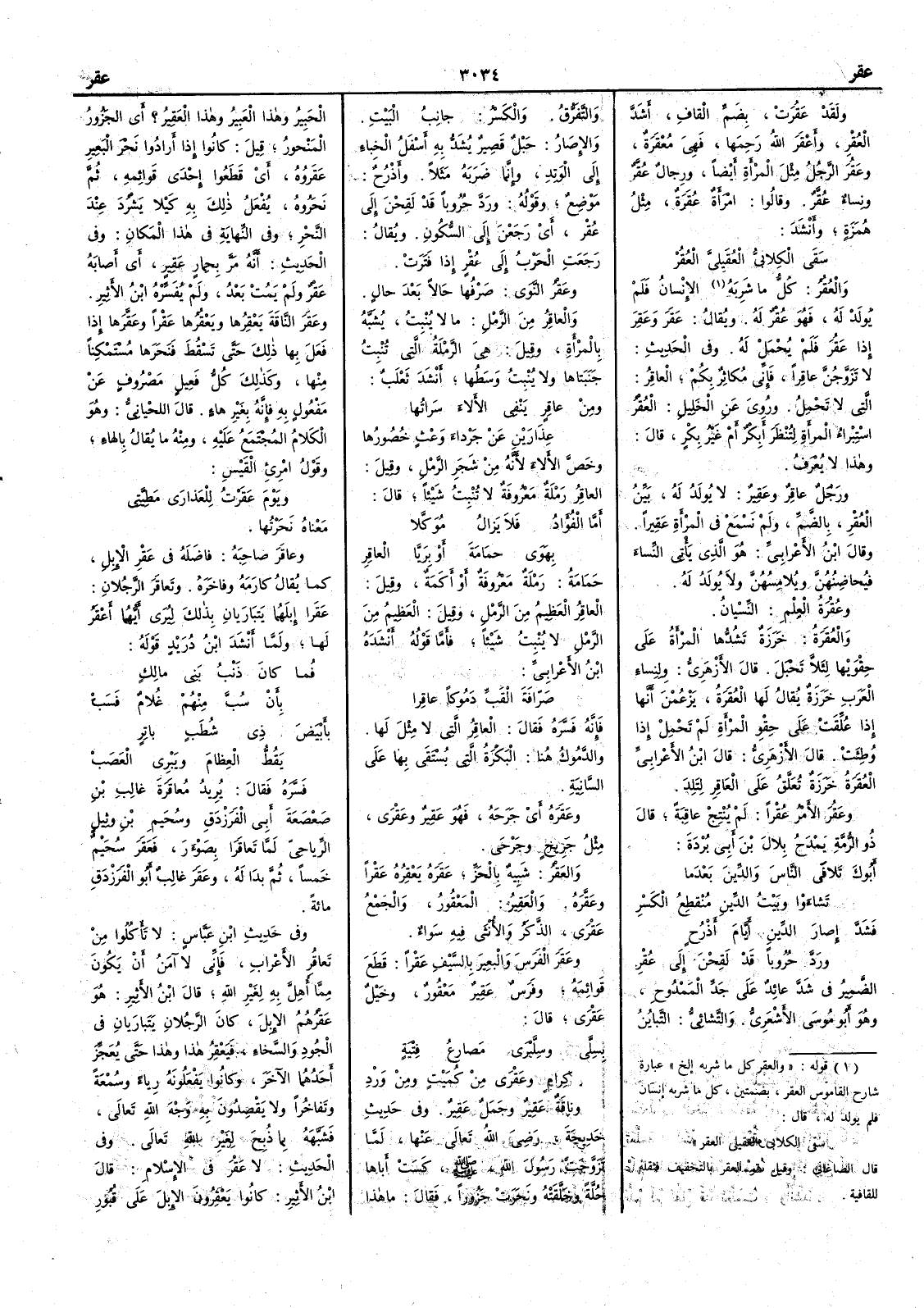 ( * قوله « والعقر كل ما شربه إلخ » عبارة شارح القاموس العقر بضمتين كل ما شربه إِنسان فلم يولد له قال « سقى الكلابي العقيلي العقر » قال الصاغاني وقيل هو العقر بالتخفيف فنقله للقافية ) الإِنسان فلم يولد له فهو عُقْرٌ له ويقال عَقَر وعَقِر إِذا عَقُر فلم يُحْمَل له وفي الحديث لا تَزَوَّجُنَّ عاقِراً فإِني مُكاثِرٌ بكم العاقرُ التي لا تحمل وروي عن الخليل العُقْرُ اسْتِبْراءُ المرأَة لتُنْظَرَ أَبِكْرٌ أَم غير بكر قال وهذا لا يعرف ورجل عاقرٌ وعَقِيرٌ لا يولد له بَيْن العُقْر بالضم ولم نسمع في المرأَة عَقِيراً وقال ابن الأَعرابي هو الذي يأْتي النساء فيُحاضِنُهنّ ويُلامِسهُنّ ولا يولد له وعُقْرةُ لعهدهم النِّسْيانُ والعُقَرة خرزة تشدُّها المرأَة على حَِقْوَيْها لئلا تَحْبَل قال الأَزهري ولسنا العرب خرزةٌ يقال لها العُقَرة يَزْعُمْن أَنها إِذا عُلِّقَت على حِقْوِ المرأَة لم تحمل إِذا وُطِئت قال الأَزهري قال ابن الأَعرابي العُقَرة خرزةٌ تعلَّق على العاقر لتَلِدَ وعَقُر الأَمرُ عُقْراً لم يُنْتِجْ عاقِبةً قال ذر الرمة يمدح بلال بن أَبي بردة أَبوكَ تَلافَى الناسَ والدِّينَ بعدما تَشاءَوْا وبَيْتُ الدِّين مُنْقطِع الكَسْر فشدَّ إِصارَ الدِّينِ أَيَّامَ أَذْرُحٍ ورَدَّ حُروباً لَقِحْن إِلى عُقْرِ الضمير في شدَّ عائد على جد الممدوح وهو أَبو موسى الأَشعري والتَّشائِي التبايُنُ والتَّفَرُّق والكَسْرُ جانب البيت والإِصَارُ حَبْل قصير يشدّ به أَسفلُ الخباء إِلى الوتد وإِنما ضربه مثلاً وأَذْرُح موضع وقوله وردَّ حُروباً قد لَقِحْنَ إِلى عُقْرِ أَي رَجَعْن إِلى السكون ويقال رَجَعَت الحربُ إِلى عُقْرٍ إِذا فَتَرَتْ وعَقْرُ النَّوَى صَرْفُها حالاً بعد حال والعاقِرُ من الرمل ما لا يُنْبِت يُشَبَّه بالمرأَة وقيل هي الرملة التي تُنْبِت جَنَبَتَاها ولا يُنْبِت وَسَطُها أَنشد ثعلب ومِن عاقرٍ يَنْفِي الأَلاءَ سَراتُها عِذَارَيْنِ عَنْ جَرْداءَ وَعْثٍ خُصورُها وخَصَّ الأَلاء لأَنه من شجر الرمل وقيل العاقر رملة معروفة لا تنبت شيئاً قال أَمَّا الفُؤادُ فلا يَزالُ مُوكَّلاً بهوى حَمامةَ أَو بِرَيّا العاقِر حَمامَةُ رملة معروفة أَو أَكَمَة وقيل العاقِرُ العظيم من الرمل وقيل العظيم من الرمل لا ينبت شيئاً فأَما قوله أَنشده ابن الأَعرابي صَرَّافةَ القَبِّ دَموكاً عاقِرا فإِنه فسره فقال العاقِرُ التي لا مثل لها والدَّمُوك هنا البَكَرة التي يُسْتقى بها على السانِية وعَقَرَه أَي جَرَحَه فهو عَقِيرٌ وعَقْرَى مثَّل جريح وجَرْحَى والعَقْرُ شَبِيهٌ بالحَزِّ عَقَرَه يَعْقِره عَقْراً وعَقَّره والعَقِيرُ المَعْقورُ والجمع عَقْرَى الذكر والأُنثى فيه سواء وعَقَر الفرسَ والبعيرَ بالسيف عَقْراً قطع قوائمه وفرس عَقِيرٌ مَعْقورٌ وخيل عَقْرى قال بسِلَّى وسِلِّبْرَى مَصارعُ فِتْيةٍ كِرامٍ وعَقْرَى من كُمَيْتٍ ومن وَرْدِ وناقةٌ عَقِيرٌ وجمل عَقِير وفي حديث خديجة رضي الله تعالى عنها لما تزوجت رسولُ الله صلى الله عليه وسلم كَسَتْ أَباها حُلَّةً وخَلَّقَتْه ونَحَرَتْ جزوراً فقال ما هذا الحَبِيرُ وهذا العَبِيرُ وهذا العَقِيرُ ؟ أَي الجزور المنحور قيل كانوا إِذا أَرادوا نَحْرَ البعير عَقَرُوه أَي قطعوا إِحدى قوائمه ثم نَحرُوه يفْعل ذلك به كَيْلا يَشْرُد عند النَّحْر وفي النهاية في هذا المكان وفي الحديث أَنه مَرَّ بحِمارٍ عَقِيرٍ أَي أَصابَه عَقْرٌ ولم يَمُتْ بعد ولم يفسره ابن الأَثير وعَقَرَ الناقة يَعْقِرُها ويَعْقُرها عَقْراً وعَقَّرَها إِذا فعل بها ذلك حتى تسقط فَنَحَرَها مُسْتمكناً منها وكذلك كل فَعِيل مصروف عن مفعول به فإِنه بغير هاء قال اللحياني وهو الكلام المجتمع عليه ومنه ما يقال بالهاء وقول امرئ القيس ويومَ عَقَرْتُ للعَذارَى مَطِيَّتي فمعناه نحرتها وعاقَرَ صاحبَه فاضَلَه في عَقْر الإِبل كما يقال كارَمَه وفاخَرَه وتعاقَر الرجُلان عَقَرا إِبلِهَما يَت
