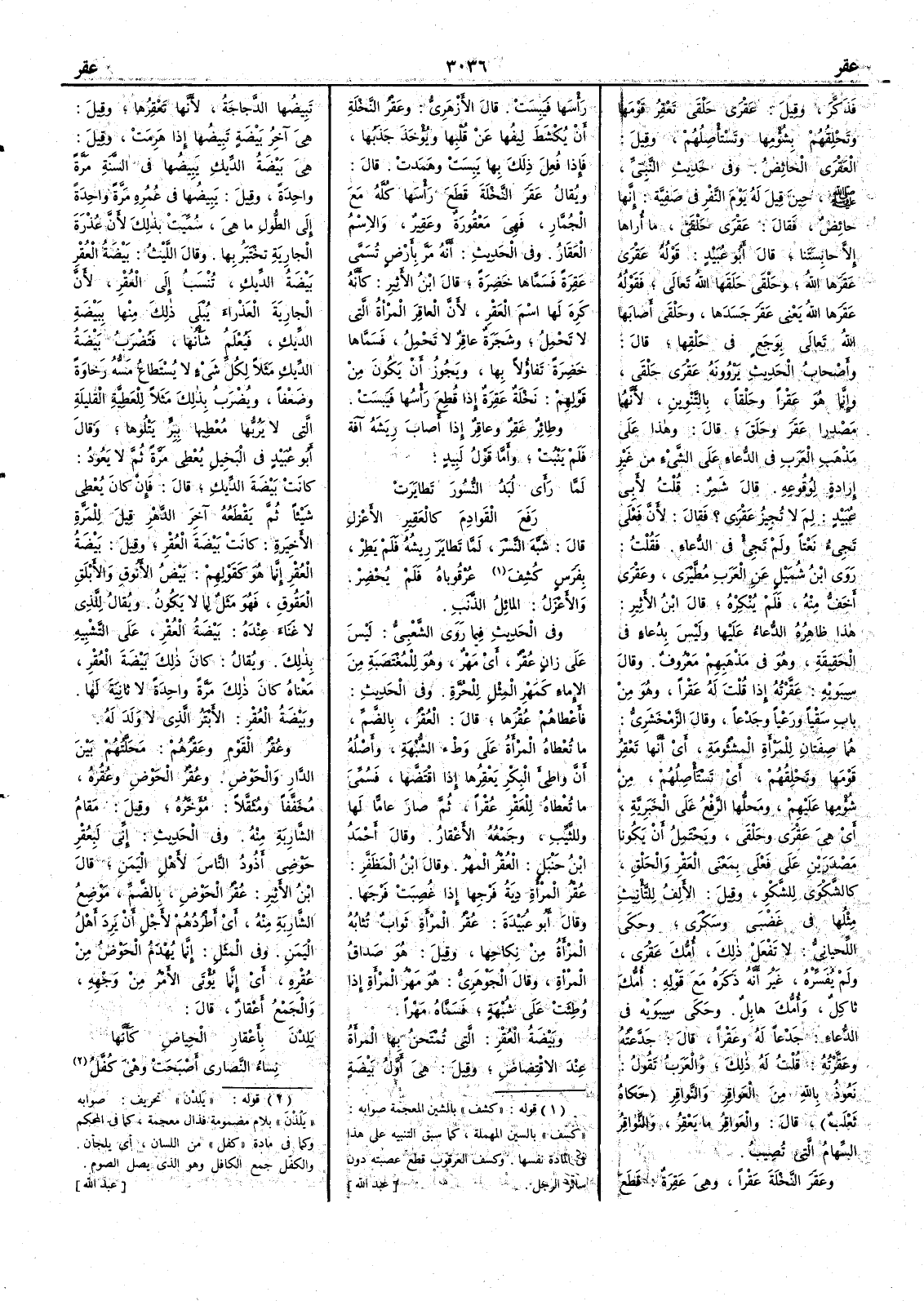 فذكّر وقيل عَقْرى حَلْقى تَعِقْرُ قومها وتَحْلِقُهم بشُؤْمِها وتستأْصلهم وقيل العَقْرى الحائض وفي حديث النبي صلى الله عليه وسلم حين قيل له يوم النَّفْر في صَفِيَّة إِنها حائضٌ فقال عَقْرَى حَلقى ما أُراها إِلاَّ حابِسَتَنا قال أَبو عبيد قوله عَقْرى عَقَرَها اللهُ وحَلْقى خَلَقَها اللهُ تعالى فقوله عَقَرَهَا الله يعني عَقَرَ جسدَها وحَلْقى أَصابَها الله تعالى بوجعٍ في حَلْقِها قال وأَصحاب الحديث يروونه عَقْرى حَلْقِى وإِنما هو عَقْراً وحَلْقاً بالتنوين لأَنهما مصدرا عَقَرَ وحَلَقَ قال وهذا على مذهب العرب في الدعاء على الشيء من غير إِرادة لوقوعه قال شمر قلت لأَبي عبيد لم لا تُجِيزُ عَقْرى ؟ فقال لأَنّ فَعْلى تجيء نعتاً ولم تجئ في الدعاء فقلت روى ابن شميل عن العرب مُطَّيْرى وعَقْرى أَخَفّ منه فلم يُنْكِرْه قال ابن الأَثير هذا ظاهرُه الدعاء عليها وليس بدعاء في الحقيقة وهو في مذهبهم معروف وقال سيبويه عَقَّرْته إِذا قلت له عَقْراً وهو من باب سَقْياً ورَعْياً وجَدْعاً وقال الزمخشري هما صِفتان للمرأَة المشؤومة أَي أَنها تَعْقِرُ قومَها وتَحْلِقُهم أَي تستأْصِلُهم من شؤمها عليهم ومحلُّها الرفع على الخبرية أَي هي عَقْرى وحَلْقى ويحتمل أَن يكونا مصدرين على فَعْلى بمعنى العَقْر والحَلْق كالشَّكْوى للشَّكْوِ وقيل الأَلف للتأْنيث مثلها في غَضْبى وسَكْرى وحكى اللحياني لا تفعل ذلم أُمُّك عَقْرى ولم يفسره غير أَنه ذكره مع قوله أُمك ثاكِلٌ وأُمُّك هابِلٌ وحكى سيبويه في الدعاء جَدْعاً له وعَقْراً وقال جَدَّعْتُه وعَقَّرْته قلت له ذلك والعرب تقول نَعُوذُ بالله من العَواقِر والنَّواقِر حكاه ثعلب قال والعواقِرُ ما يَعْقِرُ والنَّواقِرُ السهامُ التي تُصيب وعَقَرَ النخلة عَقْراً وهي عَقِرةٌ قطع رأْسها فيبست قال الأَزهري وعَقْرُ النَّخْلة أَنُ يُكْشَطَ لِيفُها عن قَلْبها ويؤخذ جَذَبُها فإِذا فعل ذلك بها يَبِسَتْ وهَمَدت قال ويقال عَقَر النخلة قَطَع رأْسَها كلَّه مع الجُمّار فهي مَعْقورة وعَقِير والاسم العَقَار وفي الحديث أَنه مَرَّ بأَرضٍ تسمى عَقِرة فسماها خضِرَة قال ابن الأَثير كأَنه كرِه لها اسم العَقْر لأَن العاقِرَ المرأَةُ التي لا تحمل وشجرة عاقر لا تحمل فسماها خَضِرة تفاؤلاً بها ويجوز أَن يكون من قولهم نخلة عَقِرةٌ إِذا قطع رأْسها فيبست وطائر عَقِرٌ وعاقِرٌ إِذا أَصاب ريشَه آفةٌ فلم ينبت وأَما قول لبيد لَمَّا رأَى لُبَدُ النُّسورَ تطايَرَتْ رَفَعَ القَوادِمَ كالعَقِير الأَعْزلِ قال شبَّه النَّسْرَ لمّا تطاير ريشُه فلم يَطِرْ بفرس كُشِفَ عرقوباه فلم يُحْضِرْ والأَعْزَلُ المائل الذنب وفي الحديث فيما روى الشعبي ليس على زانٍ عُقْرٌ أَي مَهْر وهو للمُغْتَصَبةِ من الإِماء كمَهْرِ المثل للحُرَّة وفي الحديث فأَعْطاهم عُقْرَها قال العُقْرُ بالضم ما تُعْطاه المرأَة على وطء الشبهة وأَصله أَن واطئ البِكْر يَعْقِرها إِذا اقْتَضَّها فسُمِّيَ ما تُعْطاه للعَقْرِ عُقْراً ثم صار عامّاً لها وللثيّب وجمعه الأَعْقارُ وقال أَحمد بن حنبل العُقْرُ المهر وقال ابن المظفر عُقْرُ المرأَة دبةُ فرجها إذا غُصِبَت فَرْجَها وقال أَبو عبيدة عُقْرُ المرأَة ثَوابٌ تُثابُه المرأَةُ من نكاحها وقيل هو صداق المرأَة وقال الجوهري هو مَهْرُ المرأَة إِذا وُِطِئت على شبهة فسماه مَهْراً وبَيْضَةُ العُقْرِ التي تُمْتحنُ بها المرأَةُ عند الاقْتِضاض وقيل هي أَول بيضة تبَِيضُها الدجاجة لأَنها تَعْقِرها وقيل هي آخر بيضة تبيضها إِذا هَرِمَت وقيل هي بيضة الدِّيك يبيضها في السنة مرة واحدة وقيل يبيضها في عمره مرة واحدة إِلى الطُّول ما هي سميِّت بذلك لأَن عُذْرةَ الجارية تُخْتَبَرُ بها وقال الليث بَيْضةُ العُقْر بَيْضةُ الدِّيك تُنْسَبُ إِلى العُقْر لأَن الجارية العذراء يُبْلى ذلك منها بِبَيْضة الدِّيك فيعلم شأْنها فتُضْرَبُ بيضةُ الديك مثلاً لكل شيء لا يستطاع مسُّه رَخاوةً