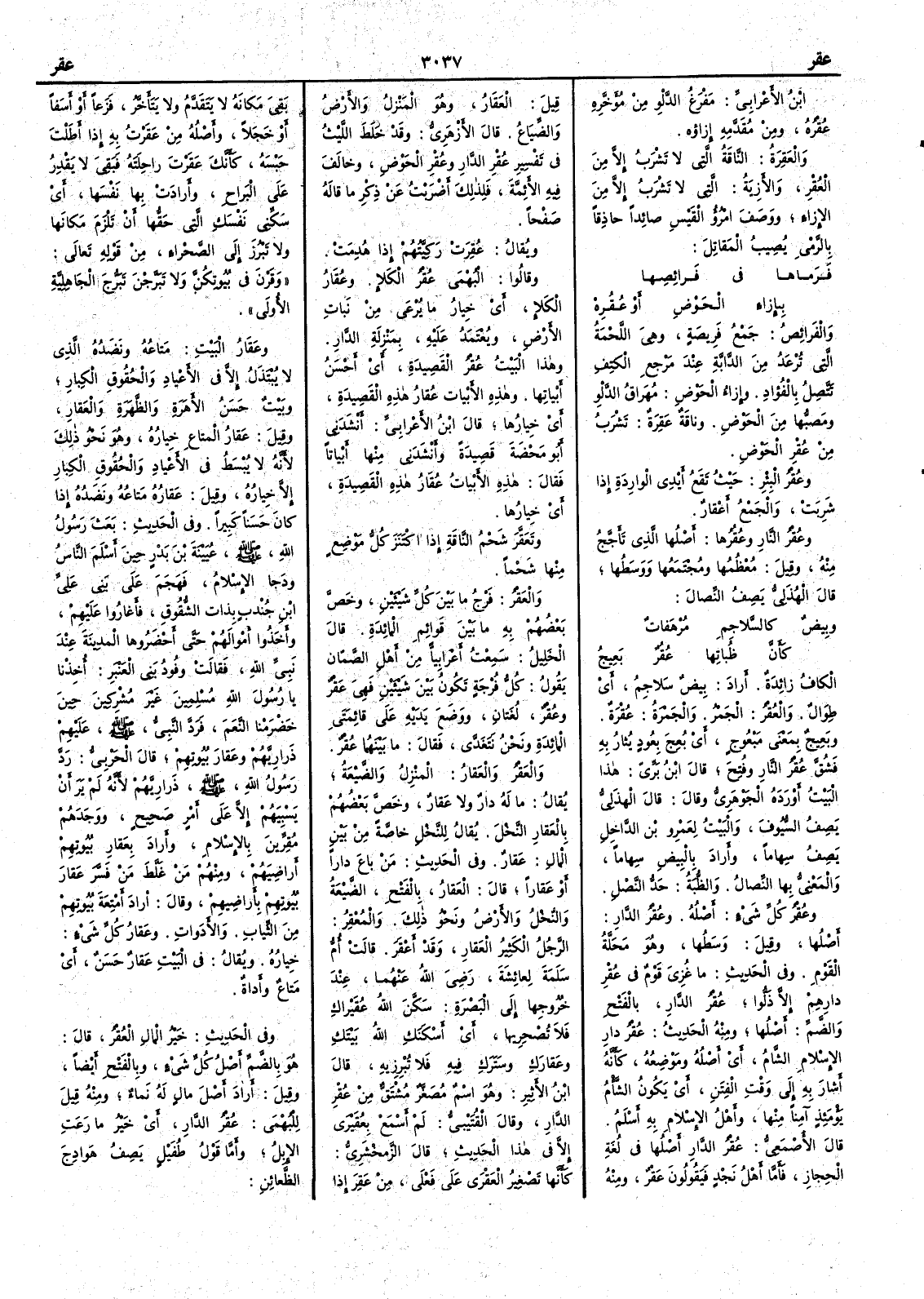 ابن الأَعرابي مَفْرَغُ الدَّلْو من مُؤَخَّرِه عُقْرُه ومن مُقَدَّمِه إزاؤه والعَقِرةُ الناقةُ التي لا تشرب إِلاَّ من العُقْرِ والأَزِيَة التي لا تَشْرَبُ إِلاَّ من الإِزاءِ ووصف امرؤ القيس صائداً حاذقاً بالرمي يصيب المَقاتل فَرماها في فَرائِصِها بإِزاءِ الحَوْضِ أَو عُقُرِهْ والفرائِصُ جمع فَرِيصة وهي اللحمة التي تُرْعَدُ من الدابة عند مرجع الكتف تتّصل بالفؤاد وإِزاءُ الحوض مُهَراقُ الدَّلْوِ ومصبُّها من الحوض وناقةٌ عَقِرةٌ تشرب من عُقْرِ الحوض وعُقْرُِ البئر حيث تقع أَيدي الواردة إِذا شربت والجمع أَعْقارٌ وعُقْرُ النار وعُقُرها أَصلها الذي تأَجَّجُ منه وقيل معظمها ومجتمعها ووسطها قال الهذلي يصف النصال وبِيض كالسلاجِم مُرْهَفات كأَنَّ ظُباتِها عُقُرٌ بَعِيج الكاف زائدة أَراد بيض سَلاجِم أَي طِوَا لٌ والعُقْر الجمر والجمرة عُقْرة وبَعِيجٌ بمعنى مبعوج أَي بُعِج بِعُودٍ يُثارُ به فشُقَّ عُقْرُ النار وفُتِح قال ابن بري هذا البيت أَورده الجوهري وقال قال الهذلي يصف السيوف والبيت لعمرو ابن الداخل يصف سهاماً وأَراد بالبِيضِ سِهاماً والمَعْنِيُّ بها النصالُ والظُّبَةُ حدُّ النصل وعُقْرُ كلِّ شيء أَصله وعُقْرُ الدار أَصلُها وقيل وسطها وهو مَحلّة للقوم وفي الحديث ما غُزِيَ قومٌ في عُقعرِ دارهم إلاَّ ذَلُّوا عقْر الدار بالفتح والضم أَصلُها ومنه الحديث عُقْرُ دارِ الإِسلام الشامُ أَي أَصله وموضعه كأَنه أَشار به إِلى وقت الفِتَن أَي يكون الشأْم يومئذٍ آمِناً منها وأَهلُ الإِسلام به أَسْلَمُ قال الأَصمعي عُقْرُ الدار أَصلُها في لغة الحجاز فأَما أَهل نجد فيقولون عَقْر ومنه قيل العَقَارُ وهو المنزل والأَرض والضِّيَاع قال الأَزهري وقد خلط الليث في تفسير عُقْر الدار وعُقْر الحوض وخالف فيه الأئمة فلذلك أَضربت عن ذكر ما قاله صفحاً ويقال عُقِرَت رَكِيّتُهم إِذا هُدِمت وقالوا البُهْمَى عُقْرُ الكلإِ وعُقَارُ الكلإِ أَي خيارُ ما يُرْعى من نبات الأَرض ويُعْتَمَد عليه بمنزلة الدار وهذا البيت عُقْرُ القصيدة أَي أَحسنُ أَبياتها وهذه الأَبيات عُقارُ هذه القصيدة أَي خيارُها قال ابن الأَعرابي أَنشدني أَبو مَحْضة قصيدة وأَنشدني منها أَبياتاً فقال هذه الأَبيات عُقَارُ هذه القصيدة أَي خِيارُها وتَعَقَّرَ شحمُ الناقة إِذا اكْتَنَزَ كلُّ موضعٍ منها شَحْماً والعَقْرُ فَرْجُ ما بين كل شيئين وخص بعضهم به ما بين قوائم المائدة قال الخليل سمعت أَعرابيّاً من أَهل الصَّمّان يقول كل فُرْجة تكون بين شيئين فهي عَقْرٌ وعُقْر لغتان ووضَعَ يديه على قائمتي المائدة ونحن نتغدَّى فقال ما بنيهما عُقْر والعَقْرُ والعَقارُ المنزل والضَّيْعةُ يقال ما له دارٌ ولا عَقارٌ وخص بعضهم بالعَقار النخلَ يقال للنخل خاصة من بين المال عَقارٌ وفي الحديث مَن باع داراً أَو عَقاراً قال العَقارُ بالفتح الضَّيْعة والنخل والأَرض ونحو ذلك والمُعْقِرُ الرجلُ الكثير العَقار وقد أَعْقَر قالت أُم سلمة لعائشة رضي الله عنها عند خروجها إِلى البصرة سَكَّنَ الله عُقَيْراكِ فلا تُصْحِريها أَي أَسكَنَكِ الله بَيْتَك وعقَارَك وسَتَرَكِ فيه فلا تُبْرِزيه قال ابن الأَثير هو اسم مصغَّر مشتق من عُقْرِ الدار وقال القتيبي لم أَسمع بعُقَيْرى إِلاَّ في هذا الحديث قال الزمخشري كأَنها تصغير العَقْرى على فَعْلى من عَقِرَ إِذا بقي مكانه لا يتقدم ولا يتأَخر فزعاً أَو أَسَفاً أَو خجلاً وأَصله من عَقَرْت به إِذا أَطَلْتَ حَبْسَه كأَنك عَقَرْت راحلته فبقي لا يقدر على البَراحِ وأَرادت بها نفسها أَي سكِّني نفْسَك التي حقُّها أَن تلزم مكانها ولا تَبْرُز إِلى الصحراء من قوله تعالى وقَرْنَ في بُيوتِكُنّ ولا تَبَرَّجْن تَبرُّجَ الجاهلية الأُولى وعَقَار البيت متاعُه ونَضَدُه الذي لا يُبْتَذلُ إِلاَّ في الأَعْيادِ والحقوق الكبار وبيت حَسَنُ الأَهَرةِ والظَّهَرةِ والعَقارِ وقيل عَقارُ المتاع خيارُه وهو نحو ذلك ل