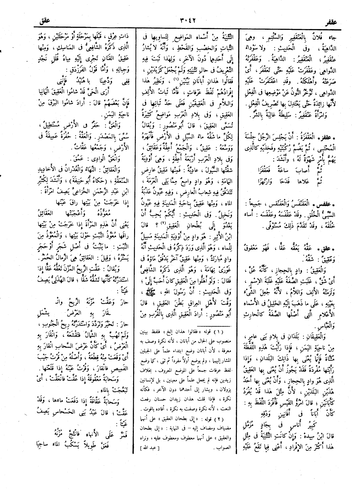 ( * قوله « فقالوا هذان إلخ » فلفظ بينين منصوب على الحال من أَبانان لأنه نكرة وصف به معرفة لأن أَبانان وضع ابتداء علماً على الجبلين المشار إليهما ولم يوضع أَولاً مفرداً ثم ثني كما وضع لفظ عرفات جمعاً على الموضع المعروف بخلاف زيدين فإنه لم يجعل علماً على معينين بل لإنسانين يزولان ويشار إلى أحدهما دون الآخرفكأنه نكرة فإذا قلت هذان زيدان حسنان رفعت النعت لأنه نكرة وصفت به نكرة أفاده ياقوت ) ونظير هذا إفرادهم لفظ عرفات فأَما ثبات الأَلف واللام في العَقِيقَيْن فعلى حدِّ ثباتهما في العَقِيق وفي بلاد العرب مواضع كثيرة تسمى العَقِيقَ قال أَبو منصور ويقال لكل ما شَقَّه ماء السيل في الأَرض فأَنهره ووسَّعه عَقِيق والجمع أَعِقَّةٌ وعَقَائِق وفي بلاد العرب أَربعةُ أَعِقَّةَ وهي أَودية شقَّتها السيول عادِيَّة فمنها عَقيقُ عارضِ اليمامةِ وهو وادٍ واسع مما يلي العَرَمة تتدفق فيه شِعابُ العارِض وفيه عيون عذبة الماء ومنها عَقِيقٌ بناحية المدينة فيه عيون ونخيل وفي الحديث أَيكم يجب أَن يَغْدُوَ إِلى بُطْحانِ العَقِيقِ ؟ قال ابن الأَثير هو وادٍ من أَودية المدينة مسيل للماء وهو الذي ورد ذكره في الحديث أَنه وادٍ مبارك ومنها عَقِيقٌ آخر يَدْفُق ماؤُه في غَوْرَي تِهَامةَ وهو الذي ذكره الشافعي فقال ولو أَهَلُّوا من العَقِيقِ كان أَحَبَّ إِليّ وفي الحديث أَن رسول الله صلى الله عليه وسلم وقَّتَ لأَهل العِراق بطن العَقِيقِ قال أَبو منصور أَراد العَقِيقَ الذي بالقرب من ذات عِرْقٍ قبلها بمَرْحلة أَو مرحلتين وهو الذي ذكره الشافعي في المناسك ومنها عَقِيق القَنَانِ تجري إِليه مياه قُلَلِ نجد وجباله وأَما قول الفرزدق قِفِي ودِّعِينَا يا هُنَيْدُ فإِنَّني أَرى الحيَّ قد شامُوا العَقِيقَ اليمانيا فإِن بعضهم قال أَراد شاموا البرق من ناحية اليمن والعَقّ حفر في الأَرض مستطيل سمي بالمصدر والعَقَّةُ حفرة عميقة في الأَرض وجمعها عَقَّات وانْعَقَّ الوادي عَمُقَ والعقائق النِّهَاء والغدرانُ في الأَخاديد المُنْعَقَّةِ حكاه أَبو حنيفة وأَنشد لكثير بن عبد الرحمن الخزاعي يصف امرأَة إِذا خرجَتْ من بيتها راق عَيْنَها مُعَِوِّذه وأَعْجَبَتْها العَقَائِقُ يعني أَن هذه المرأَة إِذا خرجت من بيتها راقَها مُعَوَّذ النبت حول بيتها والمُعَوَّذ من النبت ما ينبت في أَصل شجر يستره وقيل العقائق هي الرمال الحمر ويقال عَقَّت الريحُ المُزْنَ تَعُقُّه عَقاًّ إِذا استدَرَّتْه كأَنها تشقه شقّاً قال الهذلي يصف غيثاً حارَ وعَقَّتْ مُزْنَهُ الريحُ وانْ قَارَ بِهِ العَرْضُ ولم يُشْمَلِ حارَ تحيَّر وتردد واستَدَرَّته ريح الجَنوب ولم تهب به الشَّمال فتَقْشَعَه وانْقَارَ به العَرْضُ أَي كأَن عرضَ السحاب انْقارَ بهِ أَي وقعت منه قطعة وأَصله من قُرْتُ جَيْب القميص فانْقار وقُرْتُ عينه إِذا قلعتها وسحبة مَعْقُوقة إِذا عُقَّت فانْعَقَّت أَي تَبَعَّجت بالماء وسحابة عَقَّاقة إِذا دفعت ماءها وقد عَقَّت قال عبدُ بني الحَسْحاص يصف غيثاً فمرَّ على الأَنهاء فانْثَجَّ مُزْنُه فَعَقَّ طويلاً يَسْكُبُ الماءَ ساجِيَا