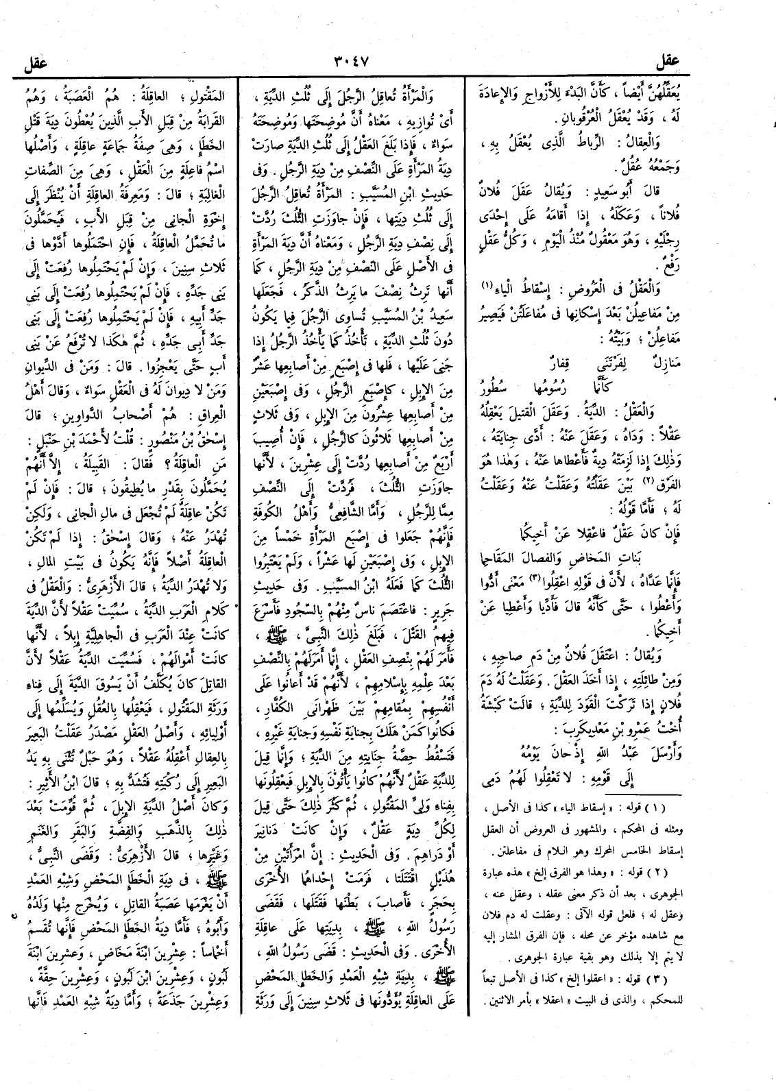 ( * قوله « اسقاط الياء » كذا في الأصل ومثله في المحكم والمشهور في العروض ان العقل اسقاط الخامس المحرك وهو اللام من مفاعلتن ) من مَفاعِيلُنْ بعد إِسكانها في مُفاعَلَتُنْ فيصير مَفاعِلُنْ وبيته مَنازِلٌ لفَرْتَنى قِفارٌ كأَنَّما رسُومُها سُطور والعَقْلُ الديَة وعَقَلَ القَتيلَ يَعْقِله عَقْلاً وَدَاهُ وعَقَل عنه أَدَّى جِنايَته وذلك إِذا لَزِمَتْه دِيةٌ فأَعطاها عنه وهذا هو الفرق