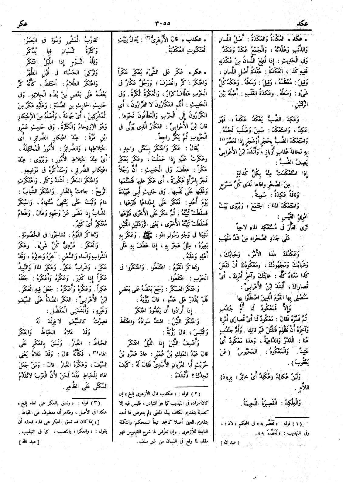 ( عكر ) عَكَر على الشيء يَعْكِرُ عَكْراً واعتَكر كَرَّ وانصرف ورجل عَكَّارٌ في الحرب عطّاف كرّار والعَكْرة الكَرّة وفي الحديث أَنتم العَكّارُون لا الفرّارون أَي الكَرّارون إِلى الحَرْب والعطّافون نحوها قال ابن الأَعرابي العَكّار الذي يُوَلِّي في الحروب ثم يَكُرُّ راجعاً يقال عَكَرَ واعْتَكَر بمعنى واحد وعَكَرْت عليه إِذا حَمَلْت وعَكَرَ يَعْكِرُ عَكْراً عطَفَ وفي الحديث أَن رجلاً فَجر بامرأَة عَكْوَرةً أَي عَكَرَ عليها فتَسَنَّمها وغَلَبَها على نفسها وفي حديث أَبي عبيدة يوم أُحُدٍ فَعَكَرَ على إِحداهما فنزَعَها فسَقَطَتْ ثَنيَّتُه ثم عكَرَ على الأُخرى فنزعها فسقطت ثنيتُه الأُخرى يعني الزِّرَدَتَيْن اللتين نَشِبَتا في وجه رسول الله صلى الله عليه وسلم وعَكَرَ به بَعِيرُه مثل عَجَرَ به إِذا عطف به على أَهله وغلَبَه وتعاكَرَ القومُ اخْتَلَطُوا واعْتَكَروا في الحرب اختلطوا واعْتَكَرَ العَسْكَرُ رجع بعضه على بعض فلم يُقْدَرْ على عَدِّه قال رؤبة إِذا أَرادُوا أَن يَعُدّوه اعْتَكَرْ واعْتَكَرَ الليل اشتد سواده واختلط والتبس قال رؤبة وأَعْسِف الليلَ إِذا اللَّيْلُ اعْتَكَرْ قال عبد الملك بن عمير عاد عمرو بن حُرَيْث أَبا العُرْيان الأَسدي فقال له كيف تجدك ؟ فأَنشده تَقارُبُ المَشْي وسُوءٌ في البَصْر وكَثْرةُ النِّسْيان فيما يُدَّكَرْ وقلّةُ النوم إِذا اللّيلُ اعْتَكَرْ وتَرْكِيَ الحَسْناءَ في قُبْل الطُّهَرْ واعْتَكَر الظلامُ اختلط كأَنه كرّ بعضُه على بعض من بُطْء انجلائه وفي حديث الحرث بن الصِّمّة وعليه عَكَرٌ من المشركين أَي جماعة وأَصله من الاعْتِكار وهو الازدحام والكثرة وفي حديث عمرو ابن مُرّة عند اعْتِكارِ الضرائر أَي اختلاطِها والضرائرُ الأُمورُ المختلفة أَي عند اختلاط الأُمور ويروى عند اعتكال الضرائر وسنذكره في موضعه واعْتَكَر المطر اشتدّ وكَثُر واعْتَكَرت الريحُ جاءت بالغبار واعْتَكر الشَّبابُ دام وثبت حتى ينتهي منتهاه واسْبَكَرَّ الشَّبابُ إِذا مضى عن وجهه وطالَ وطعامٌ مُعْتَكِرٌ أَي كثير وتعاكَرَ القومُ تَشاجَرُوا في الخصومة والعَكَرُ دُرْدِيُّ كلّ شيء وعَكَرُ الشرابِ والماء والدهن آخرُه وخائرُه وقد عَكِرَ وشرابٌ عَكِرٌ وعَكِرَ الماءُ والنبيذُ عَكَراً إِذا كَدِرَ وعَكَّرَه وأَعْكَرَه جعله عَكِراً وعَكَّرَه وأَعْكَرَه جعل فيه العَكَر ابن الأَعرابي العَكَرُ الصَّدَأُ على السيف وغيره وأَنشد للمفضل فصِرْت كالسَّيْفِ لا فِرِنْدَ له وقد عَلاه الخَبَاطُ والعَكَرُ الخَباطُ الغُبار ونَسَق بالعَكَرِ على الهاء