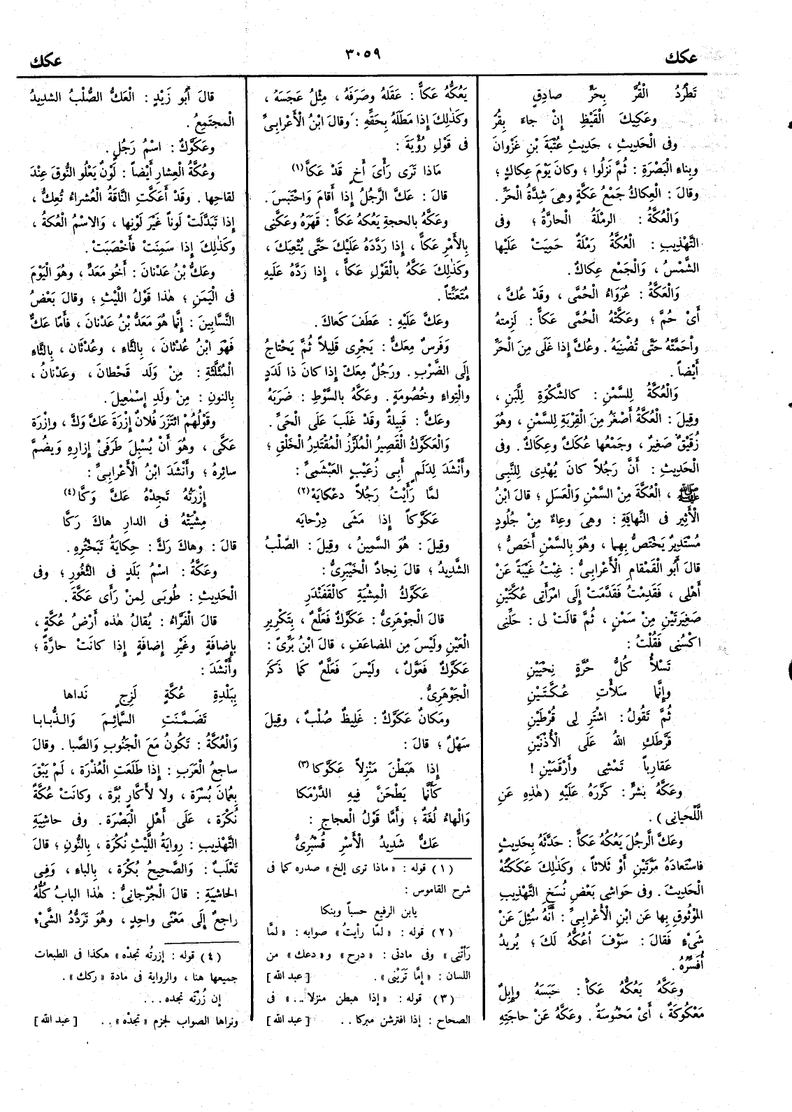 قال عَكَّ الرجلُ إذا أَقام واحْتَبَس وعَكَّه بالحجة يَعُكُّه عَكّاً قهره وعَكَّني بالأمر عَكّاً إذا ردّده عليك حتى يُتْعِبَك وكذلك عَكَّه بالقول عَكّاً إذا ردّه عليه متعنتاً وعَكَّ عليه عَطَف كَعاكَ وفرس مِعَكٌّ يجري قليلاً ثم يحتاح إلى الضرب ورجل مِعَكٌّ إذا كان ذا لَدَد والتواء وخصومة وعَكَّه بالسوط ضربه وعَكٌّ قبيلة وقد غلب على الحيّ والعَكَوَّك القصير المُلَزَّزُ المُقْتَدِرُ الخَلْقِ وأَنشد لِدَلَمٍ أَبي زُعَيْبٍ العَبْشَمِيّ لما رأَيتُ رَجُلاً دِعْكايَهْ عَكَوَّكاً إذا مشى دِرْحايَه وقيل هو السمين وقيل الصُّلب الشديد قال نِجادٌ الخَيْبَري عَكَوَّك المِشْيَةِ كالقَفَنْدَرِ قال الجوهري عَكَوَّكٌ فَعَلَّع بتكرير العين وليس من المضاعف قال ابن بري عَكَوَّكٌ فَعَوَّلٌ وليس فعَلَّع كما ذكر الجوهري ومكان عَكَوَّك غليظ صُلْب وقيل سَهْل قال إذا هَبَطْنَ مَنْزِلاً عَكَوَّكا كأَنما يَطْحَنَّ فيه الدَّرْمَكا والهاء لغة وأَما قول العجاج عَكٌّ شَدِيدُ الأَمْرِ قُسْبُرِيُّ قال أَبو زيد العَكُّ الصلب الشديد المجتمع وعَكَوَّكٌ اسم رجل وعُكَّةُ العِشارِ أَيضاً لَوْنٌ يعلو النُّوق عند لِقاحها وقد أَعَكَّتِ الناقةُ العُشَراء تُعِكُّ إذا تبدَّلت لوناً غير لونها والإسم العُكّة وكذلك إذا سمنت فأخصبت وعَكُّ بن عَدْنان أَخو مَعَدٍّ وهو اليوم في اليمن هذا قول الليث وقال بعض النسابين إنما هو مَعَدُّ بن عدنان فأما عَكُّ فهو ابن عُدْثان بالثاء وعدثان بالثاء المثلثة من ولد قحطان وعدنان بالنون من ولد إسمعيل وقولهم ائتَزَرَ فلانٌ إزْرةَ عَكَّ وَكَّ وإزْرَة عَكَّى وهو أَن يُسْبِل طَرَفَيْ إزاره ويضم سائره وأَنشد ابن الأَعرابي إزْرَتُه تَجِدْهُ عَكَّ وَكَّا مِشْيَتُه في الدار هاكَ رَكَّا