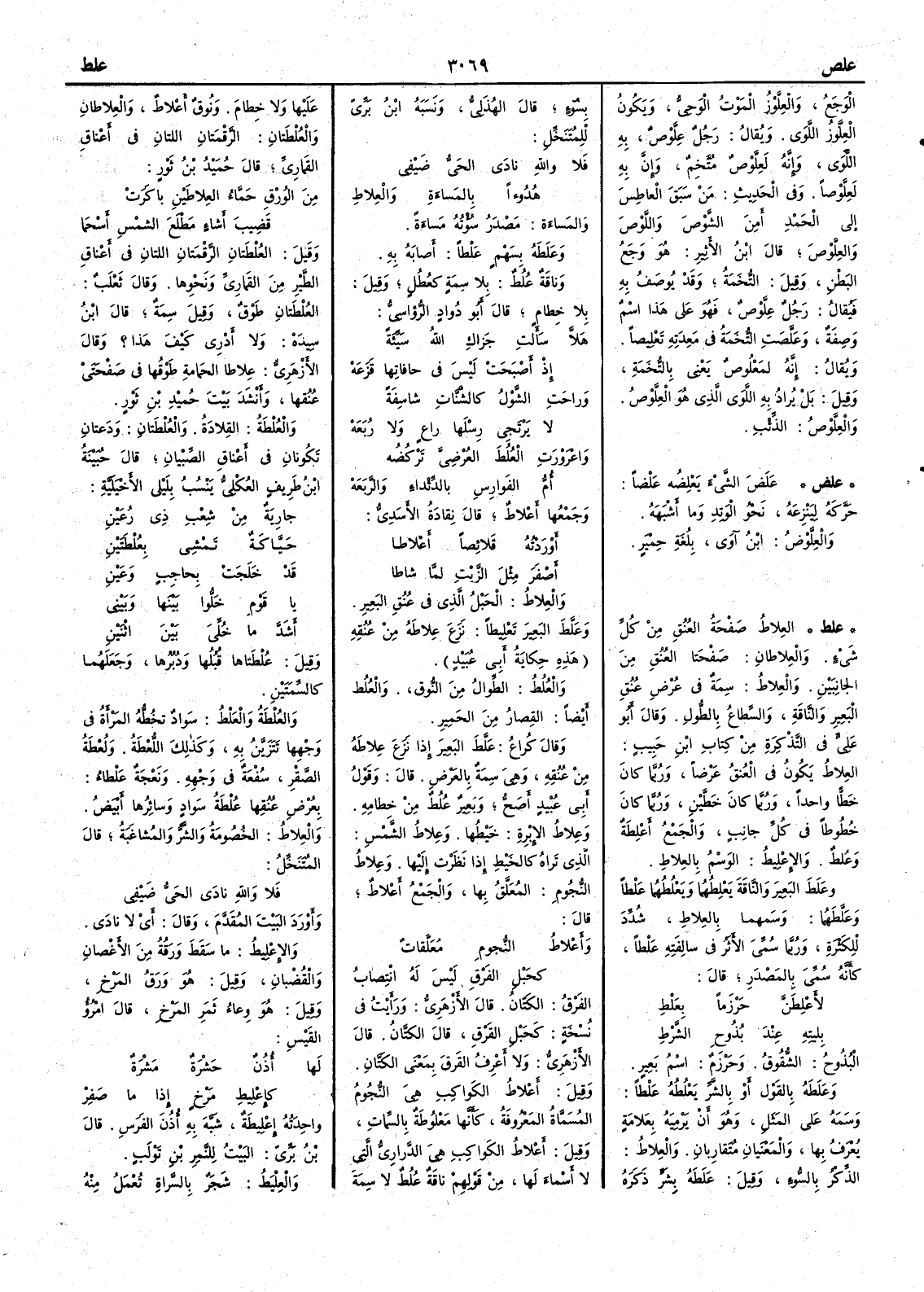 الوجعُ والعِلَّوْزُ الموتُ الوَحِيُّ ويكون العِلَّوْزُ اللَّوَى ويقال رجل عِلَّوْصٌ به اللَّوَى وإِنه لَعِلَّوْصٌ مُتَّخِمٌ وإِن به لَعِلَّوْصاً وفي الحديث من سَبَقَ العاطِسَ إِلى الحمد أَمِنَ الشَّوْصَ واللَّوْصَ والعِلَّوْصَ قال ابن الأَثير هو وجعُ البطن وقيل التُّخَمةُ وقد يوصف به فيقال رجل عِلَّوْصٌ فهو على هذا اسم وصفة وعَلَّصَت التُّخَمةُ في معدته تَعْلِيصاً ويقال إِنه لمَعْلُوصٌ يعني بالتُّخَمة وقيل بل يُرادُ به اللَّوَى الذي هو العِلَّوص والعِلَّوْصُ الذئب ( علض ) عَلَضَ الشيءَ يَعْلِضُه عَلْضاً حرَّكه ليَنْزِعَه نحو الوتد وما أَشْبهه والعِلَّوْضُ ابنُ آوَى بلغة حمير ( علط ) العِلاطُ صفْحة العُنق من كل شيء والعِلاطانِ صفحتا العنق من الجانبين والعِلاطُ سِمة في عُرْض عنق البعير والناقة والسِّطاعُ بالطُّولِ وقال أَبو علي في التذكرة من كتاب ابن حبيب العِلاط يكون في العنق عَرْضاً وربما كان خطّاً واحداً وربما كان خطَّين وربما كان خُطوطاً في كل جانب والجمع أَعْلِطةٌ وعُلُطٌ والإِعْلِيطُ الوَسْمُ بالعِلاطِ وعَلَطَ البعيرَ والناقةَ يَعْلِطُهما ويَعْلُطُهما عَلْطاً وعَلَّطَهما وسَمهما بالعِلاطِ شُدّد للكثرة وربما سمي الأَثر في سالِفتِه عَلْطاً كأَنه سمي بالمصدر قال لأَعْلِطَنَّ حَرْزَماً بعَلْطِ بِلِيتِه عند بُذُوحِ الشَّرْطِ البُذُوحُ الشُّقوقُ وحَرْزَمٌ اسم بعير وعَلَطه بالقول أَو بالشرِّ يَعْلُطُه عَلْطاً وسمَه على المثل وهو أَن يرميه بعلامة يعرف بها والمعنيان متقاربان والعِلاطُ الذكر بالسُّوء وقيل عَلَطه بشرّ ذكره بسوء قال الهذلي ونسبه ابن بري للمتنخل فَلا واللّهِ نادَى الحَيُّ ضَيْفِي هُدُوءاً بالمَساءةِ والعِلاطِ والمَساءةُ مصدر سُؤْتُه مَساءة وعَلَطه بسَهْم عَلْطاً أَصابه به وناقة عُلُطٌ بلا سمة كعُطُلٍ وقيل بلا خِطام قال أَبو دواد الرُّؤاسي هلاَّ سأَلتِ جَزاك اللّه سَيِّئةً إِذ أَصْبحَت ليس في حافاتِها قَزَعَهْ وراحت الشَّول كالشَّنّات شاسِفةً لا يَرْتجي رِسْلَها راعٍ ولا رُبَعَهْ واعرَورتِ العُلُطَ العُرْضِيَّ تَركُضُه أُمُّ الفَوارِسِ بالدِّئْداء والرَّبَعَهْ وجمعها أَعْلاطٌ قال نِقادةُ الأَسدي أَوْرَدْتُه قَلائصاً أَعْلاطا أَصفرَ مثل الزيت لما شاطا والعِلاط الحبل الذي في عنق البعير وعَلَّطَ البعير تَعْليطاً نزع عِلاطَه من عُنقه هذه حكاية أَبي عبيد والعُلُطُ الطِّوال من النوق والعُلُط أَيضاً القِصار من الحَمير وقال كراع عَلَّط البعير إِذا نزَع عِلاطَه من عُنقه وهي سِمةٌ بالعَرْض قال وقول أَبي عبيد أَصح وبعير علط من