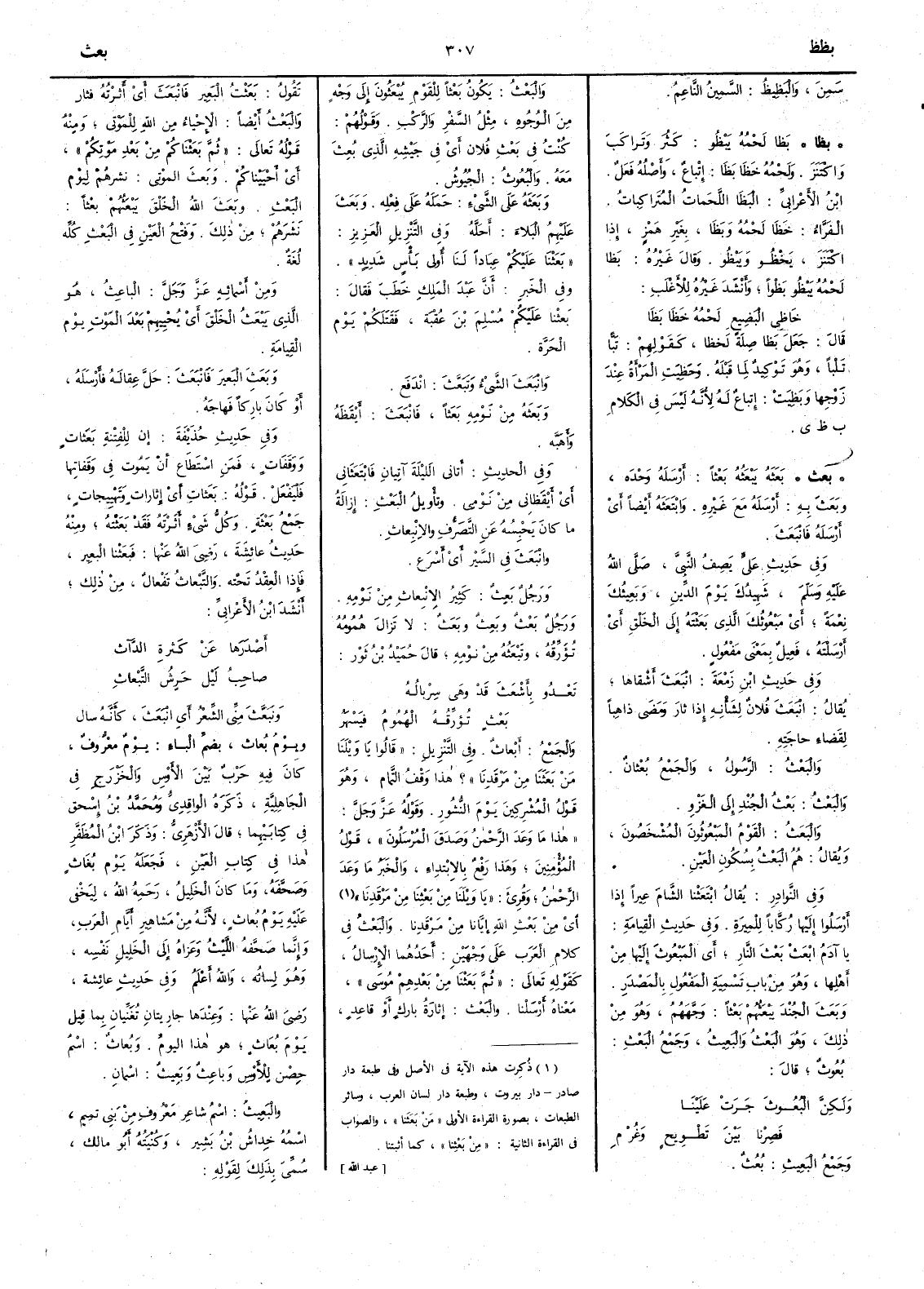 ( بعث ) بَعَثَهُ يَبْعَثُه بَعْثاً أَرْسَلَهُ وَحْدَه وبَعَثَ به أَرسله مع غيره وابْتَعَثَه أَيضاً أَي أَرسله فانْبعَثَ وفي حديث عليّ يصف النبي صلى الله عليه وسلم شَهِيدُك يومَ الدين وبَعِيثُك نعْمة أَي مَبْعُوثك الذي بَعَثْته إِلى الخَلْق أَي أَرسلته فعيل بمعنى مفعول وفي حديث ابن زَمْعَة انْبَعَثَ أَشْقاها يقال انْبَعَثَ فلانٌ لشأْنه إِذا ثار ومَضَى ذاهباً لقضاء حاجَته والبَعْثُ الرسولُ والجمع بُعْثانٌ والبَعْثُ بَعْثُ الجُنْدِ إِلى الغَزْو والبَعَثُ القومُ المَبْعُوثُونَ المُشْخَصُونَ ويقال هم البَعْثُ بسكون العين وفي النوادر يقال ابْتَعَثْنا الشامَ عِيراً إِذا أَرسَلوا إِليها رُكَّاباً للميرة وفي حديث القيامة يا آدمُ ابْعَثْ بَعْثَ النار أَي المَبْعُوث إِليها من أَهلها وهو من باب تسمية المفعول بالمصدر وبَعَثَ الجُنْدَ يَبْعَثُهم بَعْثاً وجَّهَهُمْ وهو من ذلك وهو البَعْثُ والبَعِيثُ وجمع البَعْثِ بُعُوث قال ولكنَّ البُعُوثَ جَرَتْ علينا فَصِرْنا بينَ تَطْوِيحٍ وغُرْمِ وجمع البَعِيثِ بُعُثٌ والبَعْثُ يكون بَعْثاً للقوم يُبْعَثُون إِلى وَجْهٍ من الوجوه مثل السَّفْر والرَّكْب وقولهم كنتُ في بَعْثِ فلانٍ أَي في جيشه الذي بُعِثَ معه والبُعُوثُ الجُيوش وبَعَثَه على الشيء حمله على فِعْله وبَعَثَ عليهم البَلاء أَحَلَّه وفي التنزيل العزيز بَعَثْنا عليكم عِباداً لنا أُولي بأْس شديد وفي الخبر أَنَّ عبد المَلِك خَطَبَ فقال بَعَثْنا عليكم مُسلِمَ بن عُقْبة فَقَتلَكم يوم الحَرَّة وانْبَعَثَ الشيءُ وتَبَعَّثَ انْدَفَع وبَعَثَه من نَوْمه بَعَثاً فانْبَعَثَ أَيْقَظَه وأَهَبَّه وفي الحديث أَتاني الليلةَ آتِيانِ فابْتَعَثَاني أَي أَيقَظاني من نومي وتأْويلُ البَعْثِ إِزالةُ ما كان يَحْبِسُه عن التَّصَرُّف والانْبِعاثِ وانْبَعَثَ في السَّيْر أَي أَسْرَع ورجلٌ بَعِثٌ كثير الانْبِعاثِ من نومه ورجل بَعْثٌ وبَعِثٌ وبَعَثٌ لا تزال هُمُومه تؤَرِّقُه وتَبْعَثُه من نومه قال حُمَيْدُ بن ثَوْر تَعْدُو بأَشْعَثَ قد وَهَى سِرْبالُه بَعْثٍ تُؤَرِّقُه الهُمُوم فيَسْهَرُ والجمع أَبْعاث وفي التنزيل قالوا يا وَيْلَنا مَنْ بَعَثَنا من مَرْقَدِنا ؟ هذا وَقْفُ التَّمام وهو قول المشركين يوم النُّشور وقولُه عز وجل هذا ما وَعَدَ الرحمنُ وصَدَقَ المُرْسَلون قَوْلُ المؤْمِنين وهذا رَفْعٌ بالابتداء والخَبَرُ ما وَعَدَ الرحمنُ وقرئ يا وَيْلَنا مَنْ بَعَثَنا مِن مَرْقَدِنا ؟ أَي مِن بَعْثِ الله إِيَّانا من مَرْقَدِنا والبَعْثُ في كلام العرب على وجهين أَحدهما الإِرْسال كقوله تعالى ثم بَعَثْنا من بعدهم موسى معناه أَرسلنا والبَعْثُ إِثارةُ باركٍ أَو قاعدٍ تقول بَعَثْتُ البعير فانبَعَثَ أَي أَثَرْتُه فَثار والبَعْثُ أَيضاً الإِحْياء منالله للمَوْتى ومنه قوله تعالى ثم بَعَثْناكم من بَعْدِ موتِكم أَي أَحييناكم وبَعَثَ اللمَوْتى نَشَرَهم ليوم البَعْثِ وبَعَثَ اللهُ الخَلْقَ يَبْعَثُهُم بَعْثاً نَشَرَهم من ذلك وفتح العين في البعث كله لغة ومن أَسمائه عز وجل الباعِثُ هو الذي يَبْعَثُ الخَلْقَ أَي يُحْييهم بعد الموت يوم القيامة وبَعَثَ البعيرَ فانْبَعَثَ حَلَّ عِقالَه فأَرسله أَو كان باركاً فَهاجَهُ وفي حديث حذيفة إِنَّ للفِتْنةِ بَعَثاتٍ ووَقَفاتٍ فمن اسْتَطاعَ أَن يَمُوتَ في وَقَفاتِها فَلْيَفعل قوله بَعَثات أَي إِثارات وتَهْييجات جمع بَعْثَةٍ وكلُّ شيء أَثَرْته فقد بَعَثْته ومنه حديث عائشة رضي الله عنها فبَعَثْنا البَعيرَ فإِذا العِقْدُ تحته والتَّبْعاثُ تَفْعال مِن ذلك أَنشد ابن الأَعرابيّ أَصْدَرها عن كَثْرَةِ الدَّآثِ صاحبُ لَيْلٍ حَرِشُ التَّبْعاثِ وتَبَعَّثَ مني الشِّعْرُ أَي انْبَعَثَ كأَنه سالَ ويومُ بُعاثٍ بضم الباء يوم معروف كان فيه حرب بين الأَوْسِ والخَزْرج في الجَاهلية ذكره الواقدي ومحمد بن إِسحق في كتابيهما قال الأَزهري وذك