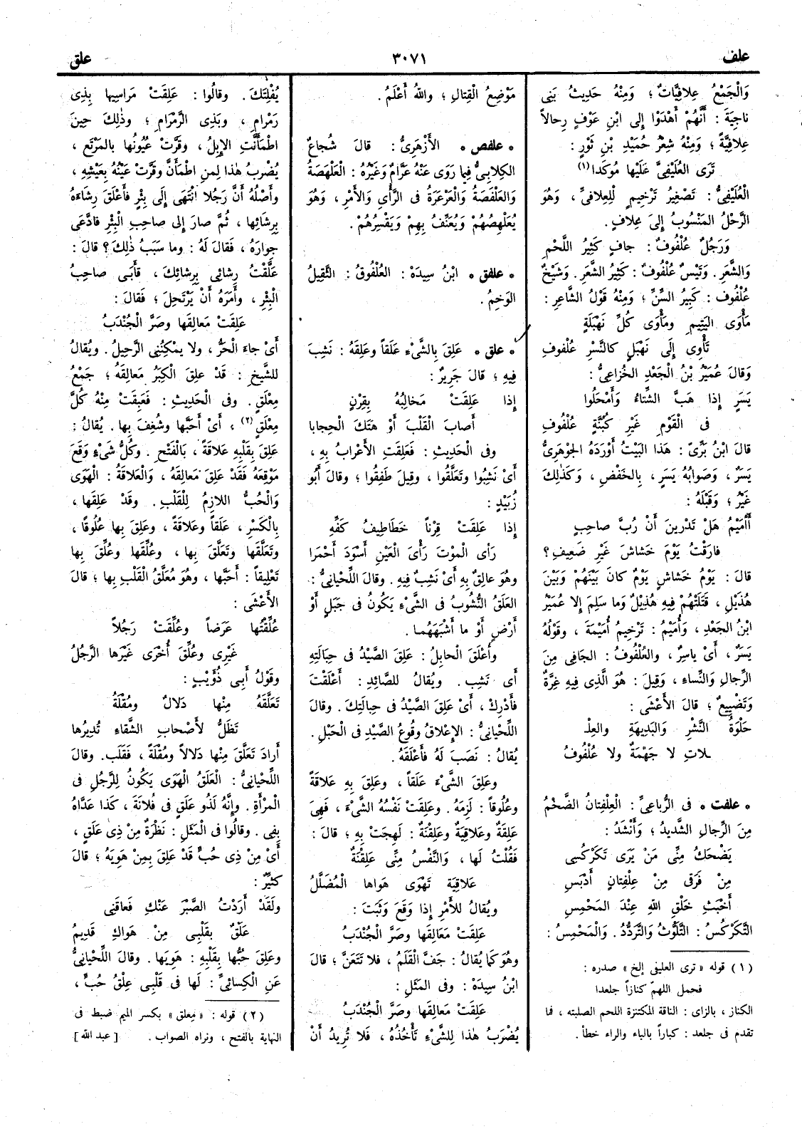 ( * قوله « عمير بن الجعد » كذا هو هنا بالتصغير وقدّمه قريباً مكبراً ) وأُميم ترخيم أُمية وقوله يَسَر أَي ياسِر والعُلْفوف الجافي من الرجال والنساء وقيل هو الذي فيه غِرّة وتَضْيِيع قال الأَعشى حُلْوة النَّشْر والبَديهة والعلْ لات لا جَهْمة ولا عُلْفُوف ( علفت ) في الرباعي العِلْفِتانُ الضَّخْم مِن الرجال الشديد وأَنشد يَضْحَكُ مني مَنْ يَرَى تَكَرْكُسِي مِنْ فَرَقي من عِلْفِتانٍ أَدْبَسِ أَخْبَثِ خَلْقِ اللهِ عِنْدَ المَحْمِس التَّكَرْكُسُ التَّلَوُّثُ والتَّرَدُّدُ والمَحْمِسُ موضِع القِتالِ والله أَعلم ( علفص ) الأَزهري قال شُجاع الكلابي فيما رَوى عنه عَرّام وغيره العَلْهَصةُ والعَلْفَصةُ والعَرْعَرةُ في الرأْي والأَمرِ وهو يُعَلْهِصُهم ويُعَنِّفُ بهم ويَقْسِرُهم ( علفق ) ابن سيده العُلْفُوق الثقيل الوَخِمُ ( علق ) عَلِقَ بالشيءِ عَلَقاً وعَلِقَهُ نَشِب فيه قال جرير إِذا عَلِقَتْ مُخَالبُهُ بِقْرْنٍ أَصابَ القَلْبَ أَو هَتَك الحِجابا وفي الحديث فَعَلِقَت الأَعراب به أَي نَشِبوا وتعلقوا وقيل طَفِقُوا وقال أَبو زبيد إِذا عَلِقَتْ قِرْناً خَطَاطيفُ كَفِّهِ رأَى الموتَ رَأْيَ العينِ أَسودَ أَحمرا وهو عالِقٌ به أَي نَشِبٌ فيه وقال اللحياني العَلَقُ النُّشوب في الشيء يكون في جبل أَو أَرض أَو ما أَشبهها وأَعْلَقَ الحابلُ عَلِق الصيدُ في حِبَالته أَي نَشِب ويقال للصائد أَعْلَقْتَ فأَدْرِكْ أَي عَلِقَ الصيدُ في حِبالتك وقال اللحياني الإِعْلاقُ وقوع الصيد في الحبل يقال نَصَب له فأَعْلقه وعَلِقَ الشيءَ عَلَقاً وعَلِقَ به عَلاقَةً وعُلوقاً لزمه وعَلِقَتْ نفُسه الشيءَ فهي عَلِقةٌ وعَلاقِيةٌ وعَلِقْنَةٌ لَهِجَتْ به قال فقلت لها والنَّفْسُ منِّي عَلِقْنَةٌ عَلاقِيَةٌ تَهْوَى هواها المُضَلَّلُ ويقال للأَمر إِذا وقع وثبت عَلِقَتْ مَعَالِقَها وصَرَّ الجُنْدَبُ وهو كما يقال جفَّ القلم فلا تَتَعَنَّ قال ابن سيده وفي المثل عَلِقَتْ مَعالِقَها وصَرَّ الجُنْْدب يضرب هذا للشيء تأْخذه فلا تريد أَن يُفْلِِتَكَ وقالوا عَلِقَتْ مَراسِبها بذي رَمْرامِ وبذي الرَّمْرَام وذلك حين اطمأَنت الإبل وقَرَّت عيونها بالمرتع يضرب هذا لمن اطمأَنَّ وقَرَّتْ عينه بعيشه وأَصله أَنَّ رجلاً انتهى إِلى بئر فأَعْلَقَ رِشَاءَه بِرِشَائِها ثم صار إِلى صاحب البئر فادَّعَى جِوارَه فقال له وما سبب ذلك ؟ قال عَلَّقْت رِشائي برِشائكَ فأَبى صاحب البئر وأَمره أَن يرتحل فقال عَلُِقَتْ مَعالقَها صَرَّ الجُنْدب أَي جاءَ الحرُّ ولا يمكنني الرحيل ويقال للشيخ قد عَلِقَ الكِبَرُ مَعَالقَهُ جمع مِعْلَقٍ وفي الحديث فَعَلِقتْ منه كلَّ معْلق أَي أَحبها وشُغِفَ بها يقال عَلِقَ بقليه عَلاقةً بالفتح وكلُّ شيءٍ وقع مَوْقِعه فقد عَلِقَ مَعَالِقَه والعَلاقة الهوى والحُبُّ اللازم للقلب وقد عَلِقَها بالكسر عَلَقاً وعَلاقةً وعَلِقَ بها عُلوقاً وتَعَلَّقها وتَعَلَّقَ بها وعُلِّقَها وعُلِّق بها تَعْلِيقاً أَحبها وهو مُعَلِّقُ القلب بها قال الأَعشى عُلِّقْتُها عَرَضاً وعُلِّقَتْ رجلاً غَيْري وعُلِّقَ أُخْرَى غَيْرها الرجلُ وقول أَبي ذؤَيب تَعَلَّقَهُ منها دَلالٌ ومُقْلَةٌ تَظَلُّ لأَصحاب الشَّقاءِ تُديرُها أَراد تَعَلَّقَ منها دَلالاً ومُقْلةً فقلب وقال اللحياني العَلَقُ الهوى يكون للرجل في المرأَة وإنه لذو عَلَقٍ في فلانة كذا عدَّاه بفي وقالوا في المثل نَظْرةٌ من ذي عَلَقٍ أَي من ذي حُبّ قد عَلِقَ بمن هويه قال كثيِّر ولقد أَرَدْتُ الصبرَ عنكِ فعاقَني عَلَقٌ بقَلْبي من هَواكِ قديمُ وعَلِقَ حبُّها بقلبه هَوِيَها وقال اللحياني عن الكسائي لها في قلبي عِلْقُ حبٍّ