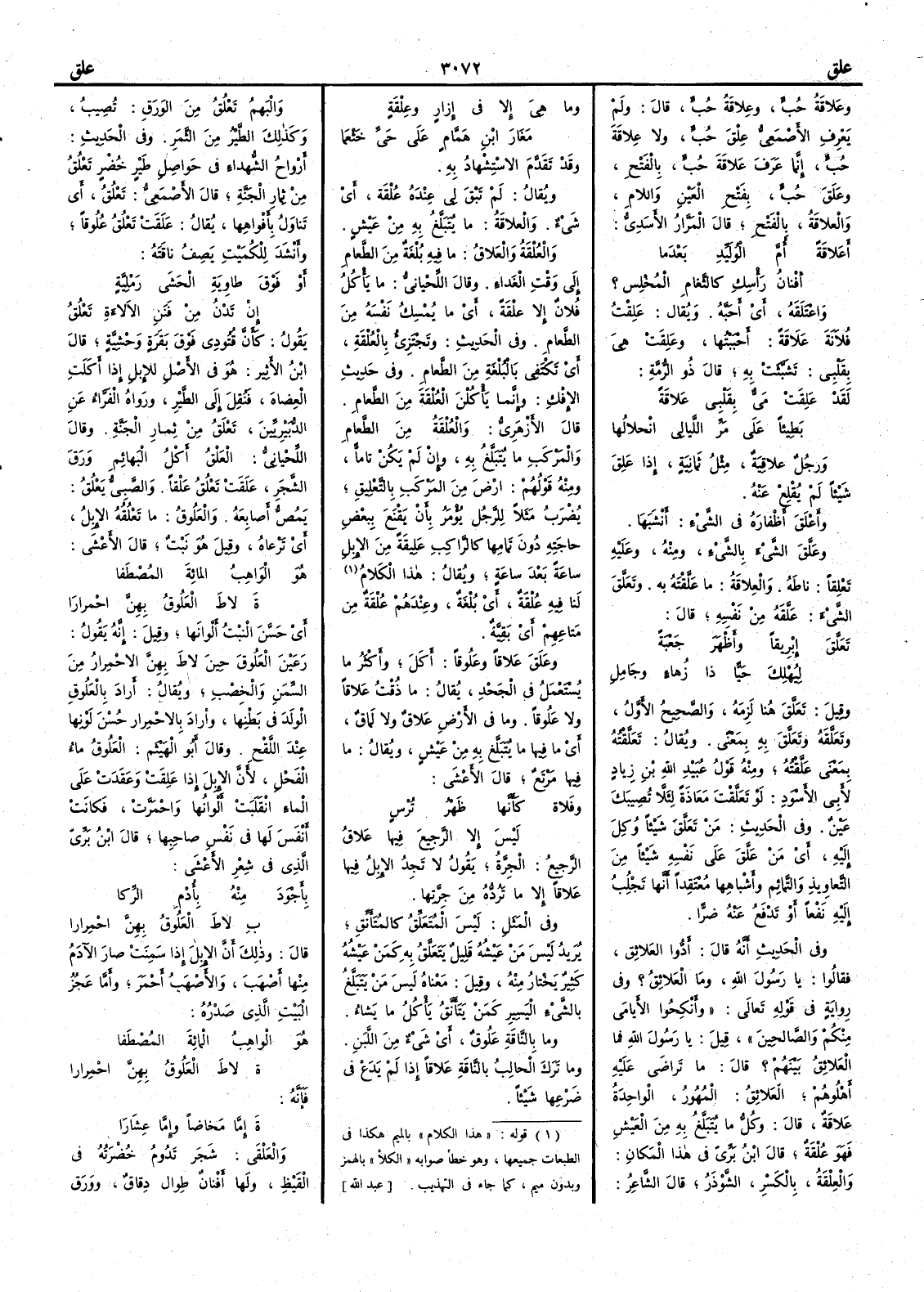 وعَلاقَةُ حُبٍّ وعِلاقَةُ حبٍّ قالك ولم يعرف الأَصمعي عِلْق حب ولا عِلاقةَ حبٍّ إِنما عرف عَلاقَةَ حُب بالفتح وعَلَق حبٍّ بفتح العين واللام والعَلاقَةُ بالفتح قال المرار الأَسدي أَعَلاقَةً أُمَّ الوُلَيِّدِ بعدما أَفْنانُ رأْسِكِ كالثَّغامِ المُخْلِس ؟ واعْتَلَقَهُ أَي أَحبه ويقال عَلِقْتُ فلانةَ عَلاقةً أَحببتها وعَلِقَتْ هي بقلبي تشبثت به قال ذو الرمة لقد عَلِقَتْ مَيٌّ بقلبي عَلاقةً بَذطِيئاً على مَرِّ الليالي انْحِلالُها ورجل علاقِيَةٌ مثل ثمانية إِذا عَلِقَ شيئاً لم يُقْلِعْ عنه وأَعْلَقَ أَظفارَه في الشيء أَنشَبها وعَلَّقَ الشيءَ بالشيء ومنه وعليه تَعْليقاً ناطَهُ والعِلاقةُ ما عَلَّقْتَه به وتَعَلَّقَ الشيءَ عَلقَهُ من نفسه قال تَعَلَّقَ إِبريقاً وأَظْهَرَ جَعْبةً ليُهْلِكَ حَيّاً ذا زُهاءٍ وجَامِلِ وقيل تَعَلَّق هنا لزمه والصحيح الأَول وتَعَلَّقَهُ وتَعَلَّق به بمعنى ويقال تَعَلَّقْتَهُ بمعنى عَلَّقْتُهُ ومنه قول عبيد الله بن زياد لأَبي الأَسود لو تَعَلَّقْتَ مَعَاذَةً لئلا تصيبك عين وفي الحديث من تَعَلَّق شيئاً وكِلَ إِليه أَي من عَلَّقَ على نفسه شيئاً من التعاويذ والتَّمائم وأَشباهها معتقداً أَنها تَجْلُب إِليه نفعاً أَو تدفع عنه ضرّاً وفي الحديث أَنه قال أَدُّوا العَلائِقَ قالوا يا رسول الله وما العَلائِقُ ؟ وفي رواية في قوله تعالى وأَنكحوا الأَيامَى منكم والصالحين قيل يا رسول الله فما العَلائِقُ بينهم ؟ قال ما تَرَاضَى عليه أَهْلُوهُم العَلائِقُ المُهُور الواحدة عَلاقَةٌ قال وكلُّ ما يُتَبَلَّغُ به من العيش فهو عُلْقةٌ قال ابن بري في هذا المكان والعِلْقةُ بالكسر الشَّوْذَرُ قال الشاعر وما هي إِلاَّ في إزارٍ وعِلْقَةٍ مَغَارَ ابنِ هَمَّامٍ على حَيٍّ خثعما وقد تقدم الاستشهاد به ويقال لم تبق لي عنده عُلْقةٌ أَي شيءٌ والعَلاقةُ ما يُتبلغ به من عيش والعُلْقةُ والعَلاقُ ما فيه بُلْغة من الطعام إِلى وقت الغذاء وقال اللحياني ما يأْكل فلان إِلا عُلْقَةً أَي ما يمسك نفسه من الطعام وفي الحديث وتَجْتَزِئُ بالعُلْقَةِ أَي تكتفي بالبُلْغةِ من الطعام وفي حديث الإفك وإِنما يأْكلْنَ العُلْقةَ من الطعام قال الأَزهري والعُلْقةُ من الطعام والمركبِ ما يُتَبَلَّغُ به وإِن لم يكن تامّاً ومنه قولهم ارْضَ من المَرْكب بالتَّعْلِيقِ يضرب مثلاً للرجل يُؤْمَرُ بأَن يقنع ببعض حاجته دون تمامها كالراكب عَلِيقةً من الإِبل ساعة بعد ساعة ويقال هذا الكلام لنا فيه عُلْقةٌ أي بلغة وعندهم عُلْقةٌ من متاعهم أَي بقية وعَلَقَ عَلاقاً وعَلوقاً أَكل وأَكثرما يستعمل في الجحد يقال ما ذقت عَلاقاً ولا عَلوقاً وما في الأَرض عَلاقٌ ولا لَماقٌ أَي ما فيها ما يتبلغ به من عيش ويقال ما فيها مَرْتَع قال الأَعشى وفَلاة كأَنّها ظَهْرُ تُرْسٍ ليسَ إِلا الرَّجِيعَ فيها عَلاقُ الرجيع الجِرَّةُ يقول لا تجد الإِبل فيها عَلاقاً إِلا ما تردُّه من جِرَّتها وفي المثل ليس المُتَعَلِّق كالمُتَأَنِّق يريد ليس مَنْ عَيشُه قليل يَتَعَلَّق به كمن عيشه كثير يختار منه وقيل معناه ليس من يَتَبَلَّغ بالشيء اليسير كمن يتأَنَّق يأْكل ما يشاء وما بالناقة عَلُوق أَي شيء من اللبن وما ترك الحالب بالناقة عَلاقاً إِذا لم يَدَعْ في ضرعها شيئاً والبَهْمُ تَعْلُق من الوَرَق تصيب وكذلك الطير من الثمر وفي الحديث أَرواح الشهداء في حواصل طير خُضْرٍ تَعْلُقُ من ثمار الجنة قال الأَصمعي تَعْلُق أَي تَناوَل بأَفواهها يقال عَلَقَتْ تَعْلُق عُلوقاً وأَنشد للكميت يصف ناقته أَو فَوْقَ طاوِيةِ الحَشَى رَمْلِيَّة إِنْ تَدْنُ من فَنَن الأَلاءَةِ تَعْلُق يقول كأَن قُتُودي فوق بقرة وحشية قال ابن الأَثير هو في الأَصل للإِبل إِذا أَكلت العِضاهَ فنقل إِلى الطير وروءاه الفراء عن الدبيريين تَعْلَق من ثمار الجنة وقال اللحياني العَلْق أَكل البهائم ورق الشجر عَلَقَتْ تَعْلُق عَلْقاً والصبي يَعْلُقُ يَم