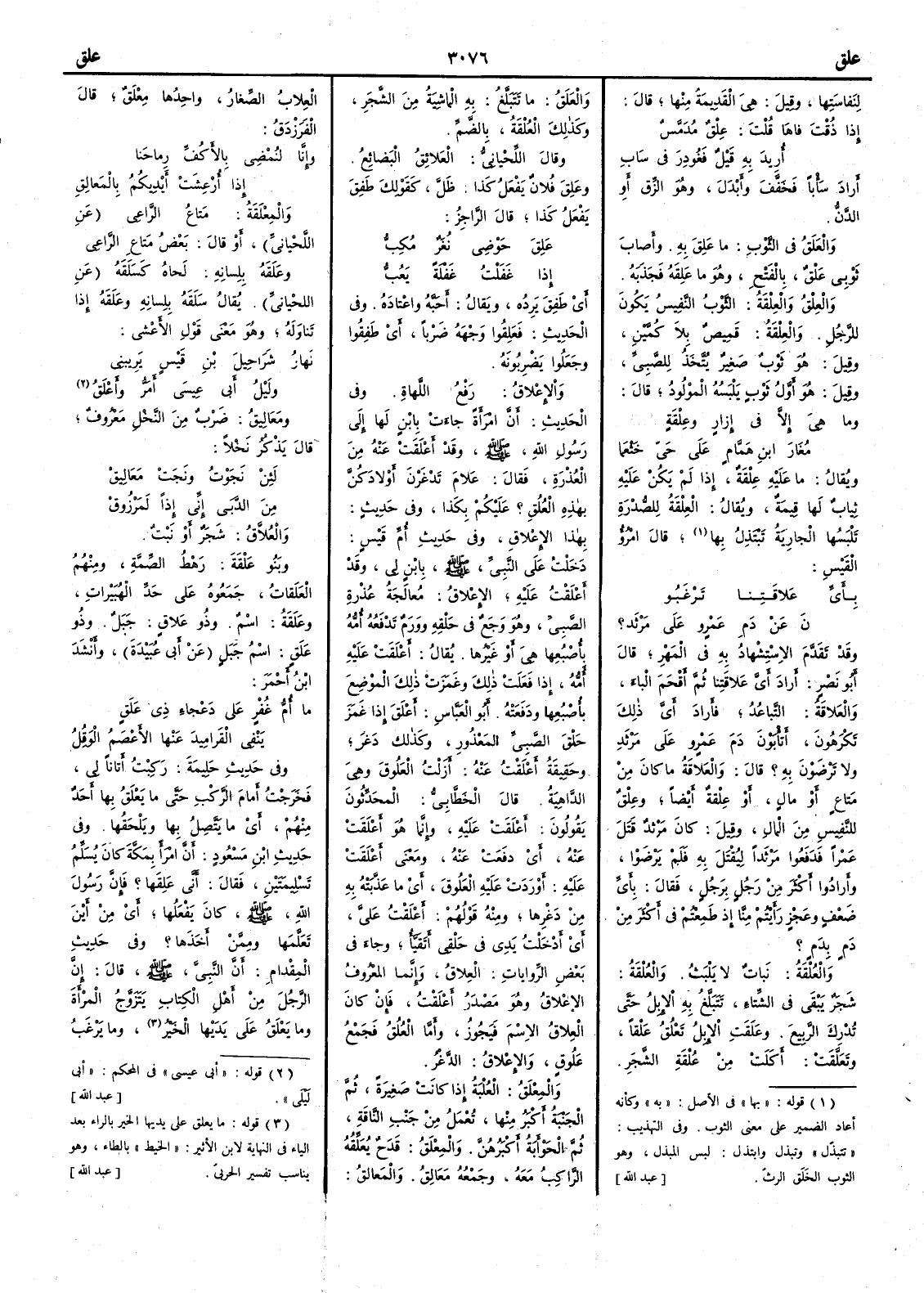 وقد تقدم الاستشهاد به في المهر قال أَبو نصر أَراد أَيَّ عَلاقتنا ثم أَقحم الباء والعَلاقة التباعد فأَراد أَيَّ ذلك تكرهون أَتأْبون دم عمرو على مرثد ولا ترضون به ؟ قال والعَلاقةُ ما كان من متاع أَو مال أَو عِلْقةٌ أَيضاً وعِلْق للنفيس من المال وقيل كان مرثد قتل عمراً فدفعوا مرثداً ليُقْتل به فلم يرضوا وأَرادوا أَكثر من رجل برجل فقال بأَيِّ ضعف وعجز رأَيتم منا إِذ طمعتم في أ َكثر من دم بدم ؟ والعُلْقة نبات لا يَلْبَثُ والعُلْقةُ شجر يبقى في الشتاء تَتَبَلَّغُ به الإِبل حتى تُدْرك الربيع وعَلَقَت الإِبل تَعْلُق عَلْقاً وتَعَلَّقت أَكلت من عُلْقةِ الشجر والعَلَقُ ما تتبلغ به الماشية من الشجر وكذلك العُلْقةُ بالضم وقال اللحياني العَلائِقُ البضائع وعَلِقَ فلانٌ يفعل كذا ظَلَّ كقولك طَفِقَ يفعل كذا فال الراجز عَلِقَ حَوْضي نُغَر مُكِبُّ إِذا غَفَلْتُ غَفْلةً يَعُبُّ أَي طَفِقَ يرِدهُ ويقال أَحبه واعتاده وفي الحديث فَعَلِقُوا وجهه ضرباً أَي طفقوا وجعلوا يضربونه والإِعْلاقُ رفع اللَّهاةِ وفي الحديث أَن امرأَة جاءت بابن لها إِلى رسول الله صلى الله عليه وسلم وقد أَعْلَقَتْ عنه من العُذْرةِ فقال عَلامَ تَدْغَرْنَ أَولادكن بهذه العُلُق ؟ عليكم بكذا وفي حديث بهذا الإِعْلاق وفي حديث أُم قيس دخلت على النبي صلى الله عليه وسلم بابنٍ لي وقد أَعلقتُ عليه الإِعْلاقُ معالجة عُذْرةِ الصبي وهو وجع في حلقه وورم تدفعه أُمه بأُصبعها هي أَو غيرها يقال أَعْلَقَتْ عليه أُمُّه إِذا فعلت ذلك وغَمَزت ذلك الموضع بأُصبعها ودفعته أَبو العباس أَعْلَقَ إِذا غَمَزَ حلق الصبي المَعْذور وكذلك دَغَر وحقيقة أَعْلقتُ عنه أَزلتُ العَلُوقَ وهي الداهية قال الخطابي المحدثون يقولون أَعْلَقَت عليه وإِنما هو أَعْلَقَتْ عنه أَي دفَعت عنه ومعنى أَعْلَقَتْعليه أَوْرَدَتْ عليه العَلُوقَ أَي ما عذبته به من دَغْرها ومنه قولهم أَعْلَقْتُ عَليَّ إِذا أَدخلت يدي في حلقي أَتَقَيَّأُ وجاءَ في بعض الروايات العِلاق وإِما المعروف الإِعْلاق وهو مصدر أَعْلَقَتُ فإِن كان العِلاقُ الاسمَ فيَجُوز وأَما العُلُق فجمع عَلُوق والإعْلاق الدَّغْر والمِعْلَقُ العُلْبة إِذا كانت صغيرة ثم الجَنْبة أَكبر منها تعمل من جَنْب الناقة ثم الحَوْأَبة أَكبرهن والمِعْلَقُ قدح يعلقه الراكب معه وجمعه مَعَالق والمَعَالقُ العِلاب الصغار واحدها مِعْلَق قال الفرزدق وإِنا لنُمْضي بالأَكُفِّ رِماحَنا إِذا أُرْعِشَتْ أَيديكُم بالمَعَالِقِ والمِعْلَقة متاع الراعي عن اللحياني أَو قال بعض متاع الراعي وعَلَقَه بلسانه لَحاهُ كَسَلَقَةُ عن اللحياني ويقال سَلَقَه بلسانه وعَلَقَه إِذا تناوله وهو معنى قول الأَعشى نهارُ شَرَاحِيلَ بن قَيْسَ يَرِيبنُي ولَيْل أَبي عيس أَمَرُّ وأَعَلق ومَعَاليق ضرب من النخل معروف قال يذكر نخلاً لئِنْ نجَوْتُ ونجَتْ مَعَالِيقْ من الدَّبَى إِني إِذاً لَمَرْزُوقْ والعُلاَّقُ شجر أَو نبت وبنو عَلْقَةَ رهط الصِّمَّةِ ومنهم العَلَقاتُ جمعوه على حد الهُبَيْراتِ وعَلَقَةُ اسم وذو عَلاقٍ جبل وذو عَلَقٍ اسم جبل عن أَبي عبيدة وأَنشد ابن أَحمر ما أُمُّ غُفْرٍ على دَعْجاء ذي عَلَقٍ يَنْفِي القَراميدَ عنها الأَعْصَمُ الوَقُِلُ وفي حديث حليمة ركبت أَتاناً لي فخرجت أَمام الرَّكْبِ حتى ما يَعْلَقُ بها أَحد منهم أَي ما يتصل بها ويلحقها وفي حديث ابن مسعود إنَّ امرَأً بمكة كان يسلم تسليمتين فقال أَنَّى عَلِقَها فإِن رسول الله صلى عليه وسلم كان يفعلها ؟ أَي من أَين تعلَّمها وممن أَخذها ؟ وفي حديث المِقْدام أَن النبي صلى الله عليه وسلم قال إِن الرجل من أَهل الكتاب يتزوج المرأَة وما يَعْلَقُ على يديها الخير وما يرغب