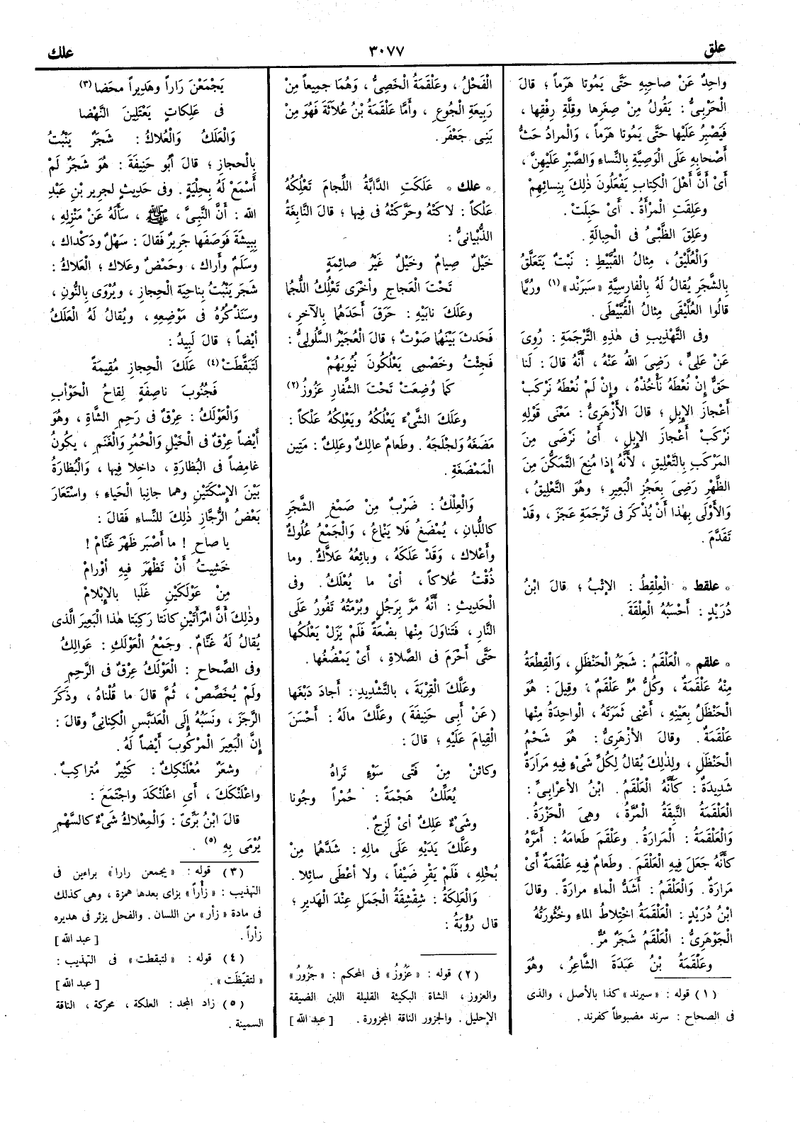 ( علقط ) العِلْقِطُ الإِتْبُ قال ابن دريد أَحْسَبه العِلْقةَ ( علقم ) العَلْقَمُ شجر الحَنْظَل والقطعة منه عَلْقَمَةٌ وكُلُّ مُرٍّ عَلْقَمٌ وقيل هو الحنظل بعينه أَعني ثمرته الواحدة منها عَلْقَمَةٌ وقال الأزهري هو شَحْمُ الحنظل ولذلك يقال لكل شيء فيه مرارة شديدة كأَنه العَلْقَم ابن الأَعرابي العَلْقَمَة النَّبِقة المُرَّةُ وهي الحَزْرة والعَلْقَمة المَرارة وعَلْقَمَ طعامَه أَمَرَّه كأَنه جعل فيه العَلْقَم وطعام فيه عَلْقَمَةٌ أي مرارة والْعَلْقَمُ أشدُّ الماء مرارة وقال ابن دريد العَلْقَمةُ اختلاط الماء وخُثُورَتُه الجوهري العَلْقَمُ شجر مر وعَلْقَمَةُ ابن عَبَدَة الشاعر وهو الفَحْلُ وعَلْقَمَةُ الخَصِيُّ وهما جميعاً من رَبيعةِ الجُوعِ وأَما عَلْقَمةُ بن عُلاثَة فهو من بني جعفر