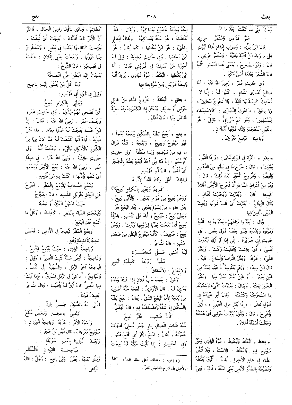 ورجلٌ بَعِيجٌ من قوم بَعْجَى والأَنثى بَعِيجٌ بغير هاء من نسوة بَعْجَى وقد انْبَعَجَ هو وبطنٌ بَعِجٌ مُنْبَعِجٌ أُراه على النَّسَب وامرأَة بعِيجٌ أَي بَعَجَتْ بطْنَها لزوجها ونَثَرَتْ ورجلٌ بَعِجٌ ضعيفٌ كأَنه مبعوج البطن مِن ضَعْف مَشْيه قال الشاعر لَيْلَةَ أَمْشي علَى مُخاطَرَةٍ مَشْياً رُويَداً كَمِشيَةِ البَعِجِ والانْبِعَاجُ الانشقاق وتقول بَعَجَهُ حُبُّ فلان إذا اشتَدَّ وَجْدُهُ وحَزِنَ له قال الأَزهري لَعَجَهُ حُبه أَصوبُ من بَعَجَهُ لأَن البَعْجَ الشَّقُّ يقال بَعَجَ بَطْنَه بالسكين إِذا شقه وخَضْخَضَهُ فيه قال الهذلي كأَنَّ ظُباتِها عُقُرٌ بَعِيجُ شَبَّه ظُباتِ النِّصال بنار جمر سُخِىَ فَظَهَرَتْ حُمْرَتُه يقال اسْخُ النار أَي افتح عينها وفي الحديث إِذا رأَيتَ مكةَ قد بُعِجَتْ كظَائمَ وساوى بناؤُها رؤوسَ الجبال فاعْلَم أَنَّ الأَمْرَ قد أَظَلَّكَ بُعِجَتْ أَي شُقَّت وفُتِحت كظائمُها بَعْضُها في بعض واسْتُخْرِجَ منها عيونها وبَعَجْتُ بطني لفلان بالغت في نصيحته قال الشماخ بَعَجْتُ إِليه البَطْنَ حتى انْتَصَحْتُه وما كلُّ مَنْ يُفْشَى إِليه بِناصِحِ وقيل في قول أَبي ذؤَيب وبطني بالكرام بعيج أَي نُصْحي لهم مبذول وفي حديث عَمْرٍو وَوَصَفَ عمر رضي الله عنه فقال إِن ابن حَنْتَمَةَ بَعَجَتْ له الدنيا مِعَاها هذا مثل ضربه أَراد أَنها كشفت له عما كان فيها من الكنوز والأَموال والفيء وحنتمة أُمُّه وفي حديث عائشة رضي الله عنها في صفة عمر رضي الله عنه بَعَجَ الأَرضَ وبَجَعَها أَي شقَّها وأَذلَّها كَنَتْ به عن فتوحه وتَبَعَّجَ السحابُ وانْبَعَجَ بالمطر انْفَرَجَ عن الوَدْقِ والوَبْلِ الشديد قال العجاج حَيْثُ اسْتَهَلَّ المُزْنُ أَو تَبَعَّجَا وتَبَعَّجَتِ السماءُ بالمطر كذلك وكلُّ ما اتسع فقد انْبَعَجَ وبَعَّجَ المطرُ تَبْعِيجاً في الأَرض فَحَصَ الحجارةَ لشدَّة وَقْعِهِ وباعِجَةُ الوادي حيث يَنْبَعِجُ فيَتَّسِع والباعِجَة أَرْضٌ سَهْلَةٌ تُنْبِتُ النَّصِيَّ وقيل الباعِجَةُ آخر الرَّمْلِ والسُّهولَةُ إِلى القُفِّ والبَوَاعِجُ أَماكِنُ في الرَّمل تَسْتَرِقُّ فإِذا نبت فيها النَّصِيُّ كان أَرَقَّ له وأَطيبَ وقال الشاعر يصف فرساً فأَنَى له بالصَّيْفِ ظِلٌّ باردٌ ونَصِيُّ باعِجَةٍ ومَحْضٌ مُنْقَعُ وَبَعَجَهُ الأَمْرُ حَزَبَه وباعِجَةُ القِرْدانِ موضعٌ معروف قال أَوس بن حَجَر وبَعْدَ لَيَالِينا بِنَعْفِ سُوَيْقَةٍ فبَاعِجَةِ القِرْدانِ فالمُتَثَلَّمِ وبنُو بَعْجَةَ بطنٌ وابنُ باعِج رجلٌ قال الراعي
