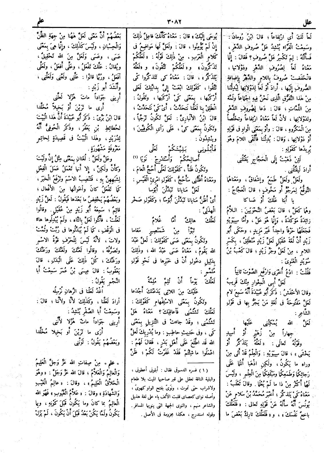 وتكون ظَنًّا كقولك لَعَلِّي أَحُجُّ العامَ ومعناه أَظُنُّني سأَحُجُّ كقول امرئ القيس لَعَلَّ مَنايانا تَبَدَّلْنَ أَبْؤُسا أَي أَظُنُّ منايانا تبدَّلنَ أَبؤُسا وكقول صخر الهذلي لعَلَّكَ هالِكٌ أَمَّا غُلامٌ تَبَوَّأَ مَنْ شَمَنْصِيرٍ مَقاما وتكون بمعنى عَسى كقولك لعَلَّ عبدَ الله يقوم معناه عَسى عبدُ الله وذلك بدليل دخول أَن في خبرها في نحو قول مُتَمِّم لعَلَّكَ يَوْماً أَن تُلِمَّ مُلِمَّةٌ عَلَيْك من اللاَّتي يَدَعْنَكَ أَجْدَعا وتكون بمعنى الاستفهام كقولك لَعَلَّك تَشْتُمُني فأُعاقِبَك ؟ معناه هل تشْتُمني وقد جاءت في التنزيل بمعنى كَيْ وفي حديث حاطب وما يُدْريك لعلَّ اللهَ قد اطَّلَع على أَهل بَدْرٍ فقال لهم اعْمَلوا ما شئتم فقد غَفَرْتُ لكم ظَنَّ بعضهم أَن معنى لَعَلَّ ههنا من جهة الظَّن والحِسْبان وليس كذلك وإِنما هي بمعني عَسى وعَسى ولعَلَّ من الله تحقيق ويقال عَلَّك تَفْعَل وعَلِّي أَفعَلُ ولَعَلِّي أَفعَلُ وربما قالوا عَلَّني ولَعَّنِي ولعَلَّني وأَنشد أَبو زيد أَرِيني جَوَاداً مات هُزْلاً لعَلَّني أَرى ما تَرَيْنَ أَو بَخِيلاً مُخَلَّدا قال ابن بري ذكر أَبو عبيدة أَن هذا البيت لحُطائط ابن يَعْفُر وذكر الحوفي أَنه لدُرَيد وهذا البيت في قصيدة لحاتم معروفة مشهورة وعَلَّ ولَعَلَّ لغتان بمعنىً مثل إِنَّ ولَيتَ وكأَنَّ ولكِنَّ إِلاَّ أَنها تعمل عمل الفعل لشبههنَّ به فتنصب الاسم وترفع الخبر كما تفعل كان وأَخواتها من الاًفعال وبعضهم يخفِض ما بعدها فيقول لعَلَّ زيدٍ قائمٌ سمعه أَبو زيد من عُقَيل وقالوا لَعَلَّتْ فأَنَّثُوا لعَلَّ بالتاء ولم يُبْدِلوها هاءً في الوقف كما لم يبدلوها في رُبَّتْ وثُمَّت ولاتَ لأَنه ليس للحرف قوَّةُ الاسم وتصَرُّفُه وقالوا لعَنَّك ولغَنَّك ورَعَنَّكَ ورَغَنَّك كل ذلك على البدل قال يعقوب قال عيسى بن عمر سمعت أَبا النجم يقول أُغْدُ لَعَلْنا في الرِّهان نُرْسِلُه أَراد لعَلَّنا وكذلك لأَنَّا ولأَنَّنا قال وسمعت أَبا الصِّقْر ينشد أَرِيني جَوَاداً مات هُزْلاً لأَنَّنِي أَرَى ما تَرَيْنَ أَو بَخِيلاً مُخَلَّدا وبعضهم يقول لَوَنَّني