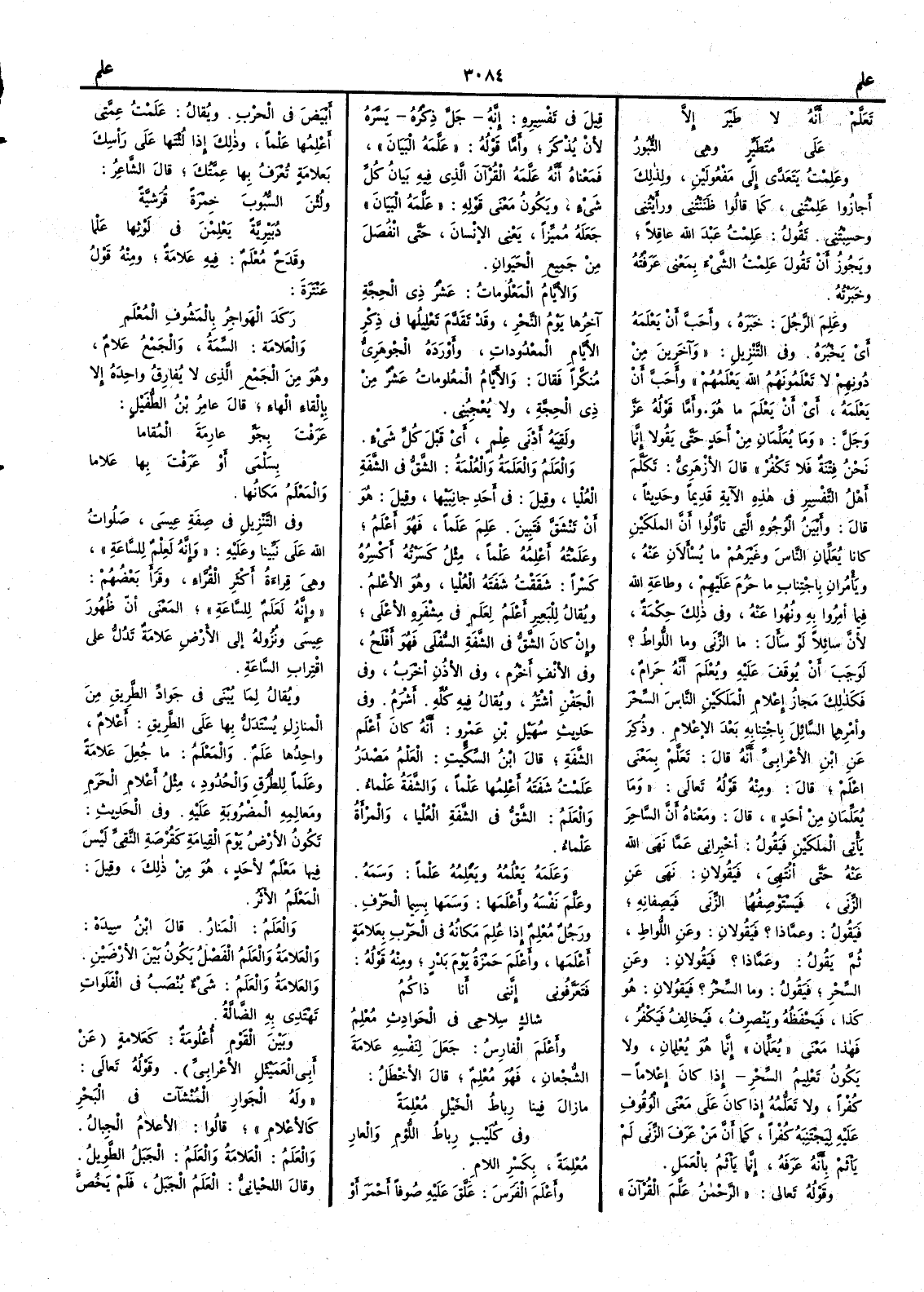 تَعَلَّمْ أنَّهُ لا طَيْرَ إلاّ عَلى مُتَطَيِّرٍ وهي الثُّبُور وعَلِمْتُ يتعدى إلى مفعولين ولذلك أَجازوا عَلِمْتُني كما قالوا ظَنَنْتُني ورأَيْتُني وحسِبْتُني تقول عَلِمْتُ عَبْدَ الله عاقلاً ويجوز أن تقول عَلِمْتُ الشيء بمعنى عَرَفْته وخَبَرْته وعَلِمَ الرَّجُلَ خَبَرَه وأَحبّ أن يَعْلَمَه أي يَخْبُرَه وفي التنزيل وآخَرِين مِنْ دونهم لا تَعْلَمُونَهم الله يَعْلَمُهم وأحب أن يَعْلَمه أي أن يَعْلَمَ ما هو وأما قوله عز وجل وما يُعَلِّمانِ مِنْ أحد حتى يقولا إنما نحن فتنة تَكْفُرْ قال الأزهري تكلم أهل التفسير في هذه الآية قديماً وحديثاً قال وأبْيَنُ الوجوه التي تأوَّلوا أن الملَكين كانا يُعَلِّمانِ الناسَ وغيرهم ما يُسْأَلانِ عنه ويأْمران باجتناب ما حرم عليهم وطاعةِ الله فيما أُمِروا به ونُهُوا عنه وفي ذلك حِكْمةٌ لأن سائلاً لو سأل ما الزنا وما اللواط ؟ لوجب أن يُوقَف عليه ويعلم أنه حرام فكذلك مجازُ إعلام المَلَكين الناسَ السحرَ وأمْرِهِما السائلَ باجتنابه بعد الإعلام وذكر عن ابن الأعرابي أنه قال تَعَلَّمْ بمعنى اعْلَمْ قال ومنه وقوله تعالى وما يُعَلِّمان من أحد قال ومعناه أن الساحر يأتي الملكين فيقول أخْبراني عما نَهَى اللهُ عنه حتى أنتهي فيقولان نَهَى عن الزنا فَيَسْتَوْصِفُهما الزنا فيَصِفانِه فيقول وعمَّاذا ؟ فيقولان وعن اللواط ثم يقول وعَمَّاذا ؟ فيقولان وعن السحر فيقول وما السحر ؟ فيقولان هو كذا فيحفظه وينصرف فيخالف فيكفر فهذا معنى يُعلِّمان إنما هو يُعْلِمان ولا يكون تعليم السحر إذا كان إعْلاماً كفراً ولا تَعَلُّمُه إذا كان على معنى الوقوف عليه ليجتنبه كفراً كما أن من عرف الزنا لم يأْثم بأنه عَرَفه إنما يأْثم بالعمل وقوله تعالى الرحمن عَلَّم القرآن قيل في تفسيره إنه جلَّ ذكرُه يَسَّرَه لأن يُذْكَر وأما قوله عَلَّمَهُ البيانَ فمعناه أنه عَلَّمَه القرآن الذي فيه بَيانُ كل شيء ويكون معنى قوله عَلَّمَهُ البيانَ جعله مميَّزاً يعني الإنسان حتى انفصل من جميع الحيوان والأَيَّامُ المَعْلُوماتُ عَشْرُ ذي الحِجَّة آخِرُها يومُ النَّحْر وقد تقدم تعليلها في ذكر الأَيام المعدودات وأورده الجوهري منكراً فقال والأيام المعلوماتُ عَشْرُ من ذي الحجة ولا يُعْجِبني ولقِيَه أَدْنَى عِلْمٍ أي قبلَ كل شيء والعَلَمُ والعَلَمة والعُلْمة الشَّقُّ في الشَّفة العُلْيا وقيل في أحد جانبيها وقيل هو أَن تنشقَّ فتَبينَ عَلِمَ عَلَماً فهو أَعْلَمُ وعَلَمْتُه أَعْلِمُه عَلْماً مثل كَسَرْته أكْسِرهُ كَسْراً شَقَقْتُ شَفَتَه العُليا وهو الأَعْلمُ ويقال للبعير أَعْلَمُ لِعَلَمٍ في مِشْفَرِه الأعلى وإن كان الشق في الشفة السفلى فهو أَفْلَحُ وفي الأنف أَخْرَمُ وفي الأُذُن أَخْرَبُ وفي الجَفْن أَشْتَرُ ويقال فيه كلِّه أَشْرَم وفي حديث سهيل بن عمرو أنه كان أَعْلمَ الشَّفَةِ قال ابن السكيت العَلْمُ مصدر عَلَمْتُ شَفَتَه أَعْلِمُها عَلْماً والشفة عَلْماء والعَلَمُ الشَّقُّ في الشفة العُلْيا والمرأَة عَلْماء وعَلَمَه يَعْلُمُه ويَعْلِمُه عَلْماً وَسَمَهُ وعَلَّمَ نَفسَه وأَعْلَمَها وَسَمَها بِسِيما الحَرْبِ ورجل مُعْلِمٌ إذا عُلِم مكانهُ في الحرب بعَلامةٍ أَعْلَمَها وأَعْلَمَ حمزةُ يومَ بدر ومنه قوله فَتَعَرَّفوني إنَّني أنا ذاكُمُ شاكٍ سِلاحِي في الحوادِثِ مُعلِمُ وأَعْلَمَ الفارِسُ جعل لنفسه عَلامةَ الشُّجعان فهو مُعْلِمٌ قال الأخطل ما زالَ فينا رِباطُ الخَيْلِ مُعْلِمَةً وفي كُلَيْبٍ رِباطُ اللُّؤمِ والعارِ مُعْلِمَةً بكسر اللام وأَعْلَم الفَرَسَ عَلَّقَ عليه صُوفاً أحمر أو أبيض في الحرب ويقال عَلَمْتُ عِمَّتي أَعْلِمُها عَلْماً وذلك إذا لُثْتَها على رأْسك بعَلامةٍ تُعْرَفُ بها عِمَّتُك قال الشاعر ولُثْنَ السُّبُوبَ خِمْرَةً قُرَشيَّةً دُبَيْرِيَّةً يَعْلِمْنَ في لوْثها عَلْما وقَدَحٌ مُعْلَمٌ فيه عَلامةٌ ومنه قول عنترة رَكَدَ الهَ