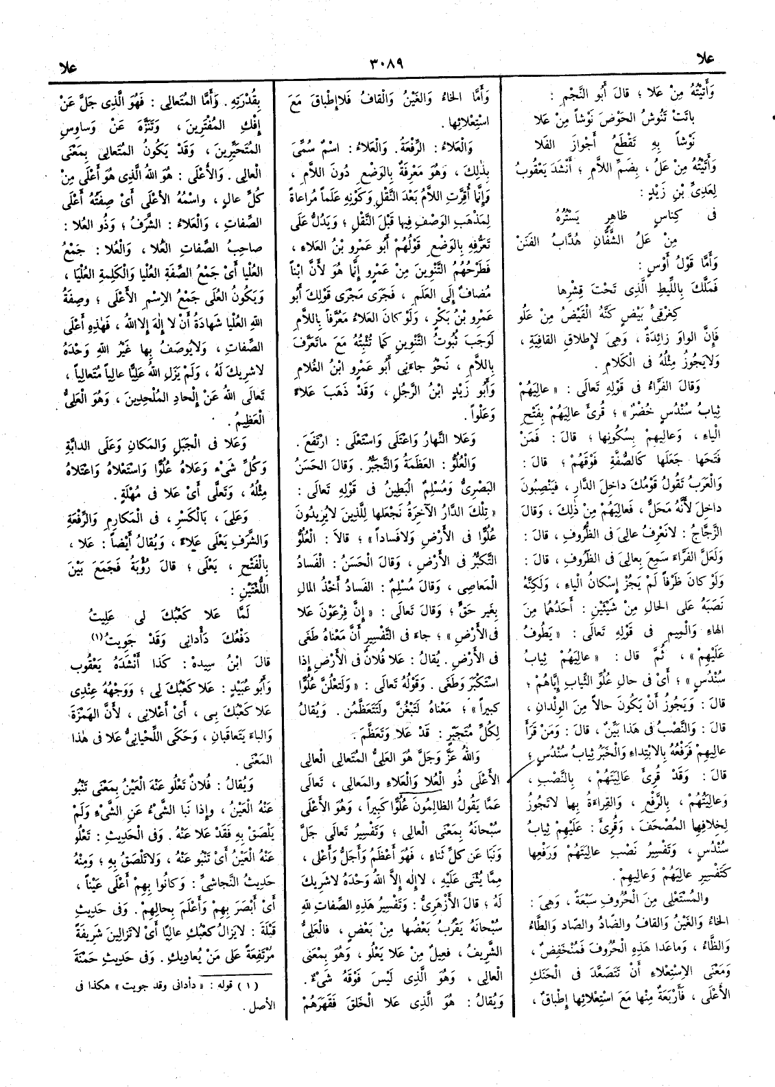 وأَتيتُه من عَلا قال أَبو النجم باتَتْ تَنُوشُ الحَوْضَ نَوْشاً مِن عَلا نَوْشاً به تَقْطَعُ أَجْوازَ الفَلا وأَتَيْتُه من عَلُ بضم اللامِ أَنشد يعقوب لعَدِيّ ابن زيد في كِناسٍ ظاهِرٍ يَسْتُرُه من عَلُ الشَّفَّان هُدَّابُ الفَنَنْ وأَما قول أَوس فَمَلَّكَ باللِّيطِ الذي تحتَ قِشْرِها كغِرْقئِ بَيْضٍ كَنَّه القَيْضُ مِنْ عَلُو فإن الواو زائدة وهي لإطلاقِ القافية ولا يجوزُ مثلُه في الكلام وقال الفراء في قوله تعالى عالِيَهُم ثيابُ سُنْدُسٍ خُضْرٌ قرئ عالِيَهُم بفتح الياء وعالِيهِم بسكونها قال فمَن فتَحها جَعَلها كالصفة فوقَهم قال والعرب تقول قَوْمُك داخِلَ الدارِ فيَنْصِبون داخلَ لأنه محَلٌ فعالِيَهُم من ذلك وقال الزجاج لا نعرف عالِيَ في الظروف قال ولعلَّ الفراء سمع بِعا في الظروف قال ولو كان ظرفاً لم يَجُزْ إسكان الياء ولكنه نَصَبه على الحال من شيئين أَحدُهما من الهاء والميم في قوله تعالى يَطُوفُ عليهم ثم قال عالِيَهُمْ ثيابُ سندس أي في حالِ عُلُوِّ الثياب إياهم قال ويجوز أن يكون حالاً من الوِلْدان قال والنصب في هذا بَيِّنٌ قال ومن قرأَ عالِيِهم فرفْعُه بالابتداء والخبر ثياب سندس قال وقد قرئ عالِيَتَهُمْ بالنصب وعالِيَتُهم بالرفع والقراءة بهما لا تجوز لخلافهما المصحف وقرئ عَلَيْهم ثيابُ سندس وتفسير نصب عالِيَتَهُم ورفعها كتفسير عالِيَهُم وعالِيهم والمُسْتَعْلي من الحروف سبعة وهي الخاءُ والغين والقاف والضاد والصاد والطاء والظاء وما عدا هذه الحروفَ فمنخفِض ومعنى الاستعْلاء أَن تَتَصَعَّد في الحَنَك الأَعلى فأَربعةٌ منها مع استعلائها إطْباقٌ وأَما الخاء والغينُ والقاف فلا إطباق مع استعلائها والعَلاءُ الرِّفْعَة والعلاءُ اسم سُمِّيَ بذلك وهو معرفة بالوضع دون اللام وإنما أُقِرَّت اللامُ بعد النَّقل وكونه علَماً مراعاةً لمذهب الوصف فيها قبلَ النَّقْلِ ويدلُّ على تَعَرُّفِه بالوضع قولُهُم أَبو عمرو بنُ العَلاء فطَرْحُهم التنوينَ من عَمْرو إنما هو لأَنَّ ابناً مضافٌ إلى العَلَم فجرَى مَجْرَى قولِك أَبو عمرِو بنُ بكر ولو كان العَلاء مُعَرَّفاً باللامِ لوجب ثبوت التنوين كما تُثْبته مع ما تعرَّف باللام نحو جاءَني أَبو عمرٍ وابن الغُلامِ وأَبو زيدٍ ابنُ الرجلِ وقد ذهَب عَلاءً وعَلْواً وعَلا النهارُ واعْتَلى واسْتَعْلى ارْتَفَعَ والعُلُوُّ العَظَمة والتَّجَبُّر وقال الحسن البصري ومسلم البَطِين في قوله تعالى تِلْكَ الدارُ الآخِرةُ نجْعَلها للذين لا يريدون عُلُوّاً في الأَرض ولا فَساداً قال العُلُو التكبُّر في الأَرض وقال الحسن الفَسادُ المَعاصي وقال مسلم الفَسادُ أَخذ المال بغير حق وقال تعالى إن فِرْعَوْنَ عَلا في الأرض جاء في التفسير أَن معناه طَغَى في الأَرض يقال عَلا فلانٌ في الأرض إذا اسْتَكْبَرَ وطَغَى وقوله تعالى ولَتَعْلُنَّ عُلُوًّا كبيراً معناه لَتَبْغُنّ ولَتَتَعَظَّمُنّ ويقال لكل مُتَجَبِّر قد عَلا وتَعَظَّمَ واللهُ عز وجل هو العَليّ المُتعالي العا الأَعْلَى ذُو العُلا والعَلاء والمَعا تَعالى عَمَّا يقول الظالمون عُلُوّاً كبيراً هو الأَعْلى سبحانه بمعنى العا وتفسير تَعالَى جلَّ ونَبَا عن كلِّ ثناءٍ فهو أَعظم وأَجلُّ وأَعْلى مما يُثنى عليه لا إله إلا الله وحده لا شريك له قال الأزهري وتفسير هذه الصفات سبحانه يَقْرُب بعضُها من بعض فالعَلِيُّ الشريف فَعِيل من عَلا يَعْلُو وهو بمعنى العالِي وهو الذي ليس فوقه شيء ويقال هو الذي عَلا الخلقَ فَقَهَرهم بقدرته وأَما المُتعا فهو الذي جَلَّ عن إفْكِ المُفْتَرِين وتَنَزَّه عن وَساوس المتحيِّرين وقد يكون المُتعا بمعنى العا والأَعْلى هو الله الذي هو أَعْلى من كل عالٍ واسمه الأَعْلى أَي صفته أَعْلى الصفات والعَلاءُ الشرفُ وذو العُلا صاحب الصفات العُلا والعُلا جمع العُلْيا أَي جمع الصفة العُليا والكلمة العلْيا ويكون العُلى جمع الاسم الأَعْلى وصفةُ الله العُلْيا شهادةُ أَنْ