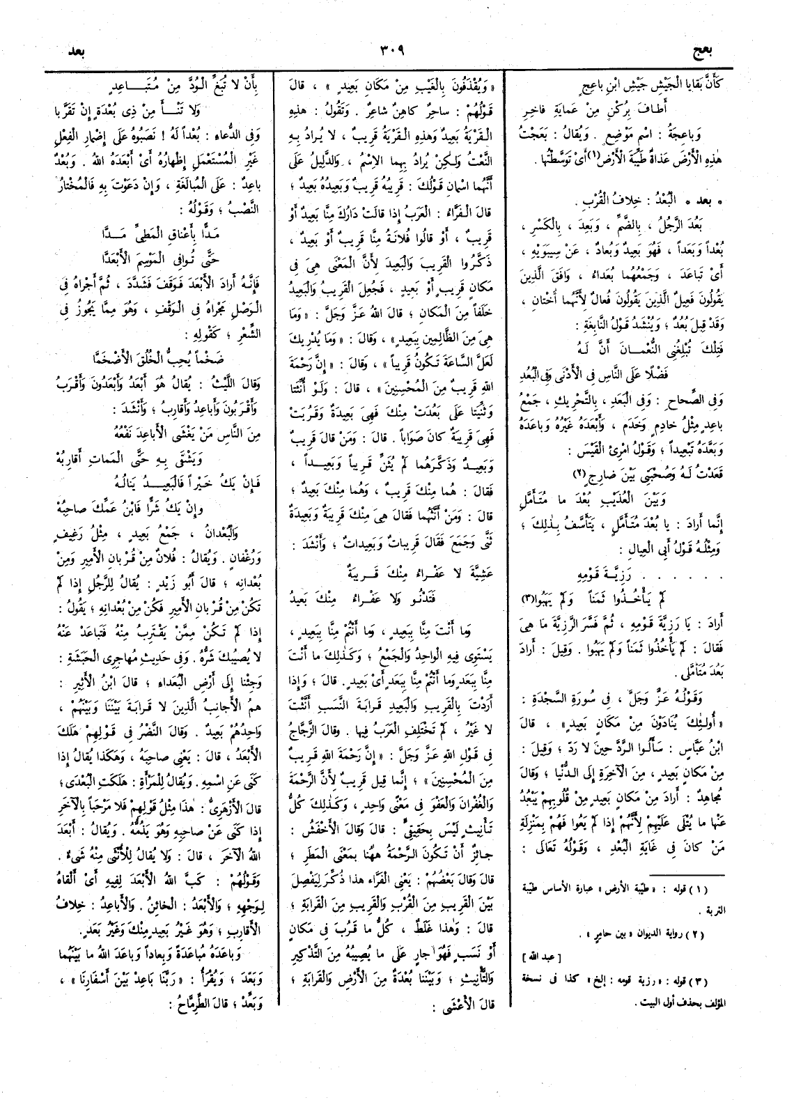 أَراد يا رزية قومه ثم فسر الرزية ما هي فقال لم يأْخذوا ثمناً ولم يهبوا وقيل أَرادَ بَعُدَ مُتَأَمَّلي وقوله عز وجل في سورة السجدة أُولئك يُنادَوْنَ من مكان بعيد قال ابن عباس سأَلوا الردّ حين لا ردّ وقيل من مكان بعيد من الآخرة إِلى الدنيا وقال مجاهد أَراد من مكان بعيد من قلوبهم يبعد عنها ما يتلى عليهم لأَنهم إِذا لم يعوا فَهُمْ بمنزلة من كان في غاية البعد وقوله تعالى ويقذفون بالغيب من مكان بعيد قال قولهم ساحر كاهن شاعر وتقول هذه القرية بعيد وهذه القرية قريب لا يراد به النعت ولكن يراد بهما الاسم والدليل على أَنهما اسمان قولك قريبُه قريبٌ وبَعيدُه بَعيدٌ قال الفراءُ العرب إِذا قالت دارك منا بعيدٌ أَو قريب أَو قالوا فلانة منا قريب أَو بعيد ذكَّروا القريب والبعيد لأَن المعنى هي في مكان قريب أَو بعيد فجعل القريب والبعيد خلفاً من المكان قال الله عز وجل وما هي من الظالمين ببعيد وقال وما يدريك لعل الساعة تكون قريباً وقال إن رحمة الله قريب من المحسنين قال ولو أُنثتا وثنيتا على بعدت منك فهي بعيدة وقربت فهي قريبة كان صواباً قال ومن قال قريب وبعيد وذكَّرهما لم يثنّ قريباً وبعيداً فقال هما منك قريب وهما منك بعيد قال ومن أَنثهما فقال هي منك قريبة وبعيدة ثنى وجمع فقال قريبات وبعيدات وأَنشد عَشِيَّةَ لا عَفْراءُ منكَ قَريبةٌ فَتَدْنو ولا عَفْراءُ مِنكَ بَعيدٌ وما أَنت منا ببعيد وما أَنتم منا ببعيد يستوي فيه الواحد والجمع وكذلك ما أَنت منا بِبَعَدٍ وما أَنتم منا بِبَعَدٍ أَي بعيد قال وإِذا أَردت بالقريب والبعيد قرابة النسب أَنثت لا غير لم تختلف العرب فيها وقال الزجاج في قول الله عز وجل إِن رحمة الله قريب من المحسنين إِنما قيل قريب لأَن الرحمة والغفران والعفو في معنى واحد وكذلك كل تأْنيث ليس بحقيقي قال وقال الأَخفش جائز أَن تكون الرحمة ههنا بمعنى المطر قال وقال بعضهم يعني الفراءُ هذا ذُكِّرَ ليفصل بين القريب من القُرب والقَريب من القرابة قال وهذا غلط كلُّ ما قَرُب في مكان أَو نَسَبٍ فهو جارٍ على ما يصيبه من التذكير والتأْنيث وبيننا بُعْدَةٌ من الأَرض والقرابة قال الأَعشى بأَنْ لا تُبَغِّ الوُدَّ منْ مُتَباعِدٍ ولا تَنْأَ منْ ذِي بُعْدَةٍ إِنْ تَقَرَّبا وفي الدعاءِ بُعْداً له نصبوه على إِضمار الفعل غير المستعمل إِظهاره أَي أَبعده الله وبُعْدٌ باعد على المبالغة وإِن دعوت به فالمختار النصب وقوله مَدّاً بأَعْناقِ المَطِيِّ مَدَّا حتى تُوافي المَوْسِمَ الأَبْعَدَّا فإِنه أَراد الأَبعد فوقف فشدّد ثم أَجراه في الوصل مجراه في الوقف وهو مما يجوز في الشعر كقوله ضَخْماً يحبُّ الخُلُقَ الأَضْخَمَّا وقال الليث يقال هو أَبْعَد وأَبْعَدُونَ وأَقرب وأَقربون وأَباعد وأَقارب وأَنشد منَ الناسِ مَنْ يَغْشى الأَباعِدَ نَفْعُه ويشْقى به حتى المَماتِ أَقارِبُهْ فإِنْ يَكُ خَيراً فالبَعيدُ يَنالُهُ وإِنْ يَكُ شَرّاً فابنُ عَمِّكَ صاحِبُهْ والبُعْدانُ جمع بعيد مثل رغيف ورغفان ويقال فلان من قُرْبانِ الأَمير ومن بُعْدانِه قال أَبو زيد يقال للرجل إِذا لم تكن من قُرْبان الأَمير فكن من بُعْدانِه يقول إِذا لم تكن ممن يقترب منه فتَباعَدْ عنه لا يصيبك شره وفي حديث مهاجري الحبشة وجئنا إِلى أَرض البُعَداءِ قال ابن الأَثير هم الأَجانب الذين لا قرابة بيننا وبينهم واحدهم بعيد وقال النضر في قولهم هلك الأَبْعَد قال يعني صاحبَهُ وهكذا يقال إِذا كنى عن اسمه ويقال للمرأَة هلكت البُعْدى قال الأَزهري هذا مثل قولهم فلا مَرْحباً بالآخر إِذا كنى عن صاحبه وهو يذُمُّه وقال أَبعد الله الآخر قال ولا يقال للأُنثى منه شيء وقولهم كبَّ الله الأَبْعَدَ لِفيه أَي أَلقاه لوجهه والأَبْعَدُ الخائنُ والأَباعد خلاف الأَقارب وهو غير بَعِيدٍ منك وغير بَعَدٍ وباعده مُباعَدَة وبِعاداً وباعدالله ما بينهما وبَعَّد ويُقرأُ ربَّنا باعِدْ بين أَسفارِنا وبَعِّدْ قال الطرمَّاح