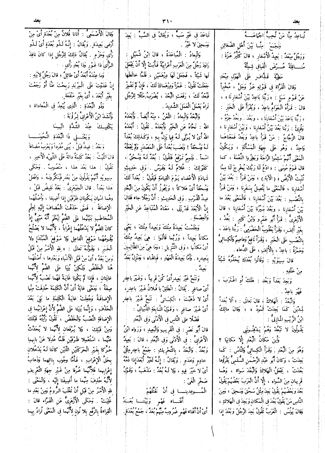 تُباعِدُ مِنَّا مَن نُحِبُّ اجْتِماعَهُ وتَجْمَعُ مِنَّا بين أَهل الضَّغائِنِ ورجل مِبْعَدٌ بعيد الأَسفار قال كثَّير عزة مُناقِلَةً عُرْضَ الفَيافي شِمِلَّةً مَطِيَّةَ قَذَّافٍ على الهَوْلِ مِبْعَدِ وقال الفراءُ في قوله عز وجل مخبراً عن قوم سبا ربنا باعد بين أَسفارنا قال قرأَه العوام باعد ويقرأُ على الخبر ربُّنا باعَدَ بين أَسفارنا وبَعَّدَ وبَعِّدْ جزم وقرئَ ربَّنا بَعُدَ بَيْنَ أَسفارنا وبَيْنَ أَسفارنا قال الزجاج من قرأَ باعِدْ وبَعِّدْ فمعناهما واحد وهو على جهة المسأَلة ويكون المعنى أَنهم سئموا الراحة وبطروا النعمة كما قال قوم موسى ادع لنا ربك يخرج لنا مما تنبت الأَرض ( الآية ) ومن قرأَ بَعُدَ بينُ أَسفارنا فالمعنى ما يتَّصِلُ بسفرنا ومن قرأَ بالنصب بَعُدَ بينَ أَسفارنا فالمعنى بَعُدَ ما بَيْنَ أَسفارنا وبَعُدَ سيرنا بين أَسفارنا قال الأَزهري قرأَ أَبو عمرو وابن كثير بَعَّد بغير أَلف وقرأَ يعقوب الحضرمي ربُّنا باعَدَ بالنصب على الخبر وقرأَ نافع وعاصم والكسائي وحمزة باعِدْ بالأَلف على الدعاءِ قال سيبويه وقالوا بُعْدَك يُحَذِّرُهُ شيئاً من خَلْفه وبَعِدَ بَعَداً وبَعُد هلك أَو اغترب فهو باعد والبُعْد الهلاك قال تعالى أَلا بُعْداً لمدين كما بَعِدَت ثمود وقال مالك بن الريب المازني يَقولونَ لا تَبْعُدْ وَهُمْ يَدْفِنونَني وأَينَ مكانُ البُعْدِ إِلا مكانِيا ؟ وهو من البُعْدِ وقرأَ الكسائي والناس كما بَعِدَت وكان أَبو عبد الرحمن السُّلمي يقرؤها بَعُدَت يجعل الهلاك والبُعْدَ سواء وهما قريبان من السواء إِلا أَن العرب بعضهم يقول بَعُدَ وبعضهم يقول بَعِدَ مثل سَحُقَ وسَحِقَ ومن الناس من يقول بَعُد في المكان وبَعِدَ في الهلاك وقال يونس العرب تقول بَعِدَ الرجل وبَعُدَ إِذا تباعد في غير سبّ ويقال في السب بَعِدَ وسَحِقَ لا غير والبِعاد المباعدة قال ابن شميل راود رجل من العرب أَعرابية فأَبت إِلا أَن يجعل لها شيئاً فجعل لها درهمين فلما خالطها جعلت تقول غَمْزاً ودِرْهماكَ لَكَ فإِن لم تَغْمِزْ فَبُعْدٌ لكَ رفعت البعد يضرب مثلاً للرجل تراه يعمل العمل الشديد والبُعْدُ والبِعادُ اللعن منه أَيضاً وأَبْعَدَه الله نَحَّاه عن الخير وأَبعده تقول أَبعده الله أَي لا يُرْثَى له فيما يَزِلُّ به وكذلك بُعْداً له وسُحْقاً ونَصَبَ بُعْداً على المصدر ولم يجعله اسماً وتميم ترفع فتقول بُعْدٌ له وسُحْقٌ كقولك غلامٌ له وفرسٌ وفي حديث شهادة الأَعضاء يوم القيامة فيقول بُعْداً لكَ وسُحقاً أَي هلاكاً ويجوز أَن يكون من البُعْد ضد القرب وفي الحديث أَن رجلاً جاء فقال إِن الأَبْعَدَ قد زَنَى معناه المتباعد عن الخير والعصمة وجَلَسْتُ بَعيدَةً منك وبعيداً منك يعني مكاناً بعيداً وربما قالوا هي بَعِيدٌ منك أَي مكانها وفي التنزيل وما هي من الظالمين ببعيد وأَما بَعيدَةُ العهد فبالهاء ومَنْزل بَعَدٌ بَعيِدٌ وتَنَحَّ غيرَ بَعِيد أَي كن قريباً وغيرَ باعدٍ أَي صاغرٍ يقال انْطَلِقْ يا فلانُ غيرُ باعِدٍ أَي لا ذهبت الكسائي تَنَحَّ غيرَ باعِدٍ أَي غير صاغرٍ وقول النابغة الذبياني فَضْلاَ على الناسِ في الأَدْنَى وفي البُعُدِ قال أَبو نصر في القريب والبعيد ورواه ابن الأَعرابي في الأَدنى وفي البُعُد قال بعيد وبُعُد والبَعَد بالتحريك جمع باعد مثل خادم وخَدَم ويقال إِنه لغير أَبْعَدَ إِذا ذمَّه أَي لا خير فيه ولا له بُعْدٌ مَذْهَبٌ وقول صخر الغيّ المُوعِدِينا في أَن نُقَتِّلَهُمْ أَفْنَاءَ فَهْمٍ وبَيْنَنا بُعَدُ أَ أَنَّ أَفناء فهم ضروب منهم بُعَد جَمع بُعْدةٍ وقال الأَصمعي أَتانا فلان من بُعْدةٍ أَي من أَرض بَعيدة ويقال إِنه لذو بُعْدة أَي لذو رأْي وحزم يقال ذلك للرجل إِذا كان نافذ الرأْي ذا غَوْر وذا بُعْدِ رأْي وما عنده أَبْعَدُ أَي طائل قال رجل لابنه إِن غدوتَ على المِرْبَدِ رَبِحْتَ عنا أَو رجعت بغير أَبْعَدَ أَي بغير منفعة وذو البُعْدة الذي يُبْعِد في المُعاداة وأَنشد 
