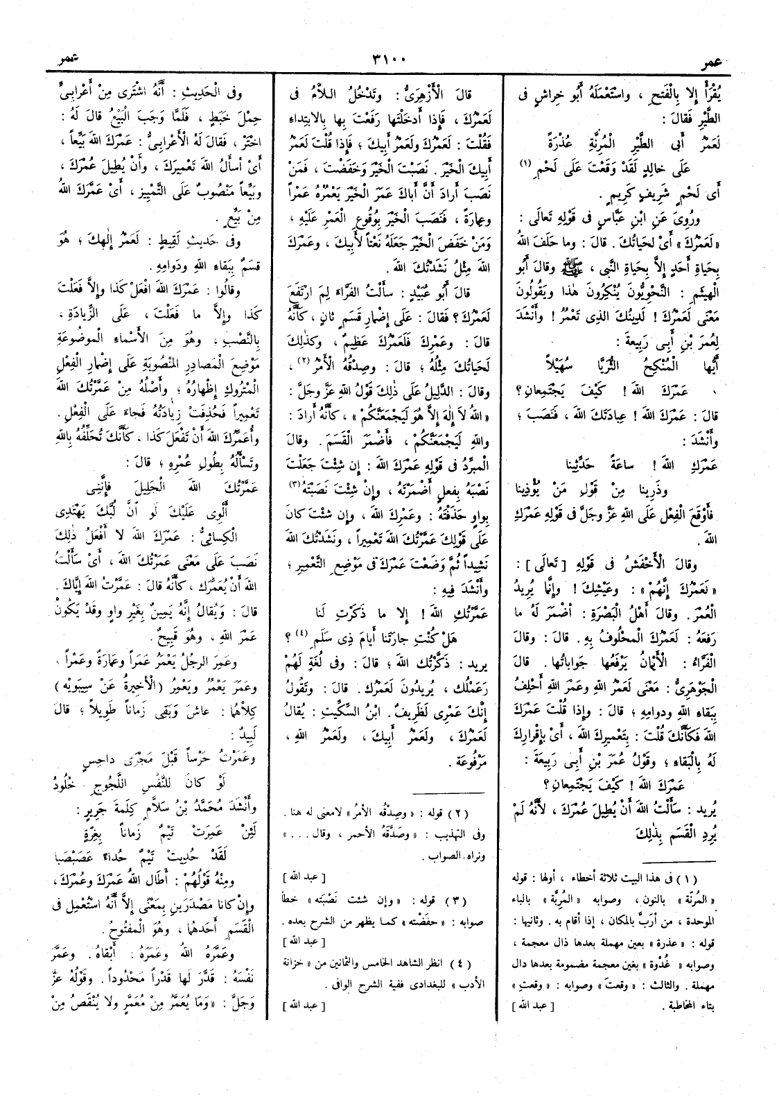 ( * قوله بواو حذفته وعمرك إِلخ » هكذا في الأَصل ) الله وإِن شئت كان على قولك عَمَّرْتُك اللهَ تَعْمِيراً ونَشَدْتُك الله نَشِيداً ثم وضعتَ عَمْرَك في موضع التَّعْمِير وأَنشد فيه عَمَّرْتُكِ اللهَ أَلا ما ذَكَرْتِ لنا هل كُنْتِ جارتَنا أَيام ذِي سَلَمِ ؟ يريد ذَكَّرْتُكِ اللهَ قال وفي لغة لهم رَعَمْلُك يريدون لَعَمْرُك قال وتقول إِنّك عَمْرِي لَظَرِيفٌ ابن السكيت يقال لَعَمْرُك ولَعَمْرُ أَبيك ولَعَمْرُ الله مرفوعة وفي الحديث أَنه اشترى من أَعرابي حِمْلَ خَبَطٍ فلما وجب البيع قال له اخْتَرْ فقال له الأَعرابيّ عَمْرَكَ اللهَ بَيْعاً أَي أَسأَلُ الله تَعْمِيرَك وأَن يُطيل عُمْرك وبَيِّعاً منصوب على التمييز أَي عَمَّرَك اللهُ مِن بَيِّعٍ وفي حديث لَقِيط لَعَمْرُ إِلَهِك هو قسَم ببقاء الله ودوامِه وقالوا عَمْرَك اللهَ افْعَلْ كذا وأَلا فعلت كذا وأَلا ما فَعَلْتَ على الزيادة بالنصب وهو من الأَسماء الموضوعة موضع المصادر المنصوبة على إِضمار الفعل المتروكِ إِظهارُه وأَصله مِنْ عَمَّرْتُك اللهَ تَعْمِيراً فحذفت زيادته فجاء على الفعل وأُعَمِّرُك اللهَ أَن تفعل كذا كأَنك تُحَلِّفه بالله وتسأَله بطول عُمْرِه قال عَمَّرْتُكَ اللهَ الجَلِيلَ فإِنّني أَلْوِي عليك لَوَانّ لُبَّكَ يَهْتَدِي الكسائي عَمْرَك اللهَ لا أَفعل ذلك نصب على معنى عَمَرْتُك اللهَ أَي سأَلت الله أَن يُعَمِّرَك كأَنه قال عَمَّرْتُ الله إِيَّاك قال ويقال إِنه يمين بغير واو وقد يكون عَمْرَ اللهِ وهو قبيح وعَمِرَ الرجلُ يَعْمَرُ عَمَراً وعَمارةً وعَمْراً وعَمَر يَعْمُرُ ويَعْمِر الأَخيرة عن سيبويه كلاهما عاشَ وبقي زماناً طويلاً قال لبيد وعَمَرْتُ حَرْساً قبل مَجْرَى داحِسٍ لو كان للنفس اللَّجُوجِ خُلُودُ وأَنشد محمد بن سلام كلمة جرير لئن عَمِرَتْ تَيْمٌ زَماناً بِغِرّةٍ لقد حُدِيَتْ تَيْمٌ حُداءً عَصَبْصَبا ومنه قولهم أَطال الله عَمْرَك وعُمْرَك وإِن كانا مصدرين بمعنًى إِلا أَنه استعمل في القسم أَحدُهما وهو المفتوح وعَمَّرَه اللهُ وعَمَرَه أَبقاه وعَمَّرَ نَفْسَه قدَّر لها قدْراً محدوداً وقوله عز وجل وما يُعَمَّرُ مِن مُعَمَّرٍ ولا يُنْقَص من