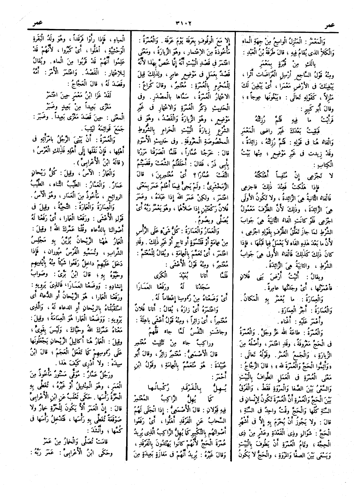 والمَعْمَرُ المَنْزِلُ الواسع من جهة الماء والكلإِ الذي يُقامُ فيه قال طرفة بن العبد يا لَكِ مِن قُبَّرةٍ بمَعْمَرِ ومنه قول الساجع أَرْسِل العُراضاتِ أَثَرا يَبْغِينَك في الأَرض مَعْمَرا أَي يبغين لك منزلاً كقوله تعالى يَبْغُونها عِوَجاً وقال أَبو كبير فرأَيتُ ما فيه فثُمَّ رُزِئْتِه فبَقِيت بَعْدَك غيرَ راضي المَعْمَرِ والفاء هناك في قوله فثُمَّ رُزِئته زائدة وقد زيدت في غير موضع منها بيت الكتاب لا تَجْزَعِي إِن مُنْفِساً أَهْلَكْتُه فإِذا هَلكتُ فعِنْدَ ذلك فاجْزَعِي فالفاء الثانية هي الزائدة لا تكون الأُولى هي الزائدة وذلك لأَن الظرف معمول اجْزَع فلو كانت الفاء الثانية هي جواب الشرط لما جاز تعلق الظرف بقوله اجزع لأَن ما بعد هذا الفاء لا يعمل فيما قبلها فإِذا كان ذلك كذلك فالفاء الأُولى هي جواب الشرط والثانية هي الزائدة ويقال أَتَيْتُ أَرضَ بني فلان فأَعْمَرْتُها أَي وجدتها عامِرةً والعِمَارةُ ما يُعْمَر به المكان والعُمَارةُ أَجْرُ العِمَارة وأَعْمَرَ عليه أَغناه والعُمْرة طاعة الله عز وجل والعُمْرة في الحج معروفة وقد اعْتَمر وأَصله من الزيارة والجمع العُمَر وقوله تعالى وأَتِمُّوا الحجَّ والعُمْرة لله قال الزجاج معنى العُمْرة في العمل الطوافُ بالبيت والسعيُ بين الصفا والمروة فقط والفرق بين الحج والعُمْرةِ أَن العُمْرة تكون للإِنسان في السَّنَة كلها والحج وقت واحد في السنة كلها والحج وقت واحد في السنة قال ولا يجوز أَن يحرم به إِلا في أَشهر الحج شوّال وذي القعدة وعشر من ذي الحجة وتمامُ العُمْرة أَن يطوف بالبيت ويسعى بين الصفا والمروة والحج لا يكون إِلاَّ مع الوقوف بعرفة يومَ عرفة والعُمْرة مأَخوذة من الاعْتِمار وهو الزيارة ومعنى اعْتَمر في قصد البيت أَنه إِنما خُصَّ بهذا لأَنه قصد بعمل في موضع عامر ولذلك قيل للمُحْرِم بالعُمْرةِ مُعْتَمِرٌ وقال كراع الاعْتِمار العُمْرة سَماها بالمصدر وفي الحديث ذكرُ العُمْرة والاعْتِمار في غير موضع وهو الزيارة والقصد وهو في الشرع زيارة البيت الحرام بالشروط المخصوصة المعروفة وفي حديث الأَسود قال خرجنا عُمّاراً فلما انصرفنا مَرَرْنا بأَبي ذَرٍّ فقال أَحَلَقْتم الشَّعَث وقضيتم التَّفَثَ عُمّاراً ؟ أَي مُعْتَمِرين قال الزمخشري ولم يجئ فيما أَعلم عَمَر بمعنى اعْتَمَر ولكن عَمَر اللهَ إِذا عبده وعَمَر فلانٌ ركعتين إِذا صلاهما وهو يَعْمُر ربَّه أَي يصلي ويصوم والعَمَار والعَمَارة كل شيء على الرأْس من عمامة أَو قَلَنْسُوَةٍ أَو تاجٍ أَو غير ذلك وقد اعْتَمَر أَي تعمّم بالعمامة ويقال للمُعْتَمِّ مُعْتَمِرٌ ومنه قول الأَعشى فَلَمَّا أَتانا بُعَيْدَ الكَرى سَجَدْنا لَهُ ورَفَعْنا العَمارا أَي وضعناه من رؤوسنا إِعْظاماً له واعْتَمرة أَي زارَه يقال أَتانا فلان مُعْتَمِراً أَي زائراً ومنه قول أَعشى باهلة وجاشَت النَّفْسُ لَمَّا جاءَ فَلُهمُ وراكِبٌ جاء من تَثْلِيثَ مُعْتَمِرُ قال الأَصمعي مُعْتَمِر زائر وقال أَبو عبيدة هو متعمم بالعمامة وقول ابن أَحمر يُهِلُّ بالفَرْقَدِ رُكْبانُها كما يُهِلُّ الراكبُ المُعْتَمِرْ فيه قولان قال الأَصمعي إِذا انْجلى لهم السحابُ عن الفَرْقَدِ أَهَلّوا أَي رفعوا أَصواتهم بالتكبير كما يُهِلّ الراكب الذي يريد عمرة الحج لأَنهم كانوا يهتدون بالفَرْقَد وقال غيره يريد أَنهم في مفازة بعيدة من المياه فإِذا رأَوْا فرقداً وهو ولد البقرة الوحشية أَهلّوا أَي كبّروا لأَنهم قد علموا أَنهم قد قربوا من الماء ويقال للاعْتِمار القصد واعْتَمَر الأَمْرَ أَمَّه وقصد له قال العجاج لقد غَزَا ابنُ مَعْمَرٍ حين اعْتَمَرْ مَغْزًى بَعِيداً من بَعيد وضَبَرْ المعنى حين قصد مَغْزًى بعيداً وضبَرَ جَمعَ قوائمه ليَثِبَ والعُمْرةُ أَن يَبْنِيَ الرجلُ بامرأَته في أَهلها فإِن نقلها إِلى أَهله فذلك العُرْس قاله ابن الأَعرابي والعَمَارُ الآسُ وقيل كل رَيْحانٍ عَمَارٌ والعَمّارُ الطَّيِّب 