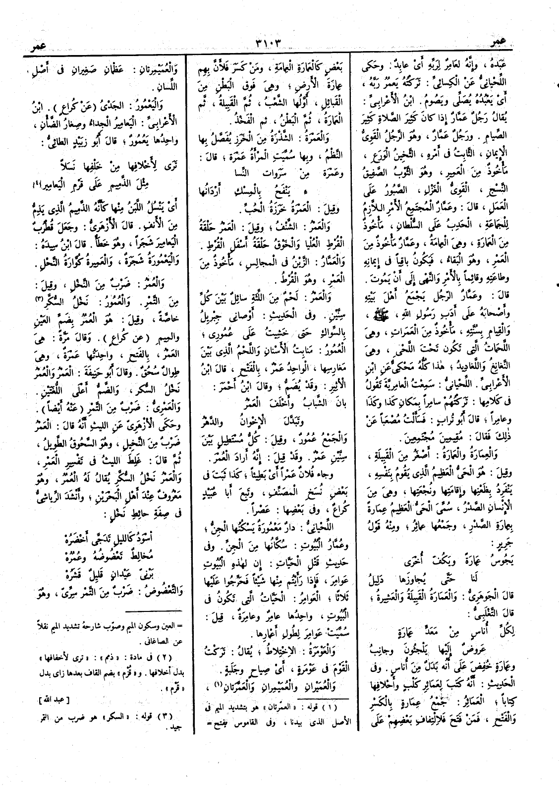وإِنه لعَامِرٌ لربّه أَي عابدٌ وحكى اللحياني عن الكسائي تركته يَعمرُ ربَّه أَي يعبده يصلي ويصوم ابن الأَعرابي يقال رجل عَمّار إِذا كان كثيرَ الصلاة كثير الصيام ورجل عَمّار وهو الرجل القوي الإِيمان الثابت في أَمره الثَّخينُ الوَرَعِ مأْخوذ من العَمِير وهو الثوب الصفيق النسجِ القويُّ الغزلِ الصبور على العمل قال وعَمّارٌ المجتمعُ الأَمر اللازمُ للجماعة الحَدِبُ على السلطان مأْخوذ من العَمارةِ وهي العمامة وعَمّارٌ مأْخوذ من العَمْر وهو البقاء فيكون باقياً في إِيمانه وطاعته وقائماً بالأَمر والنهي إِلى أَن يموت قال وعَمّارٌ الرجل يجمع أَهل بيته وأَصحابه على أَدَبِ رسول الله صلى الله عليه وسلم والقيامِ بسُنّته مأْخوذ من العَمَرات وهي اللحمات التي تكون تحت اللَّحْي وهي النَّغانِغُ واللَّغادِيدُ هذا كله محكى عن ابن الأَعرابي اللحياني سمعت العامِريّة تقول في كلامها تركتهم سامِراً بمكان كذا وكذا وعامِراً قال أَبو تراب فسأَلت مصعباً عن ذلك فقال مقيمين مجتمعين والعِمَارة والعَمارةُ أَصغر من القبيلة وقيل هو الحيُّ العظيم الذي يقوم بنفسه ينفرد بِظَعْنِها وإِقامتها ونُجْعَتِها وهي من الإِنسان الصدر سُمِّي الحيُّ العظيم عِمَارة بعِمارة الصدر وجمعها عمائر ومنه قول جرير يَجُوسُ عِمارة ويَكُفّ أُخرى لنا حتى يُجاوزَها دَليل قال الجوهري والعَمَارة القبيلة والعشيرة قال التغلبي لكل أُناسٍ من مَعَدٍّ عَمارةٍ عَرُوِّضٌ إِليها يَلْجأُون وجانِبُ وعَمارة خفض على أَنه بدل من أُناس وفي الحديث أَنه كتب لِعَمَائر كَلْب وأَحْلافها كتاباً العَمَائرُ جمع عمارة بالكسر والفتح فمن فتح فَلالْتفاف بعضهم على بعض كالعَمارة العِمامةِ ومن كسر فلأَن بهم عِمارةَ الأَرض وهي فوق البَطْن من القبائل أَولها الشَّعْب ثم القبيلة ثم العَِمارة ثم البَطْن ثم الفَخْذ والعَمْرة الشَّذْرة من الخرز يفصّل بها النظم وبها سميت المرأَة عَمْرة قال وعَمْرة مِن سَرَوات النسا ءِ يَنْفَحُ بالمِسْك أَرْدانُها وقيل العَمْرة خرزة الحُبّ والعَمْر الشَّنْف وقيل العَمْر حلقة القرط العليا والخَوْقُ حلقة أَسفل القرط والعَمَّار الزَّيْن في المجالس مأْخوذ من العَمْر وهو القرط والعَمْر لحم من اللِّثَة سائل بين كل سِنَّيْن وفي الحديث أَوْصاني جِبْرِيل بالسواك حتى خَشِيتُ على عُمورِي العُمُور منابت الأَسنان واللحم الذي بين مَغارِسها الواحد عَمْر بالفتح قال ابن الأَثير وقد يضم وقال ابن أَحمر بانَ الشَّبابُ وأَخْلَفَ العَمْرُ وتَبَدَّلَ الإِخْوانُ والدَّهْرُ والجمع عُمور وقيل كل مستطيل بين سِنَّيْنِ عَمْر وقد قيل إِنه أَراد العُمْر وجاء فلان عَمْراً أَي بطيئاً كذا ثبت في بعض نسخ المصنف وتبع أَبا عبيد كراع وفي بعضها عَصْراً اللحياني دارٌ مَعْمورة يسكنها الجن وعُمَّارُ البيوت سُكّانُها من الجن وفي حديث قتل الحيّات إِنّ لهذه البيوت عَوامِرَ فإِذا رأَيتم منها شيئاً فحَرِّجُوا عليها ثلاثاً العَوامِرُ الحيّات التي تكون في البيوت واحدها عامِرٌ وعامرة قيل سميت عَوامِرَ لطول أَعمارها والعَوْمَرةُ الاختلاطُ يقال تركت القوم في عَوْمَرةٍ أَي صياحٍ وجَلبة والعُمَيْرانِ والعُمَيْمِرانِ والعَمَّرتان