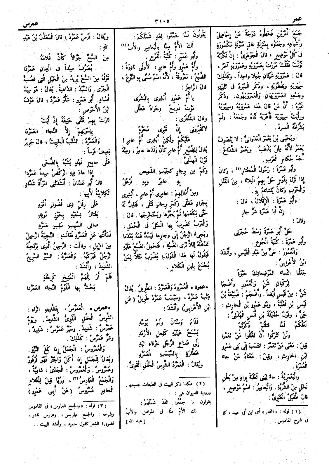 وكان إِذا نزل بقوم حلّ بهم البلاء من القتل والحرب وكان يُتَشاءم به وأَبو عَمْرة الإِقْلالُ قال إِن أَبا عَمْرة شرُّ جار وقال حلّ أَبو عَمْرة وَسْطَ حُجْرَتي وأَبو عَمْرة كنية الجوع والعُمُور حيٌّ من عبد القيس وأَنشد ابن الأَعرابي جعلنا النِّساءَ المُرْضِعاتِكَ حَبْوةً لِرُكْبانِ شَنٍّ والعُمُورِ وأَضْجَما شَنٌّ من قيس أَيضاً والأَضْجَم ضُبَيْعة بن قيس ابن ثعلبة وبنو عمرو بن الحرث حيّ وقول حذيفة بن أَنس الهذلي لعلكمُ لَمَّا قُتِلْتُم ذَكَرْتم ولن تَتْركُوا أَن تَقْتُلوا مَن تَعَمَّرا قيل معنى مَن تَعَمَّر انتسب إِلى بني عمرو بن الحرث وقيل معناه من جاء العُمْرة واليَعْمَريّة ماء لبني قعلبة بوادٍ من بطن نخل من الشَّرَبّة واليَعامِيرُ اسم موضع قال طفيل الغنوي يقولون لمّا جَمّعوا لغدٍ شَمْلَكم لك الأُمُّ مما باليَعامِير والأَبُ