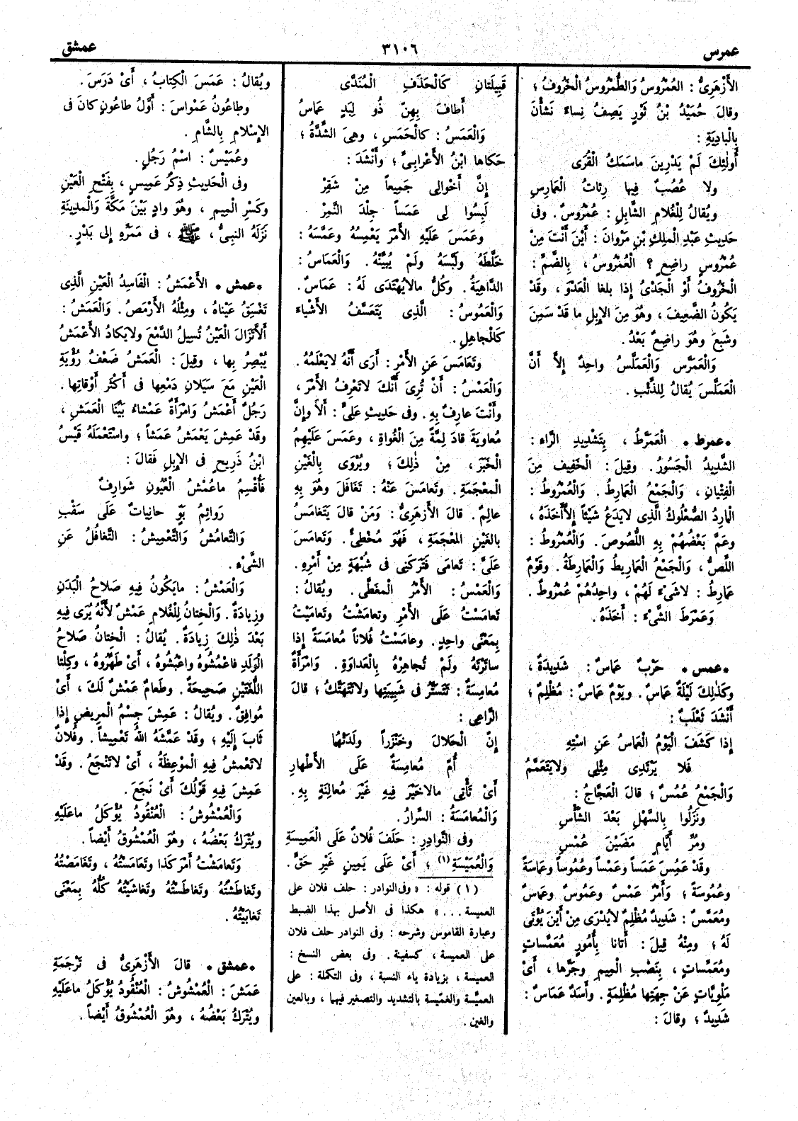 ( عمش ) الأَعْمَشُ الفاسد العين الذي تَغْسَِقُ عيناه ومثله الأَرْمَصُ والعَمَشُ أَن لا تزالَ العين تُسِيل الدمع ولا يَكادُ الأَعْمشُ يُبْصِرُ بها وقيل العَمَش ضَعْفُ رؤية العين مع سيلانِ دمعها في أَكثر أَوقاتِها رجل أَعْمَشُ وامرأَة عَمْشاءُ بيِّنا العَمَشِ وقد عَمِشَ يَعْمَشُ عَمَشاً واستعمله قيس بن ذريح في الإِبل فقال فأُقْسِم ما عُمْشُ العُيونِ شَوارِفٌ رَوائِمُ بَوٍّ حانِياتٌ على سَقْبِ والتَّعامُشُ والتَعْمِيشُ التغافلُ عن الشيء والعَمْشُ ما يكون فيه صلاحُ البدنِ وزيادةٌ والخِتانُ للغلام عَمْشٌ لأَنه يُرًى فيه بعد ذلك زيادةٌ يقال الخِتانُ صلاحُ الولدِ فاعْمُشُوه واعْبُشُوه أَي طَهِّرُوه وكلتا اللغتين صحيحةً وطعام عَمْشٌ لك أَي مُوافقٌ ويقال عَمِشَ جسمُ المريض إِذا ثَابَ إِليه وقد عَمَّشَه اللَّه تَعْمِيشاً وفلان لا تَعْمَشُ فيه الموعظةُ َي لا تَنْجَع وقد عَمِشَ فيه قولُك أَي نَجَع والعُمْشوشُ العُنْقود يؤكل ما عليه ويُتْرك بعضُه وهو العُمْشُوق أَيضاً وتَعامَشْتُ أَمْرَ كذا وتَعَامَسْته وتَغَامَصْته وتَغاطَشْته وتَغاطَسْته وتَغاشَيته كله بمعنى تغابَيْتُه