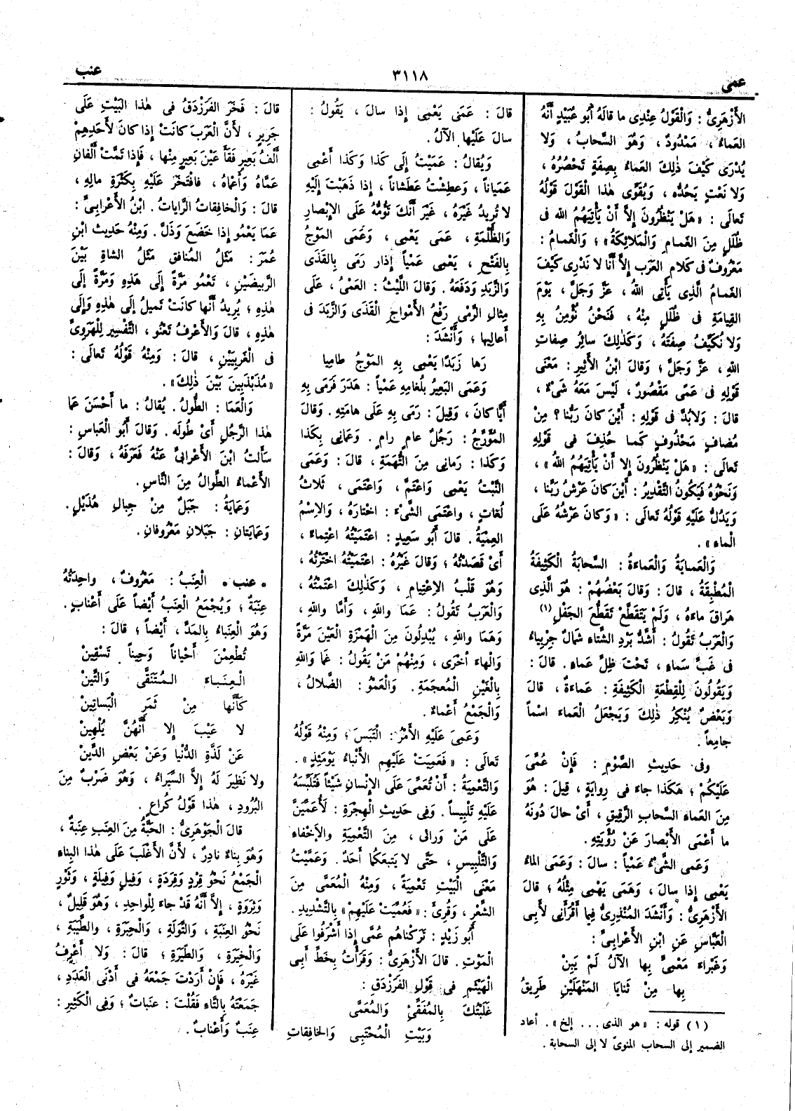 الأَزهري والقولُ عندي ما قاله أَبو عبيد أَنه العَماءُ ممدودٌ وهو السحابُ ولا يُدْرى كيف ذلك العَماء بصفةٍ تَحْصُرُه ولا نَعْتٍ يحدُّه ويُقَوِّى هذا القولَ قولُه تعالى هل يَنْظُرون إِلا أَن يأْتِيَهُم الله في ظُلَلٍ من الغَمام والملائكة والغَمام معروفٌ في كلام العرب إِلا أَنَّا لا ندْري كيف الغَمامُ الذي يأْتي الله عز وجل يومَ القيامة في ظُلَلٍ منه فنحن نُؤْمن به ولا نُكَيِّفُ صِفَتَه وكذلك سائرُ صِفاتِ الله عز وجل وقال ابن الأَثير معنى قوله في عَمًى مقصورٌ ليسَ مَعَه شيءٌ قال ولا بد في قوله أَين كان ربنا من مضاف محذوف كما حزف في قوله تعالى هل ينظرون إِلا أَن يأْتيهم الله ونحوه فيكون التقدير أَين كان عرش ربّنا ويدلّ عليه قوله تعالى وكانَ عرْشُه على الماء والعَمايَةُ والعَماءَة السحابَةُ الكثِيفة المُطْبِقَةُ قال وقال بعضهم هو الذي هَراقَ ماءَه ولم يَتَقَطَّع تَقَطُّع الجَفْل