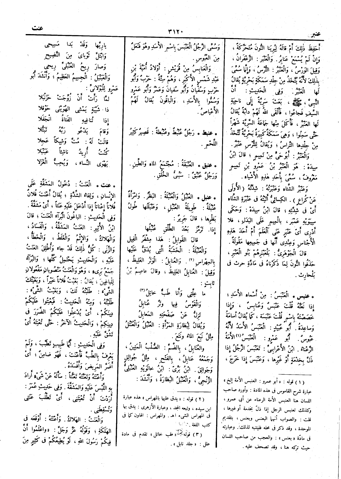 ( * قوله « أَبو عمرو العنبس الأمة إلخ » عبارة شرح القاموس في هذه المادة وأَورد صاحب اللسان هنا العنبس الأمة الرعناء عن أَبي عمرو وكذلك تعنبس الرجل إذا ذلّ بخدمة أَو غيرها قلت والصواب أنهما البعنس وبعنس بتقديم الموحدة وقد ذكر في محله فليتنبه لذلك ) الأَمة الرَّعْناء ابن الأَعرابي تَعَنْبَس الرجل إِذا ذلَّ بخدمة أَو غيرها وعَنْبَس إِذا خرَج وسُمِّي الرجل العَنْبَس باسم الأَسَد وهو فنعل من العُبُوس والعَنابِس من قُرَيْش أَولادُ أُمَيَّة بنِ عبد شمس الأَكبر وهم ستة حَرْبٌ وأَبو حَرْبٍ وسُفْيان وأَبو سُفيان وعَمرو وأَبو عمرو وسُمُّوا بالأَسد والباقون يقال لهم الأَعْياصُ
