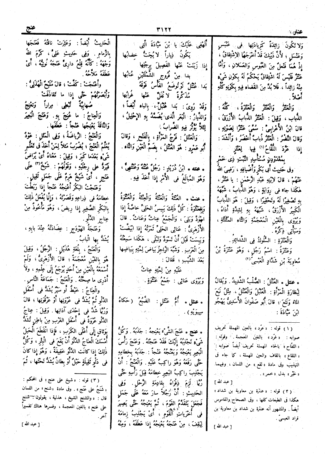 ولا تكون زائدة كزيادتها في عَنْبَس وعَنْسَلٍ لأَن ذينك قد أَخرجهما الاشتقاق إِذا هما فَنْعل من العُبُوس والعَسَلان وأَما عَنْتر فليس له اشتقاق يحكم له بكون شيء منه زائداً فلا بدّ من القضاء فيه بكونه كله أَصلاً والعَنْتَر والعُنْتَر والعَنْتَرةُ كله الذباب وقيل العَنْتَر الذباب الأَزرق قال ابن الأَعرابي سمي عَنْتراً لصوته وقال النضر العَنْتَرُ ذُباب أَخضر وأَنشد إِذا عرّد اللُّفَّاحُ فيها لِعَنْترٍ بمُغْدَوْدِنٍ مُسْتَأْسِدِ النَّبْت ذي خمر وفي حديث أَبي بكر وأَضيافِه رضي الله عنهم قال لابنه عبد الرحمن يا عَنْتر هكذا جاء في رواية وهو الذباب شبّهه به تصغيراً له وتحقيراً وقيل هو الذباب الكبير الأَزرق شبّهه به لشدة أَذاه ويروى بالغين المعجمة والثاء المثلثة وسيأْتي ذكره والعَنْتَرَةُ السلوك في الشدائد وعَنْتَرة اسم رجل وهو عنترة بن معاوية بن شدّاد العبسي ( عنتل ) العُنْتُل الصُّلْب الشديد ويقال لبُظارة المرأَة العُنْبُل والعُنْتُل مثل نَبَع الماءُ ونَتَع قال أَبو صفوان الأَسدي يهجو ابن مَيَّادة أَلَهْفي عليْك يا ابن مَيَّادةَ التي يكون ذِياراً لا يُحَتُّ خِضَابُها إِذا زَبَنَتْ عنها الفَصِيلَ برِجْلِها بدا من فُروج الشَّمْلَتَين عُنَابُها بدا عُنْتُلٌ لو تُوضَع الفَأْسُ فَوقه مُذَكَّرةً لانْفَلَّ عنها غُرابُها وقد روي بدا عُنْبُلٌ بالباء أَيضاً والذِّيار البَعَر الذي يُضَمَّد به الإِحْلِيل لئلا يؤثِّر فيه الضِّراب والعَنْتَل فَرْجُ المرأَة بالفتح وقال أَبو عمرو هو العُنْتُل بضم العين والتاء ( عنته ) ابن دريد رجل عُنْتُهٌ وعُنْتُهِىٌّ وهو المُبالِغُ في الأمرِ إذا أَخذَ فيه ( عنث ) العُنْثَةُ والعَنْثَةُ والعِنْثَةُ والعُنْثُوَةُ والعَنْثُوَةُ كلُّ ذلك يَبيسُ الحَلِيِّ خاصَّةً إِذا اسْوَدَّ وبَلِيَ والجمع عِناثٌ وعَناثٍ قال الأَزهري عَنَاثي الحَلِيِّ ثَمَرَتُه إِذا ابْيَضَّت ويَبِسَتْ قبل أَني تَسْوَدَّ وتَبْلَى هكذا سمعته من العرب وشَبَّهَ الراجزُ بياضَ لِمَّتِه ببياضِها بعد الشَّيْبِ فقال عليه مِنْ لِمَّتِهِ عِنَاثُ ويروى عَناثي جمع عَنْثُوَة