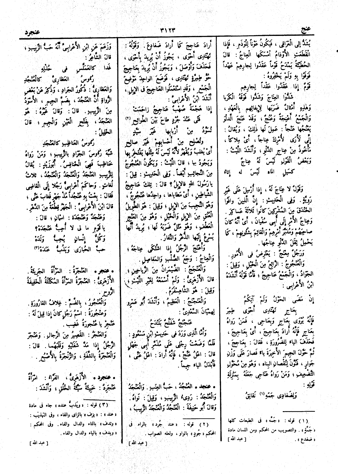 ( عنجد ) العُنْجُدُ حبُّ العنب والعَنْجَدُ والعُنْجَدُ رَديءُ الزَّبيب وقيل نواه وقال أَبو حنيفة العُنْجُدُ والعُنْجَدُ الزبيبُ وزعم عن ابن الأَعرابي أَنه حب الزبيب قال الشاعر غَدا كالعَسَلَّسِ في حُذْلِهِ رُؤُوسُ العَظارِيِّ كالعُنْجُدِ والعَظارِيُّ ذكورُ الجراد وذكر عن بعض الرواة أَن العنجُد بضم الجيم الأَسود من الزبيب قال وقال غيره هو العَنْجَدُ بفتح العين والجيم قال الخليل رُؤُوسُ العَناظِبِ كالعَنْجَدِ شبَّه رؤُوس الجراد بالزبيب ومن رواه خَناظِب فهي الخنافِسُ أَبو زيد يقال للزبيب العَنْجَدُ والعُنْجَدُ والعُنْجُدُ ثلاث لغات وحاكم أَعرابي رجلا إِلى القاضي فقال بعت به عُنْجُداً مُذْ جَهْرٍ فغاب عني قال ابن الأَعرابي الجهر قِطْعَةٌ من الدَّهْرِ وعَنْجَدٌ وعَنْجَدَةُ اسمان قال يا قومِ ما لي لا أُحِبُّ عَنْجَدَه ؟ وكلُّ إِنسانٍ يُحِبُّ وَلَدَه حُبَّ الحُبارى ويَذُبُّ عَنَدَه ( عنجر ) العَنْجَرة المرأَة الجَرِيئة الأَزهري العَنْجَرة المرأَة المُكَتَّلة الخفيفة الروح والعُنْجورُ بالضم غلافُ القارورة وعُنْجورةُ اسم رجل كان إِذا قيل له عَنْجِرْ يا عُنْجور غَضِب والعَنْجَر القصير من الرجال وعَنْجَر الرجلُ إِذا مدّ شفتيه وقَلَبهما قال والعَنْجَرة بالشفة والزَّنْجَرة بالأُصبع