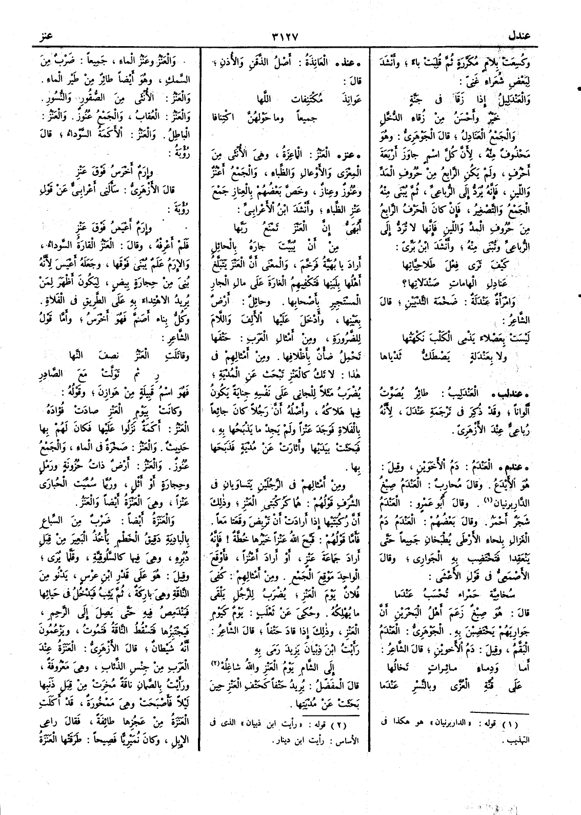 ( عندلب ) العَنْدَلِيبُ طائرٌ يُصَوِّتُ أَلواناً وسنذكره في ترجمة عندل لأَنه رباعي عند الأَزهري ( عندم ) العَنْدَمُ دَمُ الأَخَوَيْنِ وقيل هو الأَيْدَعُ وقال محارب العَنْدَم صِبْغ الداربرنيان وقال أَبو عمرو العَنْدَمُ شجر أَحمر وقال بعضهم العَنْدَمُ دمُ الغَزال بِلِحاء الأَرْطى يطبخان جميعاً حتى ينعقدا فتختضب به الجواري وقال الأَصمعي في قول الأَعشى سُخامِيَّة حمراء تُحْسَبُ عَنْدَما قال هو صِبْغٌ زعم أَهل البحرين أَن جواريهم يختضبن به الجوهري العَنْدَمُ البَقَّمُ وقيل دم الأَخوين قال الشاعر أَما وَدِماءٍ مائراتٍ تَخالُها على قُنَّةِ العُزَّى وبالنَّسْرِ عَنْدَما ( عنذ ) العَانِذَة أَصل الذَّقَنِ والأُذُنُ قال عَوانذِ مُكْنِفات اللَّها جميعاً وما حولهن اكتنافا ( عنز ) العَنْزُ الماعِزَةُ وهي الأُنثى من المِعْزَى والأَوْعالِ والظِّباءِ والجمع أَعْنُزٌ وعُنُوزٌ وعِنازٌ وخص بعضهم بالعِنازِ جمع عَنْزِ الظِّباءِ وأَنشد ابن الأَعرابي أبُهَيُّ إِنَّ العَنْزَ تَمْنَع رَبَّها مِن أَنْ يُبَيِّتَ جارَهُ بالحائِل أَراد يا بُهَيَّةُ فرخَّم والمعنى أَن العنز يتبلغ أَهلُها بلبنها فتكفيهم الغارةَ على مال الجار المستجير بأَصحابها وحائل أَرض بعينها وأَدخل عليها الأَلف واللام للضرورة ومن أَمثال العرب حَتْفَها تَحْمِلُ ضأْنٌ بأَظلافها ومن أَمثالهم في هذا لا تَكُ كالعَنْزِ تَبْحَثُ عن المُدْيَةِ يضرب مثلاً للجاني على نفسه جناية يكون فيها هلاكه وأَصله أَن رجلاً كان جائعاً بالفلاة فوجد عنزاً ولم يجد ما يذبحها به فبحثت بيديها وأَثارت عن مدية فذبحها بها ومن أَمثالهم في الرجلين يتساويان في الشرف قولهم هما كَرُكْبَتَيِ العَنْزِ وذلك أَن ركبتيها إِذا أَرادت أَن تَرْبِضَ وقعتا معاً فأَما قولهم قَبَّحَ اللهُ عَنْزاً خَيْرُها خُطَّةٌ فإِنه أَراد جماعة عَنْزٍ أَو أَراد أَعْنُزاً فأَوقع الواحد موقع الجمع ومن أَمثالهم كُفِيَ فلانٌ يومَ العَنْزِ يضرب للرجل يَلْقَى ما يُهْلِكُه وحكي عن ثعلب يومٌ كيومِ العَنْزِ وذلك إِذا قاد حَتْفاً قال الشاعر رأَيتُ ابنَ ذِبْيانَ يَزِيدَ رَمَى به إِلى الشام يومُ العَنْزِ واللهُ شاغِلُهْ