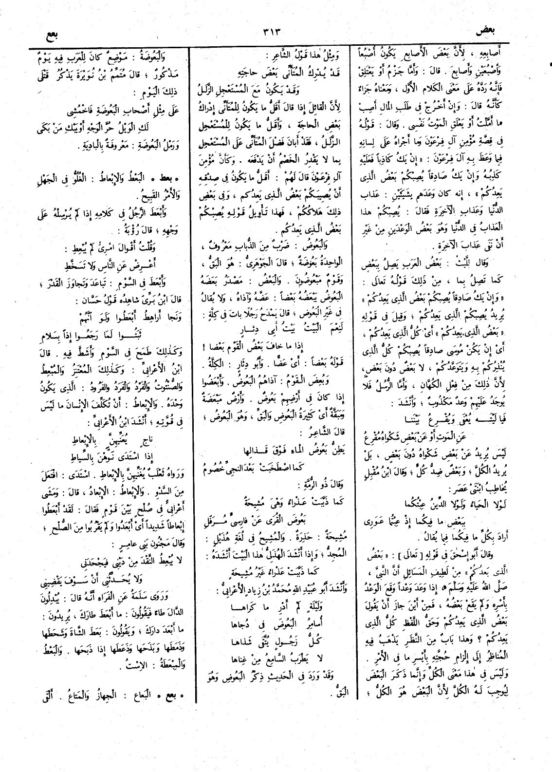 أَصابعه لأَن بَعْض الأَصابع يكون أُصبعاً وأُصبعين وأَصابع قال وأَما جزم أَو يَعْتَلِقْ فإِنه رَدَّهُ على معنى الكلام الأَول ومعناه جزاء كأَنه قال وإِن أَخرجْ في طلب المال أُصِبْ ما أَمَّلْت أَو يَعْلَق الموتُ نفسي وقال قوله في قصة مؤمن آلِ فرعون وما أَجراه على لسانه فيما وعظ به آل فرعون إِن يَكُ كاذباً فعليه كَذِبُه وإِن يَكُ صادقاً يُصِبْكُم بَعْضُ الذي يَعِدُكم إِنه كان وَعَدَهم بشيئين عذاب الدنيا وعذاب الآخرة فقال يُصِبْكم هذا العذاب في الدنيا وهو بَعْضُ الوَعْدَينِ من غير أَن نَفى عذاب الآخرة وقال الليث بعض العرب يَصِلُ بِبَعْضٍ كما تَصِلُ بما من ذلك قوله تعالى وإِن يَكُ صادِقاً يُصِبْكُم بَعْضُ الذي يعدكم يريد يصبكم الذي يعدكم وقيل في قوله بَعْضُ الذي يعدكم أَي كلُّ الذي يعدكم أَي إِن يكن موسى صادقاً يصبكم كل الذي يُنْذِرُكم به وبتوَعّدكم لا بَعْضٌ دونَ بَعضٍ لأَن ذلك مِنْ فعل الكُهَّان وأَما الرسل فلا يُوجد عليهم وَعْدٌ مكذوب وأَنشد فيا ليته يُعْفى ويُقرِعُ بيننا عنِ المَوتِ أَو عن بَعْض شَكواه مقْرعُ ليس يريد عن بَعْضِ شكواه دون بَعْضٍ بل يريد الكل وبَعْضٌ ضدُّ كلٍّ وقال ابن مقبل يخاطب ابنتي عَصَر لَوْلا الحَياءُ ولولا الدِّينُ عِبْتُكما بِبَعْضِ ما فِيكُما إِذْ عِبْتُما عَوَري أٌَّاد بكل ما فيكما فيما يقال وقال أَبو إِسحق في قوله بَعْضُ الذي يعدكم من لطيف المسائل أَن النبي صلّى اللّه عليه وسلّم إِذا وَعَدَ وعْداً وقع الوَعْدُ بأَسْرِه ولم يقع بَعْضُه فمن أَين جاز أَن يقول بَعْضُ الذي يَعدكم وحَقُّ اللفظ كلُّ الذي يعدكم ؟ وهذا بابٌ من النظر يذهب فيه المناظر إِلى إِلزام حجته بأَيسر ما في الأَمر وليس في هذا معنى الكل وإِنما ذكر البعض ليوجب له الكل لأَن البَعْضَ هو الكل ومثل هذا قول الشاعر قد يُدْرِكُ المُتَأَنّي بَعْضَ حاجتِه وقد يكونُ مع المسْتَعْجِل الزَّلَلُ لأَن القائل إِذا قال أَقلُّ ما يكون للمتأَني إِدراكُ بَعْضِ الحاجة وأَقلُّ ما يكون للمستعجل الزَّلَلُ فقد أَبانَ فضلَ المتأَني على المستعجل بما لا يَقْدِرُ الخصمُ أَن يَدْفَعَه وكأَنّ مؤمنَ آل فرعون قال لهم أَقلُّ ما يكون في صِدْقه أَن يُصِيبَكم بعضُ الذي يَعِدكم وفي بعض ذلك هلاكُكم فهذا تأْويل قوله يُصِبْكم بَعْضُ الذي يَعِدُكم والبَعُوض ضَرْبٌ من الذباب معروف الواحدة بَعُوضة قال الجوهري هو البَقّ وقوم مَبْعُوضُونَ والبَعْضُ مَصْدر بَعَضَه البَعُوضُ يَبْعَضُه بَعْضاً عَضَّه وآذاه ولا يقال في غير البَعُوض قال يمدح رجلاً بات في كِلّة لَنِعْم البَيْتُ بَيْتُ أَبي دِثارٍ إِذا ما خافَ بَعْضُ القومَ بَعْضا قوله بَعْضا أَي عَضّاً وأَبو دِثَار الكِّلة وبُعِضَ القومُ آذاهم البَعُوضُ وأَبْعَضُوا إِذا كان في أَرضهم بَعُوضٌ وأَرض مَبْعَضة ومَبَقّة أَي كثيرة البَعُوضِ والبَقّ وهو البَعُوضُ قال الشاعر يَطِنُّ بَعُوضُ الماء فَوْقَ قَذالها كما اصطَخَبَتْ بعدَ النَجِيِّ خُصومُ وقال ذو الرمة كما ذبّبَتْ عَذْراء وهي مُشِيحةٌ بَعُوض القُرى عن فارِسيٍّ مُرَفّل مُشيحة حَذِرة والمُشِحُ في لغة هذيل المُجدُّ وإِذا أَنشد الهذلي هذا البيت أَنشده كما ذببت عذراء غير مشيحة وأَنشد أَبو عبيداللّه محمد بن زياد الأَعرابي ولَيْلة لم أَدْرِ ما كراها أُسامِرُ البَعُوضَ في دجاها كلّ زجُولٍ يُتَّقَى شَذاها لا يَطْرَبُ السامعُ من غِناها وقد ورد في الحديث ذكرُ البَعُوض وهو البقّ والبَعُوضة موضع كان للعرب فيه يوم مذكور قال متمم بن نويرة يذكر قتلى ذلك اليوم على مثل أَصحابِ البعوضة فاخْمُشِي لَكِ الويلُ حُرَّ الوجه أَو يَبْكِ مَن بكى ورَمْل البَعُوضة معروفة بالبادية