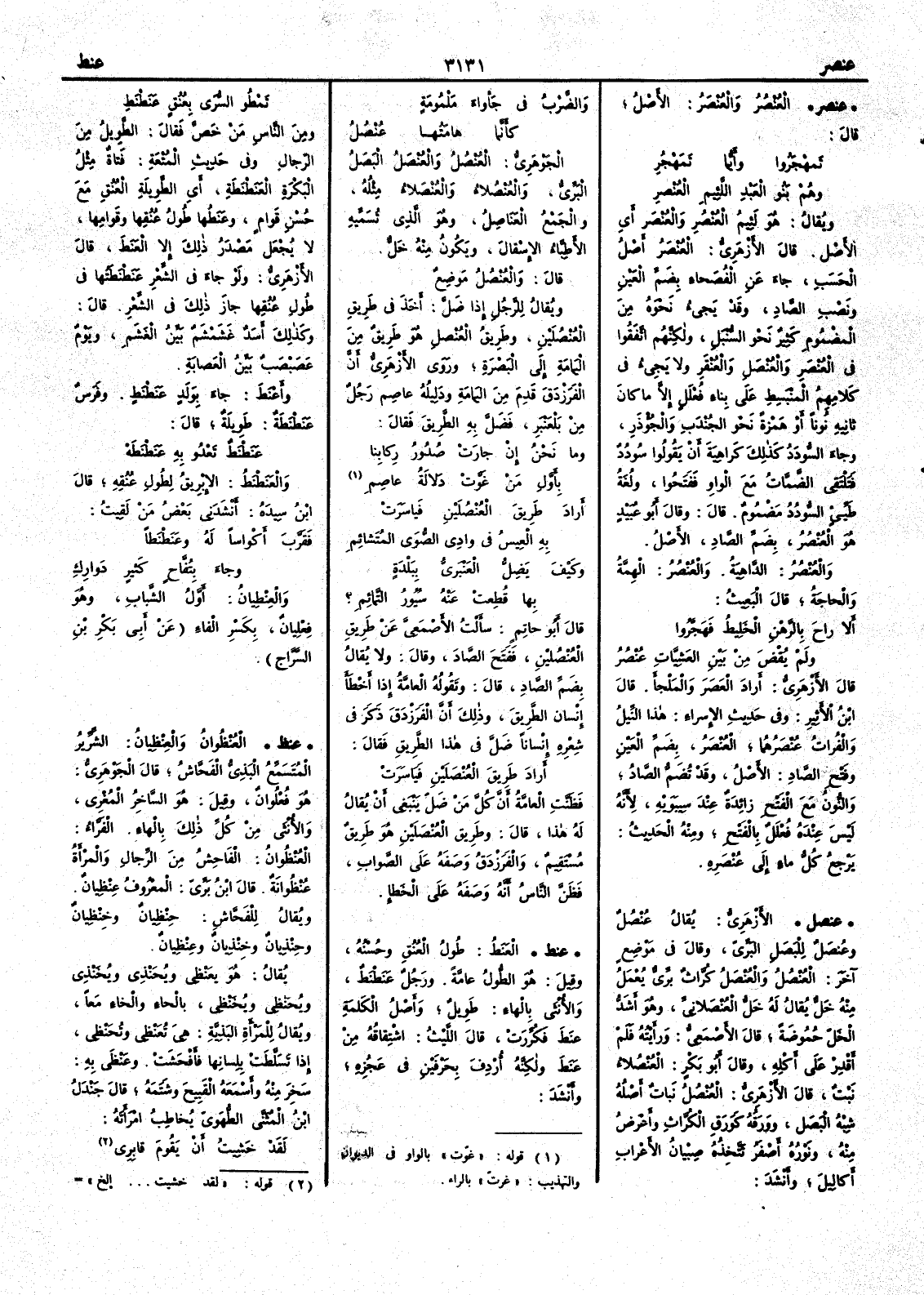 ( عنصر ) العُنْصُر والعُنْصَر الأَصل قال تَمَهْجَرُوا وأَيُّما تَمَهْجُرِ وهم بنو العَبْد اللئيمِ العُنْصرِ ويقال هو لَئِيم العُنْصُر والعُنْصَر أَي الأَصل قال الأَزهري العُنْصَرُ أَصل الحسب جاءَ عن الفصحاء بضم العين ونصْب الصاد وقد يجيء نحوَه من المضموم كثيرٌ نحو السُّنْبَل ولكنهم اتفقوا في العُنْصَر والعُنْصَل والعُنْقَر ولا يجيء في كلامهم المنبسط على بناء فُعْلَلٍ إِلا ما كان ثانيه نوناً أَو همزة نحو الجُنْدَب والجُؤْذَرِ وجاء السُّودَدُ كذلك كراهية أَن يقولوا سُودُدٌ فتلتقي الضمات مع الواو ففتحوا ولغة طيء السُّودُدُ مضموم قال وقال أَبو عبيد هو العُنْصُر بضم الصاد الأَصْلُ والعُنْصُر الداهية والعُنْصُر الهِمَّة والحاجةُ قال البعيث أَلا راحَ بالرَّهْنِ الخليطُ فَهَجَرّوا ولم يُقْضَ من بين العَشِيَّاتِ عُنْصُرُ قال الأَزهري أَراد العَصَرَ والمَلْجأَ قال ابن الأَثير وفي حديث الإِسراء هذا النيل والفُرات عُنْصَرُهما العُنْصَر بضم العين وفتح الصاد الأَصل وقد تضم الصاد والنونُ مع الفتح زائدة عند سيبويه لأَنه ليس عنده فُعْلَل بالفتح ومنه الحديث يَرْجِعُ كلّ ماءٍ إِلى عُنْصَره ( عنصل ) الأَزهري يقال عُنْصُل وعُنْصَل للبَصَل البَرِّي وقال في موضع آخر العُنْصُل والعُنْصَل كُرَّاث بَرِّي يُعْمَل منه خَلٌّ يقال له خَلُّ العُنْصُلانيّ وهو أَشدُّ الخَلِّ حُموضةً قال الأَصمعي ورأَيته فلم أَقدر على أَكله وقال أَبو بكر العُنْصُلاء نبت قال الأَزهري العُنْصُل نبات أَصله شبه البَصَل ووَرَقه كورق الكُرَّاث وأَعْرَضُ منه ونَوْره أَصفر تتخذه صبيان الأَعراب أَكالِيل وأَنشد والضَّرْبُ في جَأْواءَ مَلْمومةٍ كأَنَّما هامَتُها عُنْصُل الجوهري العُنْصُلُ والعُنْصَل البَصَل البرِّي والعُنْصُلاءُ والعُنْصَلاء مثله والجمع العَنَاصِل وهو الذي تسميه الأَطباء الإِسْقال ويكون منه خَلٌّ قال والعُنْصُل موضع ويقال للرجل إِذا ضَلَّ أَخذ في طريق العُنْصُلَيْن وطريق العُنْصُل هو طريق من اليمامة إِلى البصرة وروى الأَزهري أَن الفرزدق قَدِم من اليمامة ودَلِيلُه عاصمٌ رجلٌ من بَلْعَنْبَر فضَلَّ به الطريقَ فقال وما نحْنُ إِن جارت صُدورُ رِكابنا بأَوَّلِ مَنْ غَوَّتْ دَلالةُ عاصم أَرادَ طَريقَ العُنْصُلَيْن فياسَرَتْ به العِيسُ في وادي الصُّوَى المُتَشائم وكيْفَ يَضِلُّ العَنْبَريُّ ببَلْدةٍ بها قُطِعَتْ عنه سُيورُ التَّمائِم ؟ قال أَبو حاتم سأَلت الأَصمعي عن طريق العُنْصُلين ففتح الصاد قال ولا يقل بضم الصاد قال وتقول العامة إِذا أَخطأَ إِنسان الطريق وذلك أَن الفرزدق ذكر في شعره إِنساناً ضَلَّ في هذا الطريق فقال أَراد طريق العُنْصَلَينِ فيَاسَرَتْ فظنت العامة أَن كل من ضَلَّ ينبغي أَن يقال له هذا قال وطريق العُنْصَلين هو طريق مستقيم والفرزدق وَصَفَه على الصواب فظن الناس أَنه وَصَفَه على الخطإِ ( عنط ) العَنَطُ طولُ العُنُق وحُسْنُه وقيل هو الطُّول عامَّة ورجُل عَنَطْنَطٌ والأُنثى بالهاء طويل وأَصل الكلمة عنط فكرّرت قال الليث اشتقاقه من عنط ولكنه أُرْدِفَ بحرفين في عَجُزه وأَنشد تَمْطُو السُّرى بِعُنقٍ عَنَطْنَطِ ومن الناس مَن خَصّ فقال الطويل من الرّجال وفي حديث المُتْعةِ فتاة مِثْل البَكْرةِ العَنَطْنَطة أَي الطويلة العُنُق مع حُسْن قوَام وعَنَطُها طُولُ عُنقِها وقَوامها لا يُجعل مصدر ذلك إِلا العَنَط قال الأَزهري ولو جاءَ في الشعر عَنَطْنَطَتُها في طول عُنُقِها جاز ذلك في الشعر قال وكذلك أَسد غَشَمْشَمٌ بَيِّنُ الغَشَم ويوم عَصَبْصَبٌ بَيِّنُ العَصابةِ وأَعْنَطَ جاء بولد عَنَطْنَط وفرس عَنَطْنَطةٌ طويلة قال عَنَطْنَط تَعْدُو به عَنَطْنَطَهْ والعَنَطْنَطُ الإِبْرِيقُ لطُول عُنُقِه قال ابن سيده أَنشدني بعضُ من لقيت فَقَرَّبَ أَكْواساً له وعَنَطْنَطاً وجاءَ بتُفَّاحٍ كَثيرٍ دَوارِكِ والعِنْطِيانُ أَوَّلُ الشَّبابِ وهو فِعْلِيانٌ بكسر ال