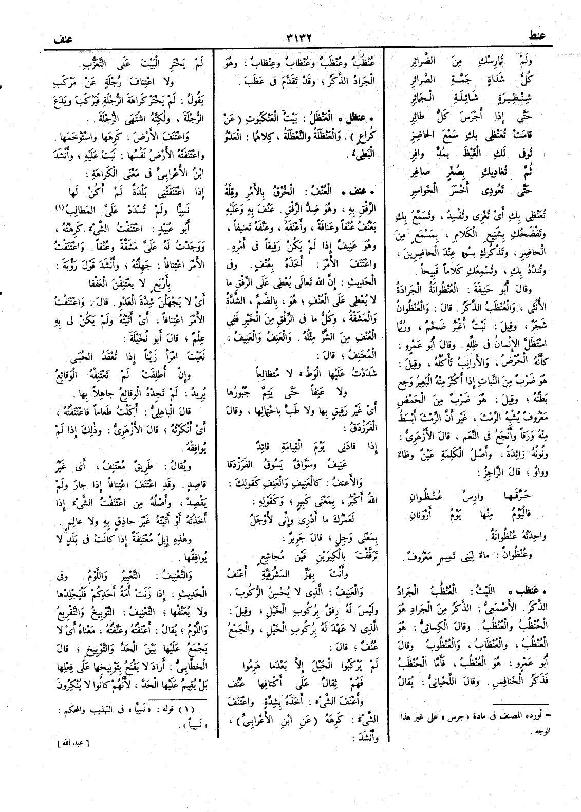 ولم تُمارِسْكِ من الضَّرائرِ كلُّ شَذاةٍ جَمّةِ الصَّرائرِ شِنْظِيرةٍ سائلةِ الجَمائرِ حتى إِذا أَجْرَسَ كلُّ طائرِ قامَتْ تُعَنْظِي بكِ سَمْع الحاضِرِ تُوفِي لَكِ الغَيْظَ بمُدٍّ وافِرِ ثم تُغادِيكِ بصُغْرٍ صاغِرِ حتى تَعُودِي أَخْسَرَ الخَواسِرِ تُعَنْظِي بك أَي تُغْرِي وتُفْسِد وتُسَمِّع بك وتَفْضَحُك بشَنِيع الكلام بِمَسْمَع من الحاضر وتذْكُركِ بسُوء عند الحاضرين وتُنَدِّدُ بك وتُسمعكِ كلاماً قبيحاً وقال أَبو حنيفة العُنْظوانة الجرادة الأُنثى والعُنْظَّبُ الذكر قال والعُنْظُوان شجر وقيل نبت أَغبرُ ضخْم وربما استظَلَّ الإِنسان في ظلِّه وقال أَبو عمرو كأَنه الحُرْضُ والأَرانِبُ تأْكله وزقيل هو ضرب من النبات إِذا أَكثر منه البعير وَجِعَ بطنُه وقيل هو ضرب من الحَمْض معروف يشبه الرِّمْثَ غير أَنّ الرّمْث أَبْسَطُ منه ورَقاً وأَنْجَعُ في النَّعَم قال الأَزهري ونونه زائدة وأَصل الكلمة عين وظاء وواو قال الراجز حَرَّقَها وارِسُ عُنْظُوانِ فاليومُ منها يوْمُ أَرْوَنانِ واحدته عُنْظُوانة وعُنْظوان ماء لبني تَميم معروف ( عنظب ) الليث العُنْظُبُ الجَرادُ الذَّكَر الأَصمعي الذَّكَرُ من الجَراد هو الحُنْظُبُ والعُنْظُبُ وقال الكسائي هو العُنْظُب والعُنْظَابُ والعُنْظُوبُ وقال أَبو عمرو هو العُنْظُبُ فأَما الحُنْظَبُ فذَكَرُ الخَنافس وقال اللحياني يقال عُنْظُبٌ وعُنْظَبٌ وعُنْظابٌ وعِنْظابٌ وهو الجراد الذكر وقد تقدّم في عظب ( عنظل ) العَنْظَل بيت العنكبوت عن كراع والعَنظَلة والنَّعْظَلة كلاهما العَدْو البطيء ( عنف ) العُنْف الخُرْقُ بالأَمر وقلّة الرِّفْق به وهو ضد الرفق عَنُفَ به وعليه يَعْنُفُ عُنْفاً وعَنافة وأَعْنَفه وعَنَّفه تَعْنيفاً وهو عَنِيفٌ إذا لم يكن رَفيقاً في أَمره واعْتَنَفَ الأَمرَ أَخذه بعُنف وفي الحديث إن اللّه تعالى يُعْطِي على الرِّفْق ما لا يُعطي على العنف هو بالضم الشدة والمَشَقّة وكلُّ ما في الرفق من الخير ففي العنف من الشرّ مثله والعَنِفُ والعَنِيفُ المُعتَنِف قال شَدَدْت عليه الوَطْء لا مُتظالِعاً ولا عَنِفاً حتى يَتِمَّ جُبُورُها أَي غير رَفِيق بها ولا طَبّ باحتمالها وقال الفرزدق إذا قادَني يومَ القِيامة قائدٌ عَنِيفٌ وسَوَّاقٌ يَسوقُ الفَرَزْدَقا والأَعنفُ كالعَنِيف والعَنِفِ كقولك اللّه أَكبر بمعنى كبير وكقوله لعَمْرُك ما أَدْري وإني لأَوْجَلُ بمعنى وَجِل قال جرير تَرَفَّقْتَ بالكِيرَينِ قَيْنَ مُجاشعٍ وأَنت بهَزِّ المَشْرَفِيّةِ أَعْنَفُ والعَنِيفُ الذي لا يُحسن الركوب وليس له رفق بركوب الخيل وقيل الذي لا عهد له بركوب الخيل والجمع عُنُفٌ قال لم يَرْكَبُوا الخيلَ إلا بعدَما هَرِمُوا فهم ثِقالٌ على أَكْتافِها عُنُف وأَعْنف الشيءَ أَخذه بشدَّة واعتنف الشيءَ كرهه عن ابن الأَعرابي وأَنشد لم يَخْتَرِ البيتَ على التَّعَزُّبِ ولا اعْتِنافَ رُجْلةٍ عن مَرْكَبِ يقول لم يختر كراهةَ الرُّجْلة فيركب ويدَع الرُّجلة ولكنه اشتهى الرجلة واعْتَنَف الأَرضَ كَرِهَها واسْتَوخَمها واعْتَنَفَتْه الأَرضُ نفْسُها نَبَتْ عليها