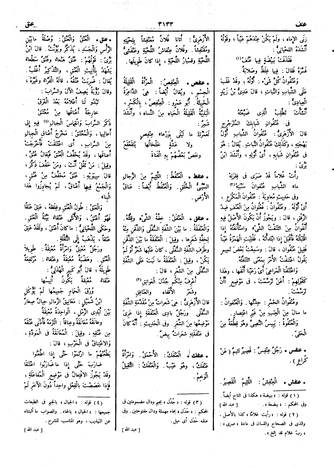 ( عنق ) العُنْقُ والعُنُقُ وُصْلة ما بين الرأس والجسد يذكر ويؤنث قال ابن بري قولهم عُنُق هَنْعَاءُ وعُنُق سَطْعاءُ يشهد بتأنيث العُنُق والتذكير أَغلب يقال ضربت عُنُقه قاله الفراء وغيره وقال رؤبة يصف الآل والسَّراب تَبْدُوا لَنا أعْلامُه بعد الفَرَقْ خارِجَةً أعناقُها من مُعْتَنَقْ ذكر السراب وانْقِماسَ الحِبال فيه إلى أَعاليها والمُعْتَنَقُ مَخْرج أَعناق الحِبال من السراب أَي اعْتَنَقَتْ فأَخرجت أَعناقها وقد يخفف العُنُق فيقال عُنْق وقيل مَنْ ثَقَّل أَنَّث ومَن خَفَّف ذكَّر قال سيبويه عُنْق مخفف من عُنُق والجمع فيهما أَعناق لم يجاوزوا هذا البناء والعَنَقُ طول العُنُقِ وغِلظه عَنِقَ عَنَقاً فهو أَعنق والأْنثى عَنْقاء بيِّنة العَنَق وحكى اللحياني ما كان أَعْنَقَ ولقد عَنِقَ عَنَقاً يذهب إلى النّقلة ورجل مُعْنِقٌ وامرأة مُعْنِقَةٌ طويلا العُنُقِ وهَضْبة معْنقة وعَنْقاءُ مرتفعة طويلة أَبو كبير الهذلي عَنْقاءُ مُعْنِقةٌ يكون أَنِيسُها وُرْقَ الحَمام جَميمُها لم يُؤكل ابن شميل مَعَانيق الرمال حبال صغار بين أَيدي الرمل الواحدة مُعْنِقة وعانَقهُ مُعَانقةً وعِناقاً التزمه فأدنى عُنُقَه من عُنُقِه وقيل المُعَانقة في المودة والإعْتِناقُ في الحرب قال يَطْعُنُهم وما ارْتَمَوْا حتى إذا اطَّعَنُوا ضارَبَ حتى إذا ما ضَارَبُوا اعْتَنَقَا وقد يجوز الافتعالُ في موضع المُفاعلة فإذا خصصت بالفعل واحداً دون الآخر لم