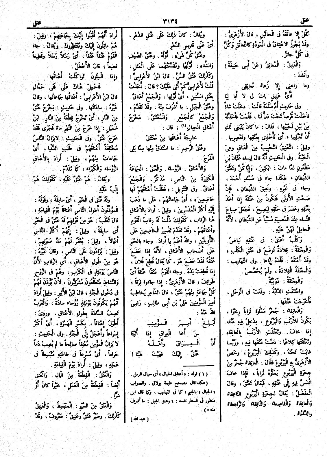 ( * قوله « أعناق الحبال » أي حبال الرمل ) قال خارجة أَعْناقُها من مُعْتَنَقْ وعُنُق الرَّحِم ما اسْتدق منها مما يلي الفرج والأَعناق الرؤساء والعُنُق الجماعة الكثيرة من الناس مذكَّر والجمع أَعْناق وفي التنزيل فظلَّت أَعناقهم لها خاضعين أَي جماعاتهم على ما ذهب إليه أكثر المفسرين وقيل أَراد بالأَعناق هنا الرِّقاب كقولك ذَلَّتْ له رقاب القوم وأَعْناقهم وقد تقدم تفسير الخاضعين على التأويلين والله أَعلم بما أَراد وجاء بالخبر على أصحاب الأَعناق لأنه إذا خضع عُنُقهِ فقد خضع هو كما يقال قُطِع فلان إذا قُطِعَتْ يده وجاءَ القوم عُنُقاً عُنُقاً أَي طوائف قال الأَزهري إذا جاؤوا فِرَقاً كل جماعة منهم عُنُق قال الشاعر يخاطب أَمير المؤمنين عليّ بن أبي طالب رضي الله عنه أَبْلِغْ أَميرَ المؤمني ن أخا العِراقِ إذا أَتَيْتا أَن العِراقَ وأَهلَهُ عُنُقٌ إليكَ فَهْيتَ هَيْتَا أَراد أَنهم أَقبلواإليك بجماعتهم وقيل هم مائلون إليك ومنتظروك ويقال جاء القوم عُنُقاً عُنُقاً أَي رَسَلاً رَسَلاً وقَطِيعاً قطيعاً قال الأَخطل وإذا المِئُونَ تواكَلَتْ أَعْناقُها فاحْمِدْ هُناكَ على فَتىً حَمّالِ قال ابن الأَعرابي أَعْناقُها جماعاتها وقال غيره سادَاتها وفي حديث يخرج عُنُقٌ من النار أَي تخرج قطعة من النار ابن شميل إذا خرج من النهر ماء فجرى فقد خرج عُنُق وفي الحديث لا يزال الناس مختلفةً أَعْناقُهم في طلب الدنيا أَي جماعات منهم وقيل أَراد بالأَعناق الرؤساء والكُبَرَاء كما تقدم ويقال هم عُنُق عليه كقولك هم إلْبٌ عليه وله عُنُق في الخير أَي سابقة وقوله المؤذِّنون أَطول الناس أَعْناقاً يوم القيامة قال ثعلب هو من قولهم له عُنُق في الخير أَي سابقة وقيل إنهم أكثر الناس أَعمالاً وقيل يُغْفَرُ لهم مَدَّ صوتهم وقيل يُزَادونَ على الناس وقال غيره هو من طول الأَعْناقِ أي الرقاب لأَن الناس يومئذ في الكرب وهم في الرَّوْح والنشاط متطلعون مُشْرَئِبُّونَ لأَنْ يُؤذَنَ لهم في دخول الجنة قال ابن الأَثير وقيل أَراد أَنهم يكونون يومئذ رؤساء سادةً والعرب تصف السادة بطول الأَعناق وروي أَطولُ إعْناقاً بكسر الهمزة أَي أَكثر إسراعاً وأَعجل إلى الجنة وفي الحديث لا يزال المؤمن مُعْنِقاً صالحاً ما لم يُصِبْ دماً حراماً أَي مسرعاً في طاعته منبسطاً في عمله وقيل أَراد يوم القيامة والعُنُق القطعة من المال والعُنُق أَيضاً القطعة من العمل خيراً كان أَو شرّاً والعَنَق من السير المنبسط والعَنِيقُ كذلك وسير عَنَقٌ وعَنِيقٌ معروف وقد