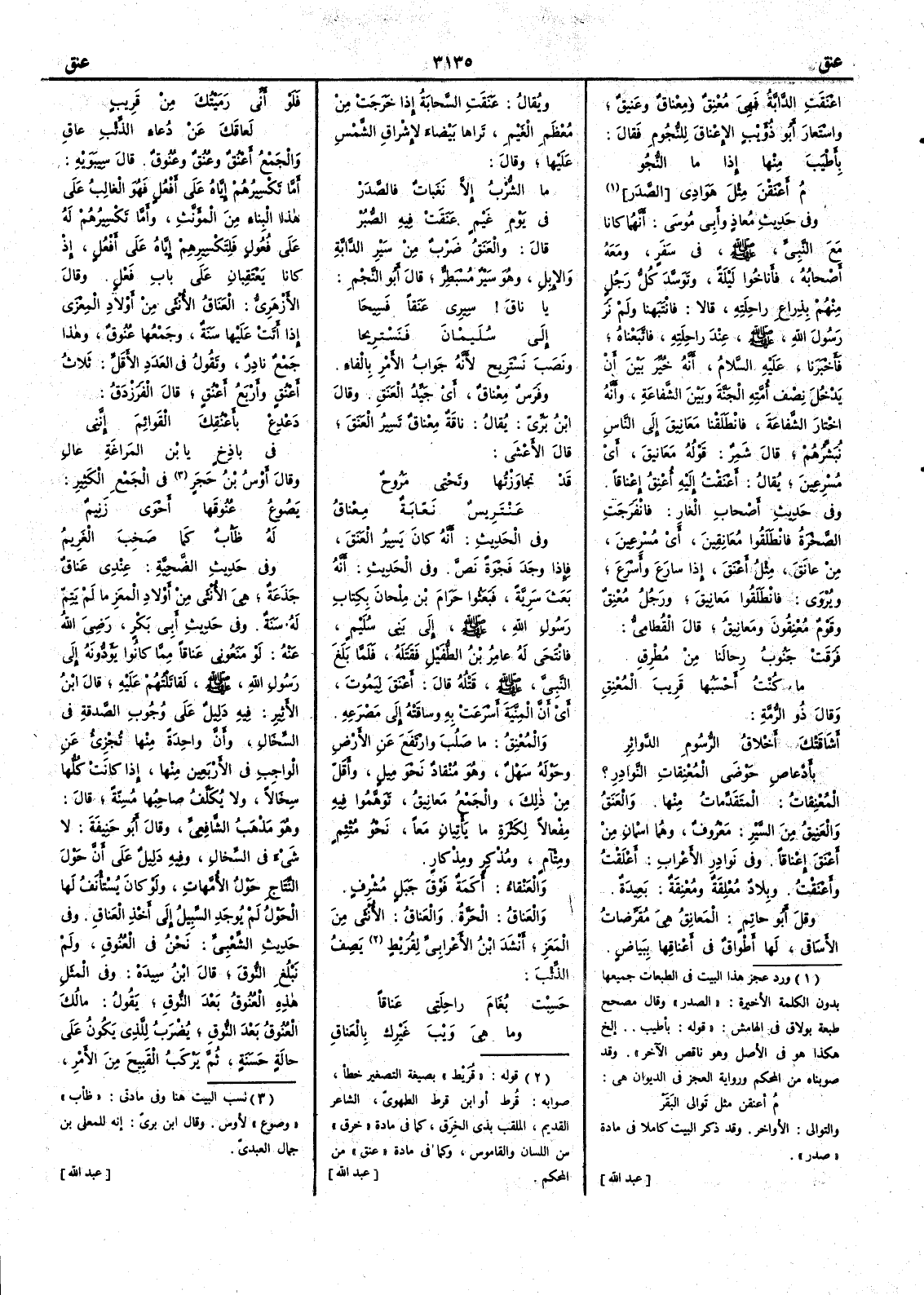 وفي حديث مُعاذٍ وأَبي موسى أَنهما كانا مع النبي صلى الله عليه وسلم في سفر أَصحابه فأناخُوا ليلةً وتَوَسَّدَ كلُّ رجل منهم بذراع راحلته قالا فانتبهنا ولم نَرَ رسول الله صلى الله عليهم وسلم عند راحلته فاتبعناه فأَخبرنا عليه السلام أَنه خُيِّرَ بين أَن يدخل نصفُ أُمته الجنة وبين الشفاعة قال شمر قوله مَعََانيق أَي مسرعين يقال أَعْنَقْتُ إليه أُعْنَقَ إعْناقاً وفي حديث أصحاب الغارِ فانفرجت الصخرة فانطلقوا مُعَانقينَ إلى الناس نبشّرهم قال شمر قوله معانيق أَي مسرعين من عانَقَ مثل أَعْنِقَ إذا سارَع وأَسرع ويروى فانطلقوا مَعانيقَ ورجل مُعْنِقٌ وقوم مُعْنِقون ومَعانيق قال القطامي طَرَقَتْ جَنُوبُ رحالَنا من مُطْرِق ما كنت أَحْسَبُها قريبَ المُعْنِقِ وقال ذو الرمة أَشَاقَتْكَ أخْلاقُ الرُّسوم الدوائرِ بأََدْعاصِ حَوضَى المُعْنِقاتِ النَّوادِرِ ؟ المُعْنِقات المتقدمات منها والعَنَقُ والعَنِيقُ من السير معروف وهما اسمان من أَعْنَقَ إعْناقاً وفي نوادر الأَعراب أَعْلَقْتُ وأَعْنَقْتُ وبلاد مُعْلِقة ومُعْنِقة بعيدة وقال أَبو حاتم المَعانقُ هي مُقَرِّضات الأَسَاقي لها أَطواق في أَعناقها ببياض ويقال عَنَقَت السحابةُ إذا خرجت من معظم الغيم تراها بيضاء لإشراق الشمس عليها وقال ما الشُّرْبُ إلاّ نَغَباتٌ فالصَّدَرْ في يوم غَيْمٍ عَنَقَتْ فيه الصُّبُرْ قال والعَنَقُ ضرب من سير الدابة والإبل وهو سير مُسْبَطِرٌّ قال أَبو النجم يا ناقَ سِيرِي عَنَقاً فَسِيحاً إلى سليمانَ فَنَسْترِيحا ونَصب نَسْتريح لأَنه جواب الأمر بالفاء وفرس مِعْناق أي جيد العَنَق وقال ابن بري يقال ناقة مِعْناق تسير العَنَق قال الأَعشى قد تجاوَزْتُها وتَحْتي مَرُوحٌ َعنْتَرِيسٌ نَعّابة مِعْناقُ وفي الحديث أنه كان يسير العَنَقَ فإذا وجد فَجْوةً نَصَّ وفي الحديث أَنه بعث سَرِيّةً فبعثوا حَرَامَ بن مِلْحان بكتاب رسول الله صلى الله عليه وسلم إلى بني سُلَيْم فانْتَحَى له عامرُ بن الطُّفَيْل فقتله فلما بلغ النبيَّ صلى الله عليه وسلم قَتْلُه قال أَعْنَقَ لِيَمُوتَ أَي أَن المنية أَسرعت به وساقته إلى مصرعه والمُعْنِق ما صُلب وراتفع عن الأَرض وحوله سَهْل وهو منقاد نحو مِيلٍ وأَقل من ذلك والجمع مَعانيقُ توهموا فيه مِفْعالاً لكثرة ما يأتيان معاً نحو مُتْئِم ومِتْآم ومُذْكِر ومِذْكار والعَناق الحَرَّة والعَناق الأُنثى من المَعَز أَنشد ابن الأَعرابي لقُريْطٍ يصف الذئب حَسِبْتَ بُغامَ راحِلتي عَناقاً وما هي وَيْبَ غَيرِك بالعَناقِ فلو أَني رَمَيْتُك من قريب لعاقَكَ عن دُعاءِ الذَّئبِ عاقِ والجمع أَعْنُق وعُنُق وعُنُوق قال سيبويه أَمُّا تكسيرهم إياه على أَفْعُل فهو الغالب على هذا البناء من المؤنث وأَما تكسيرهم له على فُعُول فلتكسيرهم إياه على أَفْعُل إذ كانا يعتقبان على باب فَعْل وقال الأَزهري العَنَاق الأُنثى من أَولاد المِعْزَى إذا أتت عليها سنة وجمعها عنوق وهذا جمع نادر وتقول في العدد الأَقل ثلاث أَعْنُقٍ وأَربع أََعْنُقٍ قال الفرزدق دَعْدِِعْ بأَعْنُقِك القَوائِم إنَّني في باذِخٍ يا ابن المَراغة عالِ وقال أَوس بن حجر في الجمع الكثير يَصُوعُ عُنُوقَها أَحْوَى زَنِيمُ له ظأبٌ كما صَخِبَ الغِرِيمُ وفي حديث الضحية عندي عَناقٌ جَذَعةٌ هي الأُنثى من أَولاد المعز ما لم يتم له سنة وفي حديث أَبي بكر رضي الله عنه لو مَنَعوني عَناقاً مما كانوا يؤدُّونه إلى رسول الله صلى الله عليه وسلم لقاتلتُهم عليه قال ابن الأَثير فيه دليل على وجوب الصدقة في السِّخَال وأَن واحدة منها تجزئ عن الواجب في الأَربعين منها إذا كانت كلها سِخَالاً ولا يُكَلَّفُ صاحبها مُسِنَّةً قال وهو مذهب الشافعي وقال أَبو حنيفة لا شيء في السخال وفيه دليل على أن حَوْل النَّتَاجِ حوْلُ الأُمّهاتِ ولو كانَ يُستأنَف لها الحَوْلُ لم يوجد السبيلُ إلى أَخذ العَناق وفي حديث الشعبي نحن في العُنُوق ولم نبلغ النُّوق قال ابن سيده وفي 