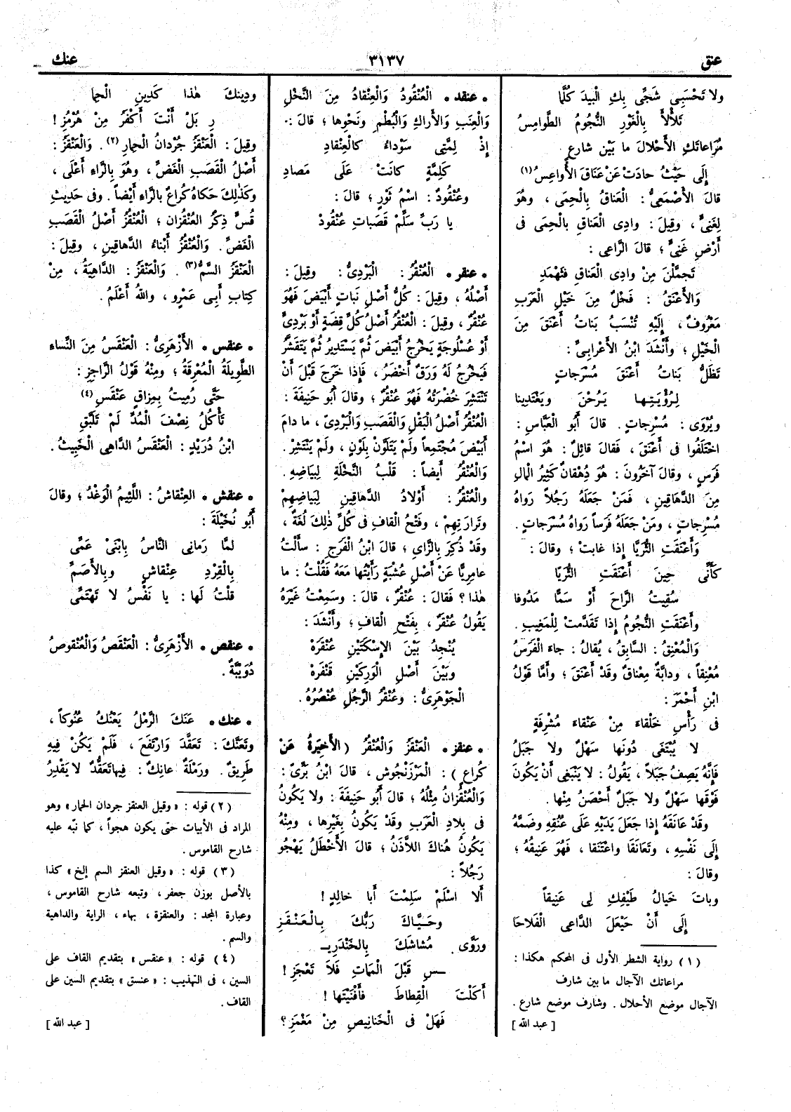 ( عنقد ) العُنْقُودُ والعِنقادُ من النخل والعنبِ والأَراكِ والبُطْم ونحوها قال إِذْ لِمَّتي سَوْداءُ كالعِنْقادِ كَلِمَّةٍ كانتْ على مَصادِ وعُنْقُود اسم ثور قال يا ربِّ سَلِّمْ قَصَباتِ عُنْقُودْ ( عنقر ) العُنْقُرُ البَرْدِيُّ وقيل أَصلهُ وقيل كلُّ أَصلِ نَباتٍ أَبيضَ فهو عُنْقُر وقيل العُنْقُر أَصل كل قِضَة أَو بَرْديّ أَو عُسْلوجة يخرج أَبيضَ ثم يستدير ثم يتقشَّر فيخرج له ورق أَخضر فإِذا خرج قبل أَن تنتشِر خضرتهُ فهو عُنْقُر وقال أَبو حنيفة العُنْقُر أَصل البَقل والقصب والبَرْدِيّ ما دام أَبيض مجتمعاً ولم يتلوّن بلون ولم ينتشر والعُنْقُر أَيضاً قلب النخلة لبياضه والعُنْقُر أَولاد الدَّهاقِين لبياضهم وتَرارتِهم وفتحُ القاف في كل ذلك لغة وقد ذكر بالزاي قال ابن الفرج سأَلت عامريّاً عن أَصل عُشْبة رأَيتها معه فقلت ما هذا ؟ فقال عُنْقُر قال وسمعت غيره يقول عُنْقَر بفتح القاف وأَنشد يُنْجِدُ بَيْنَ الإِسْكَتَيْنِ عُنْقَرهْ وبين أَصْلِ الوَرِكَيْنِ قَنْفَرهْ الجوهري وعُنْقُر الرجل عُنْصُره ( عنقز ) العَنْقَزُ والعُنْقُزُ الأَخيرة عن كراع المَرْزَنْجُوش قال ابن بري والعُنْقُزانُ مثله قال أَبو حنيفة ولا يكون في بلاد العرب وقد يكون بغيرها ومنه يكون هناك اللاَّذَنُ قال الأَخطل يهجو رجلاً أَلا اسْلَمْ سَلِمْتَ أَبا خالِدٍ وحَيَّاكَ رَبُّكَ بالعَنْقَزِ ورَوَّى مُشاشَكَ بالخَنْدَرِي سِ قَبْل الممات فلا تَعْجَزِ أَكَلْتَ القِطاطَ فأَفْنَيْتَها فهل في الخَنانِيصِ من مَغْمَزِ ؟ ودِيُنكَ هذا كدين الحِما رِ بل أَنتَ أَكْفَرُ من هُرْمُزِ وقيل العَنْقَزُ جُرْدانُ الحمار والعَنْقَزُ أَصلُ القَصَبِ الغَضِّ وهو بالراء أَعلى وكذلك حكاه كراع بالراء أَيضاً وفي حديث قُسٍّ ذكر العُنْقُزان العُنْقُزُ أَصل القَصَب الغَضّ والعُنْقُزُ أَبناء الدَّهاقِينِ وقيل العَنْقَزُ السَّمُّ والعَنْقَزُ الداهية من كتاب أَبي عمرو والله أَعلم ( عنقس ) الأَزهري العَنْقَس من النساء الطويلة المُعْرِقة ومنه قول الراجز حتى رُمِيت بِمِزاقٍ عَنْقَسِ تَأْكلُ نِصفَ المُدِّ لم تَلَبَّقِ ابن دريد العَنْقَس الدَّاهي الخَبيث( عنقش ) العِنْقاش اللئيم الوغْدُ وقال أَبو نخيلة لما رَماني الناسُ بابْنَيْ عَمِّي بالقِرْدِ عِنْقاشٍ وبالأَصَمِّ قلْتُ لها يا نَفْسي لا تَهْتَمِّي ( عنقص ) الأَزهري العَنْقَصُ والعُنْقوص دُوَيْبّة ( عنك ) عَنَكَ الرَّمْلُ يَعْنُكُ عُنُوكاً وتَعَنَّكَ تعَقَّد وارتفع فلم يكن فيه طريق ورَملة عانِكٌ فيها تَعَقُّد لا يقدر