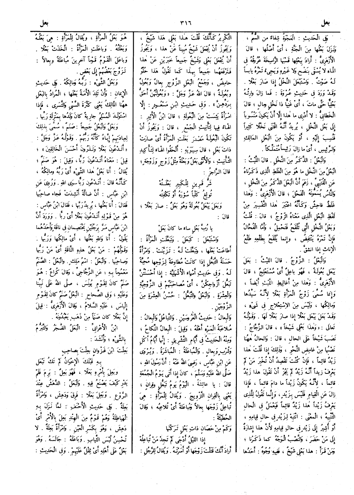 وفي الحديث العَجْوة شِفاء من السُّمِّ ونزل بَعْلُها من الجنة أَي أَصلها قال الأَزهري أَراد بِبَعْلِها قَسْبَها الراسخة عُروقُه في الماء لا يُسْقَى بنَضْح ولا غيره ويجيء تَمْره يابساً له صوت واستبْعل النخلُ إِذا صار بَعْلاً وقد ورد في حديث عروة فما زال وارثه بَعْلِيّاً حتى مات أَي غَنِيّاً ذا نَخْل ومال قال الخطابي لا أَدري ما هذا إِلا أَن يكون منسوباً إِلى بَعْل النخلِ يريد أَنه اقتنى نَخْلاً كَثِيراً فنُسِب إِليه أَو يكون من البَعْل المَالك والرئيس أَي ما زال رئيساً متملكاً والبَعْل الذَّكَر من النَّخل قال الليث البَعْلُ من النخل ما هو من الغلط الذي ذكرناه عن القُتَبي زعم أَن البَعْل الذكر من النخل والناس يسمونه الفَحْل قال الأَزهري وهذا غلط فاحش وكأَنه اعتبر هذا التفسير من لفظ البَعْل الذي معناه الزوج قال قلت وبَعْل النخل التي تُلْقَح فَتَحْمِل وأَما الفُحَّال فإِن تمره ينتقض وإِنما يلْقَح بطَلْعه طَلْع الإِناث إِذا انشقَّ والبَعْل الزوج قال الليث بَعَل يَبْعَل بُعولة فهو باعل أَي مُسْتَعْلِج قال الأَزهري وهذا من أَغاليط الليث أَيضاً وإِنما سمي زوج المرأَة بَعْلاً لأَنه سيدها ومالكها وليس من الاستعلاج في شيء وقد بَعَل يَبْعَل بَعْلاً إِذا صار بَعْلاً لها وقوله تعالى وهذا بَعْلي شيخاً قال الزجاج نصب شيخاً على الحال قال والحال ههنا نصبها من غامض النحو وذلك إِذا قلت هذا زيد قائماً فإِن كنت تقصد أَن تخبر من لم يَعْرِف زيداً أَنه زيد لم يَجُز أَن تقول هذا زيد قائماً لأَنه يكون زيداً ما دام قائماً فإِذا زال عن القيام فليس بزيد وإِنما تقول للذي يعرف زيداً هذا زيد قائماً فيعمل في الحال التنبيه المعنى انْتَبِه لزيد في حال قيامه أَو أُشيرُ إِلى زيد في حال قيامه لأَن هذا إِشارة إِلى من حضر والنصب الوجه كما ذكرنا ومن قرأَ هذا بَعْلي شيخٌ ففيه وجوه أَحدها التكرير كأَنك قلت هذا بعلي هذا شيخ ويجوز أَن يجعل شيخ مُبِيناً عن هذا ويجوز أَن يجعل بعلي وشيخ جميعاً خبرين عن هذا فترفعهما جميعاً بهذا كما تقول هذا حُلْوٌ حامض وجمع البَعْل الزوجِ بِعال وبُعُول وبُعُولة قال الله عز وجل وبُعولتهن أَحق بردّهن وفي حديث ابن مسعود إِلا امرأَة يَئِسَتْ من البُعولة قال ابن الأَثير الهاء فيها لتأْنيث الجمع قال ويجوز أَن تكون البُعولة مصدر بَعَلَت المرأَة أَي صارت ذات بَعْل قال سيبويه أَلحقوا الهاء لتأْكيد التأْنيث والأُنثى بَعْل وبَعْلة مثل زَوْج وزَوْجة قال الراجز شَرُّ قَرِينٍ للكَبِير بَعْلَتُه تُولِغُ كَلْباً سُؤرَه أَو تَكْفِتُه وبَعَل يَبْعَل بُعولة وهو بَعْل صار بَعْلاً قال يا رُبَّ بَعْلٍ ساءَ ما كان بَعَل واسْتَبْعَلَ كبَعَلَ وتَبَعَّلَت المرأَةُ أَطاعت بَعْلَها وتَبَعَّلَت له تزينتْ وامرأَة حَسَنَة التَّبَعُّل إِذا كانت مُطاوِعة لزوجها مُحِبَّة له وفي حديث أَسماء الأَشهلية إِذا أَحْسَنْتُنَّ تَبَعُّل أَزواجكن أَي مصاحبتهم في الزوجية والعِشْرة والبَعْل والتَّبَعُّل حُسْن العِشْرة من الزوجين والبِعال حديث العَرُوسَيْن والتَّباعل والبِعال ملاعبة المرءِ أَهلَه وقيل البِعال النكاح ومنه الحديث في أَيام التشريق إِنها أَيام أَكل وشرب وبِعال والمُباعَلة المُباشَرة ويروى عن ابن عباس رضي الله عنه أَن رسول الله صلى الله عليه وسلم كان إِذا أَتى يومُ الجمعة قال يا عائشة اليَوْمُ يومُ تَبَعُّل وقِرانٍ يعني بالقِران التزويجَ ويقال للمرأَة هي تُباعِل زَوْجَها بِعالاً ومُباعَلة أَي تُلاعبه وقال الحطيئة وكَمْ مِن حَصانٍ ذاتِ بَعْلٍ تَرَكْتَها إِذا الليل أَدْجَى لم تَجِدْ من تُباعِلُه أَراد أَنك قتلت زوجها أَو أَسرته ويقال للرجل هو بَعلُ المرأَة ويقال للمرأَة هي بَعْلُه وبَعْلَتُه وباعلَت المرأَةُ اتخذت بَعْلاً وباعَلَ القومُ قوماً آخرين مُباعلَة وبِعالاً تَزَوَّجَ بعضهم إِلى بعض وبَعْلُ الشيء رَبُّه ومالِكُه وفي حديث الايمان وأَن تَلِدَ الأَمة بَعْلَها ا