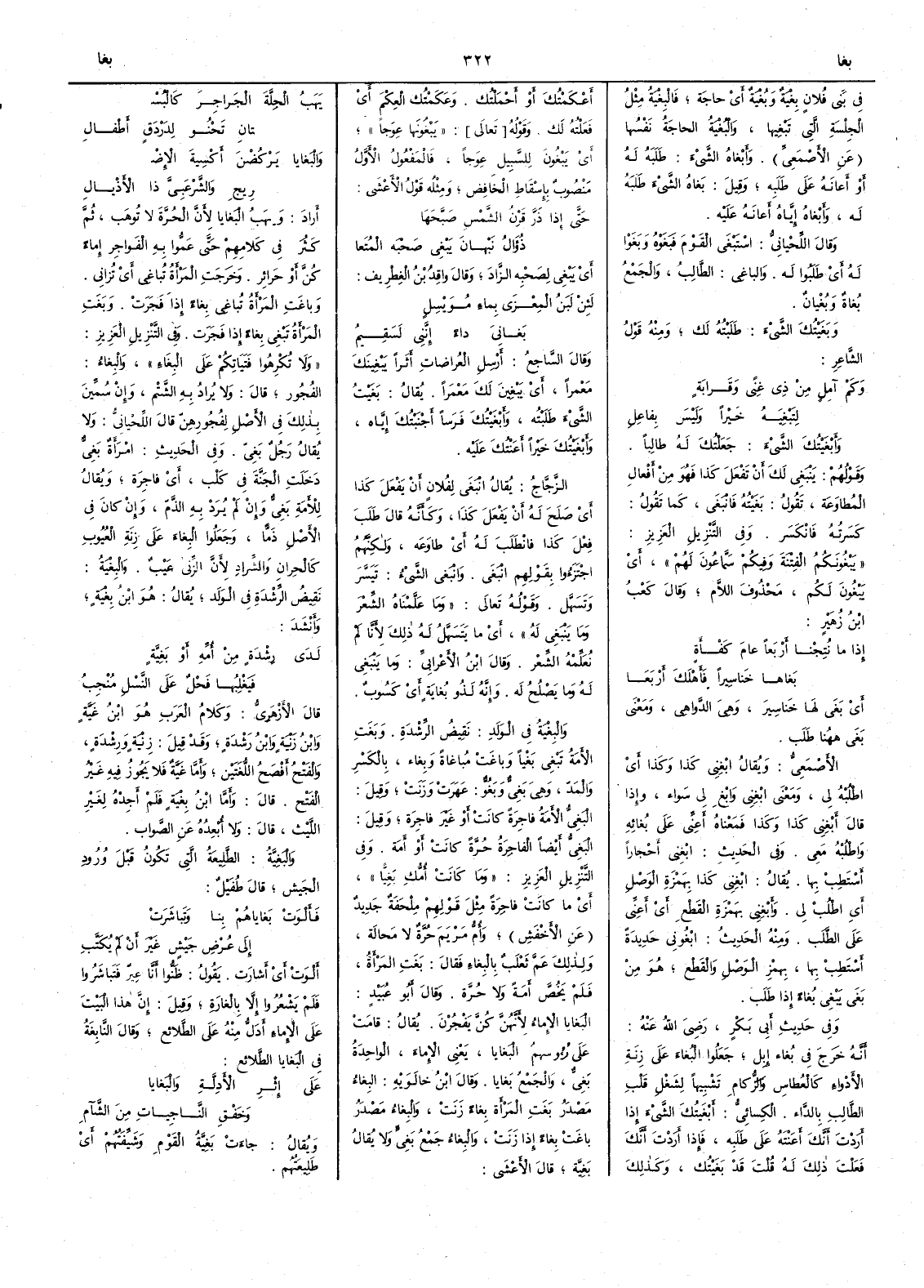 في بني فلان بِغْيَة وبُغْية أَي حاجة فالبِغْيَة مثل الجلْسة التي تَبْغِيها والبُغْية الحاجة نفسها عن الأَصمعي وأَبغاه الشيءَ طلبه له أَو أَعانه على طلبه وقيل بَغاه الشيءَ طلبه له وأَبغاه إياه أَعانه عليه وقال اللحياني اسْتَبْغَى القومَ فَبَغَوْه وبغَوْا له أَي طلبوا له والباغي الطالِبُ والجمع بُغاة وبُغْيانٌ وبَغَيْتُك الشيءَ طلبته لك ومنه قول الشاعر وكم آمِلٍ من ذي غِنىً وقَرابةٍ لِتَبْغِيَه خيراً وليس بفاعِل وأبْغَيْتُك الشيءَ جعلتك له طالباً وقولهم يَنْبَغِي لك أَن تفعل كذا فهو من أَفعال المطاوعة تقول بَغَيْتُه فانْبَغَى كما تقول كسرته فانكسر وفي التنزيل العزيز يَبْغُونكم الفِتْنة وفيكم سَمَّاعُون لهم أَي يَبْغُون لكم محذوف اللام وقال كعب بن زهير إذا ما نُتِجْنا أَرْبَعاً عامَ كَفْأَةٍ بَغاها خَناسيراً فأَهْلَكَ أَرْبعا أَي بَغَى لها خَناسير وهي الدواهي ومعنى بَغَى ههنا طَلَب الأَصمعي ويقال ابْغِني كذا وكذا أَي أطلبه لي ومعنى ابْغِني وابْغِ لي سواء وإذا قال أَبْغِني كذا وكذا فمعناه أَعِنِّي على بُغائه واطلبه معي وفي الحديث ابْغِني أَحجاراً أَسْتَطبْ بها يقال ابْغِني كذا بهمزة الوصل أَي اطْلُبْ لي وأَبْغِني بهمزة القطع أَي أَعنَّي على الطلب ومنه الحديث ابْغُوني حَديدةً أَسْتَطِبْ بها بهمز الوصل والقطع هو من بَغَى يَبْغِي بُغاءً إذا طلب وفي حديث أَبي بكر رضي الله عنه أَنه خرج في بُغاء إبل جعلوا البُغاء على زنة الأَدْواء كالعُطاس والزُّكام تشبيهاً لشغل قلب الطالب بالداء الكسائي أَبْغَيتُك الشيءَ إذا أَردت أَنك أَعنته على طلبه فإذا أَردت أَنك فعلت ذلك له قلت قد بَغَيْتُك وكذلك أعْكَمْتُك أَو أَحْمََلْتُك وعَكَمْتُك العِكْم أَي فعلته لك وقوله يَبْغُونَها عِوَجاً أَي يَبْغُون للسبيل عوجاً فالمفعول الأَول منصوب بإسقاط الخافض ومثله قول الأَعشى حتى إذا ذَرَّ قَرْنُ الشَّمْسِ صَبَّحها ذُؤالُ نَبْهانَ يَبْغِي صَحْبَه المُتَعا أَي يبغي لصحبه الزادَ وقال واقِدُ بن الغِطرِيف لئن لَبَنُ المِعْزَى بماء مَوَيْسِلِ بَغانيَ داءً إنني لَسَقِيمُ وقال الساجع أَرْسِل العُراضاتِ أَثَراً يَبْغِينك مَعْمَراً أَي يَبْغِينَ معمراً يقال بَغَيتُ الشيءَ طلبته وأَبْغَيْتُك فَرساً أَجْنَبْتُك إياه وأَبْغَيْتُك خيراً أَعنتك عليه الزجاج يقال انْبَغَى لفلان أَن يفعل كذا أَي صَلَحَ له أَن يفعل كذا وكأَنه قال طَلَبَ فِعْلَ كذا فانْطَلَبَ له أَي طاوعه ولكنهم اجْتزَؤوا بقولهم انْبَغَى وانْبَغى الشيءُ تيسر وتسهل وقوله تعالى وما علَّمناه الشعر وما ينبغي له أَي ما يتسهل له ذلك لأَنا لم نعلمه الشعر وقال ابن الأَعرابي وما ينبغي له وما يَصْلُح له وإنه لذُو بُغايةٍ أَي كَسُوبٌ والبِغْيةُ في الولد نقِيضُ الرِّشْدَةِ وبَغَتِ الأَمة تَبْغِي بَغْياً وباغَتْ مُباغاة وبِغاء بالكسر والمدّ وهي بَغِيٌّ وبَغُوٌ عَهَرَتْ وزَنَتْ وقيل البَغِيُّ الأَمَةُ فاجرة كانت أَو غير فاجرة وقيل البَغِيُّ أَيضاً الفاجرة حرة كانت أَو أَمة وفي التنزيل العزيز وما كانت أُمُّكِ بغيّاً أَي ما كانت فاجرة مثل قولهم ملْحَفَة جَدِيدٌ عن الأَخفش وأُم مريم حرَّة لا محالة ولذلك عمَّ ثعلبٌ بالبِغاء فقال بَغَتِ المرأَةُ فلم يَخُصَّ أَمة ولا حرة وقال أَبو عبيد البَغايا الإماءُ لأَنهنَّ كنَّ يَفْجُرْنَ يقال قامت على رؤُوسهم البَغايا يعني الإماءَ الواحدة بَغِيٌّ والجمع بغايا وقال ابن خالويه البِغاءُ مصدر بَغَتِ المرأَة بِغاءً زَنَت والبِغاء مَصْدَرُ باغت بِغاء إذا زنت والبِغاءُ جمع بَغِيٍّ ولا يقال بغِيَّة قال الأَعشى يَهَبُ الْجِلَّةَ الجَراجِرَ كالبُسْ تانِ تَحْنو لدَرْدَقٍ أَطفالِ والبَغايا يَرْكُضْنَ أَكْسِيةَ الإضْ رِيجِ والشَّرْعَبيَّ ذا الأَذْيالِ أَراد ويَهَبُ البغايا لأَن الحرة لا توهب ثم كثر في كلامهم حتى عَمُّوا به الفواجر إماءً كنّ أَو حرائر وخرجت المرأَة تُباغِي أَي تُز