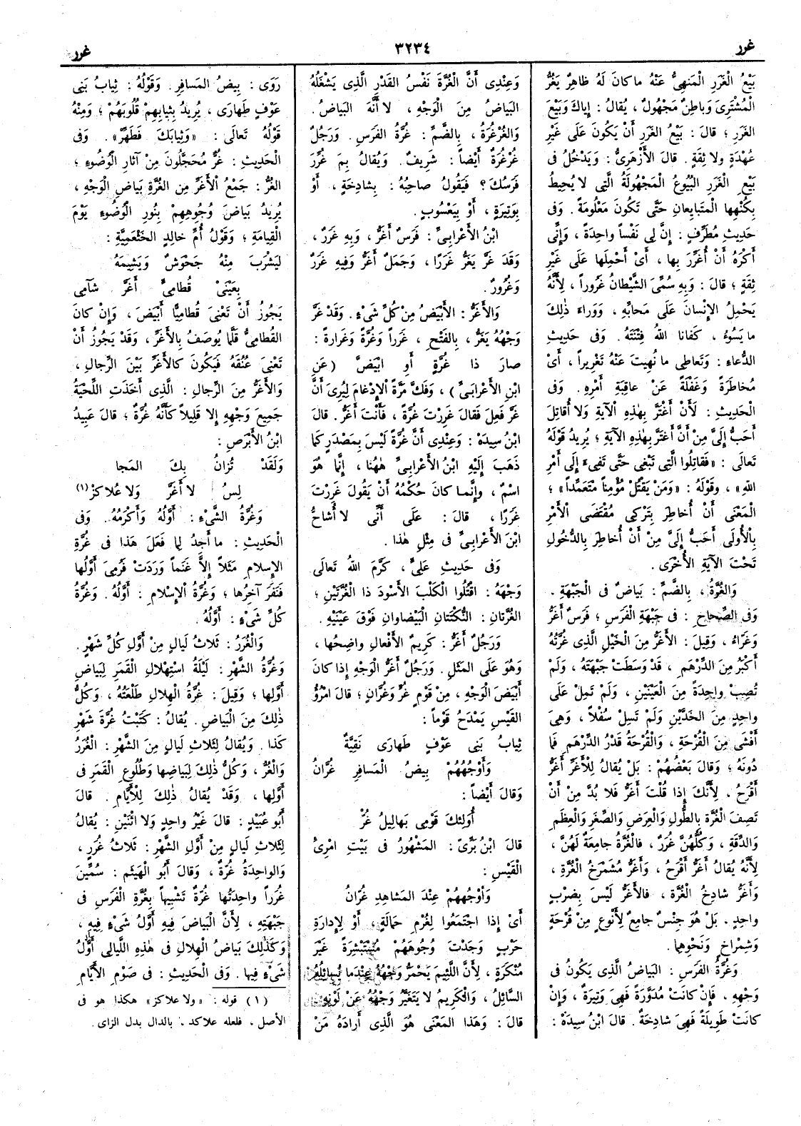 بَيْعُ الغَررِ المنهيُّ عنه ما كان له ظاهرٌ يَغُرُّ المشتري وباطنٌ مجهول يقال إِياك وبيعَ الغَرَرِ قال بيع الغَرَر أَن يكون على غير عُهْدة ولا ثِقَة قال الأَزهري ويدخل في بيع الغَرَرِ البُيوعُ المجهولة التي لا يُحيط بكُنْهِها المتبايِعان حتى تكون معلومة وفي حديث مطرف إِن لي نفساً واحدة وإِني أَكْرهُ أَن أُغَرِّرَ بها أَي أَحملها على غير ثقة قال وبه سمي الشيطان غَرُوراً لأَنه يحمل الإِنسان على مَحابِّه ووراءَ ذلك ما يَسوءه كفانا الله فتنته وفي حديث الدعاء وتَعاطِي ما نهيت عنه تَغْريراً أَي مُخاطرةً وغفلة عن عاقِبة أَمره وفي الحديث لأَنْ أَغْتَرَّ بهذه الآية ولا أُقاتلَ أَحَبُّ إِليّ مِنْ أَن أَغْتَرَّ بهذه الأية يريد قوله تعالى فقاتِلُوا التي تبغي حتى تَفيءَ إلى أَمر الله وقوله ومَنْ يَقْتَلْ مؤمناً مُتَعَمِّداً المعنى أَن أُخاطِرَ بتركي مقتضى الأَمر بالأُولى أَحَبُّ إِليّ مِن أَن أُخاطِرَ بالدخول تحت الآية الأُخرى والغُرَّة بالضم بياض في الجبهة وفي الصحاح في جبهة الفرس فرس أَغَرُّ وغَرّاء وقيل الأَغَرُّ من الخيل الذي غُرّتُه أَكبر من الدرهم وقد وَسَطَت جبهَته ولم تُصِب واحدة من العينين ولم تَمِلْ على واحد من الخدّينِ ولم تَسِلْ سُفْلاً وهي أَفشى من القُرْحة والقُرْحة قدر الدرهم فما دونه وقال بعضهم بل يقال للأَغَرّ أَغَرُّ أَقْرَح لأَنك إِذا قلت أَغَرُّ فلا بد من أَن تَصِف الغُرَّة بالطول والعِرَض والصِّغَر والعِظَم والدّقّة وكلهن غُرَر فالغرّة جامعة لهن لأَنه يقال أَغرُّ أَقْرَح وأَغَرُّ مُشَمْرَخُ الغُرّة وأَغَرُّ شادخُ الغُرّة فالأَغَرُّ ليس بضرب واحد بل هو جنس جامع لأَنواع من قُرْحة وشِمْراخ ونحوهما وغُرّةُ الفرسِ البياضُ الذي يكون في وجهه فإن كانت مُدَوَّرة فهي وَتِيرة وإن كانت طويلة فهي شادِخةٌ قال ابن سيده وعندي أَن الغُرّة نفس القَدْر الذي يَشْغَله البياض من الوجه لا أَنه البياض والغُرْغُرة بالضم غُرَّة الفرس ورجل غُرغُرة أَيضاً شريف ويقال بِمَ غُرّرَ فرسُك ؟ فيقول صاحبه بشادِخةٍ أَو بوَتِيرةٍ أَو بِيَعْسوبٍ ابن الأَعرابي فرس أَغَرُّ وبه غَرَرٌ وقد غَرّ يَغَرُّ غَرَراً وجمل أَغَرُّ وفيه غَرَرٌ وغُرور والأَغَرُّ الأَبيض من كل شيء وقد غَرَّ وجهُه يَغَرُّ بالفتح غَرَراً وغُرّةً وغَرارةً صار ذا غُرّة أَو ابيضَّ عن ابن الأَعرابي وفكَّ مرةً الإِدغام ليُري أَن غَرَّ فَعِل فقال غَرِرْتَ غُرّة فأَنت أَغَرُّ قال ابن سيده وعندي أَن غُرّة ليس بمصدر كما ذهب إِليه ابن الأَعرابي ههنا وإِنما هو اسم وإِنما كان حكمه أَن يقول غَرِرْت غَرَراً قال على أَني لا أُشاحُّ ابنَ الأَعرابي في مثل هذا وفي حديث عليّ كرم الله تعالى وجهه اقْتُلوا الكلبَ الأَسْودَ ذا الغُرّتين الغُرّتان النُّكْتتان البَيْضاوانِ فوق عينيه ورجل أَغَرُّ كريم الأَفعال واضحها وهو على المثل ورجل أَغَرُّ الوجه إذا كان أَبيض الوجه من قوم غُرٍّ وغُرّان قال امرؤ القيس يمدح قوماً ثِيابُ بني عَوْفٍ طَهارَى نَقِيّةٌ وأَوجُهُهم بِيضُ المَسافِر غُرّانُ وقال أَيضاً أُولئكَ قَوْمي بَهالِيلُ غُرّ قال ابن بري المشهور في بيت امرئ القيس وأَوجُههم عند المَشاهِد غُرّانُ أَي إذا اجتمعوا لِغُرْم حَمالةٍ أَو لإِدارة حَرْب وجدتَ وجوههم مستبشرة غير منكرة لأَن اللئيم يَحْمَرُّ وجهه عندها يسائله السائل والكريم لا يتغيّر وجهُه عن لونه قال وهذا المعنى هو الذي أَراده من روى بيض المسافر وقوله ثياب بني عوف طهارَى يريد بثيابهم قلوبهم ومنه قوله تعالى وثِيابَك فطَهِّرْ وفي الحديث غُرٌّ محجلون من آثارِ الوُضوء الغُرُّ جمع الأَغَرّ من الغُرّة بياضِ الوجه يريد بياضَ وجوههم الوُضوء يوم القيامة وقول أُمّ خالد الخَثْعَمِيّة ليَشْرَبَ جَحْوَشٌ ويَشِيمهُ بِعَيْني قُطامِيٍّ أَغَرّ شآمي يجوز أَن تعني قطاميًّا أَبيض وإِن كان القطامي قلما يوصف بالأَغَرّ وقد يجوز أَن تعني عنُقَه فيكون كالأَغَرّ بين الر