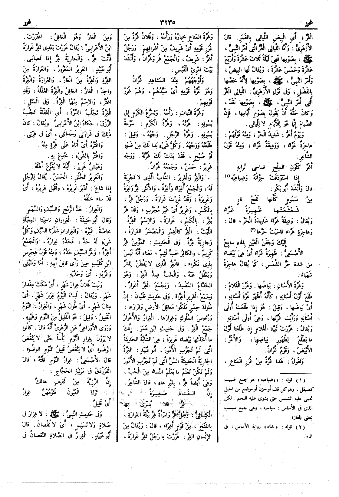 الأَصمعي ظَهِيرة غَرّاء أَي هي بيضاء من شدّة حر الشمس كما يقال هاجرة شَهْباء وغُرّة الأَسنان بياضُها وغَرَّرَ الغلامُ طلع أَوّلُ أَسنانه كأَنه أَظهر غُرّةَ أَسنانِه أَي بياضها وقيل هو إذا طلعت أُولى أَسنانه ورأَيت غُرّتَها وهي أُولى أَسنانه ويقال غَرَّرَت ثَنِيَّنا الغلام إذا طلعتا أَول ما يطلعُ لظهور بياضهما والأَغَرُّ الأَبيض وقوم غُرّان وتقول هذا غُرّة من غُرَرِ المتاع وغُرّةُ المتاع خيارُه ورأْسه وفلان غُرّةٌ من غُرَرِ قومه أَي شريف من أَشرافهم ورجل أَغَرُّ شريف والجمع غُرُّ وغُرَّان وأَنشد بيت امرئ القيس وأَوْجُهُهم عند المشاهد غُرّان وهو غرة قومِه أَي سّيدهُم وهم غُرَرُ قومهم وغُرّةُ النبات رأْسه وتَسَرُّعُ الكَرْمِ إلى بُسُوقِه غُرّتُه وغُرّةُ الكرم سُرْعةُ بُسوقه وغُرّةُ الرجل وجهُه وقيل طلعته ووجهه وكل شيء بدا لك من ضوء أَو صُبْح فقد بدت لك غُرّته ووَجْهٌ غريرٌ حسن وجمعه غُرّان والغِرُّ والغرِيرُ الشابُّ الذي لا تجربة له والجمع أَغِرّاء وأَغِرّة والأُنثى غِرٌّ وغِرّة وغَريرة وقد غَرِرْتَ غَرارَةٌ ورجل غِرٌّ بالكسر وٌغرير أَي غير مجرّب وقد غَرّ يَغِرُّ بالكسر غرارة والاسم الغِرّة الليث الغِرُّ كالغِمْر والمصدر الغَرارة وجارية غِرّة وفي الحديث المؤمنُ غِرٌّ كَريم الكافرُ خَبٌّ لَئِيم معناه أَنه ليس بذي نَكراء فالغِرُّ الذي لا يَفْطَن للشرّ ويغفلُ عنه والخَبُّ ضد الغِرّ وهو الخَدّاع المُفْسِد ويَجْمَع الغِرَّ أَغْرارٌ وجمع الغَرِير أَغرّاء وفي الحديث ظبيان إنّ ملوك حِمْير مَلَكُوا مَعاقِلَ الأَرض وقرَارَها ورؤوسَ المُلوكِ وغِرارَها الغِرار والأَغْرارُ جمع الغِرّ وفي حديث ابن عمر إنّك ما أَخَذْتَها بَيْضاءَ غَرِيرة هي الشابة الحديثة التي لم تجرِّب الأُمور أَبو عبيد الغِرّة الجارية الحديثة السِّنِّ التي لم تجرِّب الأُمور ولم تكن تعلم ما يعلم النساء من الحُبِّ وهي أَيضاً غِرٌّ بغير هاء قال الشاعر إن الفَتَاةَ صَغِيرةٌ غِرٌّ فلا يُسْرَى بها الكسائي رجل غِرٌّ وامرأَة غِرٌّ بيِّنة الغَرارة بالفتح من قوم أَغِرّاء قال ويقال من الإنسان الغِرّ غَرَرْت يا رجل تَغِرُّ غَرارة ومن الغارّ وهو الغافل اغْتَرَرْت ابن الأَعرابي يقال غَرَرْت بَعْدي تَغُِ غَرارَة فأَت غِرُّ والجارية غِرٌّ إذا تَصابَى أَبو عبيد الغَريرُ المَغْرور والغَرارة من الغِرّة والغِرَّة من الغارّ والغَرارةُ والغِرّة واحدٌ الغارّ الغافل والغِرَّة الغفلة وقد اغْتَرّ والاسم منهما الغِرة وفي المثل الغِرَّة تَجْلُب الدِّرَّة أَي الغفلة تجلب الرزق حكاه ابن الأَعرابي ويقال كان ذلك في غَرارتي وحَداثتي أَي في غِرّتي واغْتَرّه أَي أَتاه على غِرّة منه واغْترَّ بالشيء خُدِع به وعيش غَرِيرٌ أَبْله يُفَزِّع أَهله والغَريِر الخُلُق الحسن يقال للرجل إِذا شاخَ أَدْبَرَ غَريرهُ وأَقْبَل هَريرُه أَي قد ساء خلُقه والغِرارُ حدُّ الرمح والسيف والسهم وقال أَبو حنيفة الغِراران ناحيتا المِعْبلة خاصة غيره والغِراران شَفْرتا السيف وكل شيء له حدٌّ فحدُّه غِرارُه والجمع أَغِرّة وغَرُّ السيف حدّه منه قول هِجْرِس بن كليب حين رأَى قاتِلَ أَبيه أَما وسَيْفِي وغَرَّيْه أَي وحَدّيه ولَبِثَ فلان غِرارَ شهر أَي مكث مقدارَ شهر ويقال لَبِث اليومُ غِرارَ شهر أَي مِثالَ شهر أَي طُول شهر والغِرارُ النوم القليل وقيل هوالقليل من النوم وغيره وروى الأَوزاعي عن الزهري أَنه قال كانوا لا يَرَون بغرار النَّوْم بأْساً حتى لا يَنْقض الوضوءَ أَي لا ينقض قليلُ النوم الوضوء قال الأَصمعي غِرارُ النوم قلّتُه قال الفرزدق في مرثية الحجاج إن الرَّزِيّة من ثَقيفٍ هالكٌ تَرَك العُيونَ فنَوْمُهُن غِرارُ أَي قليل وفي حديث النبي صلى الله عليه وسلم لا غِرار في صلاة ولا تسليم أَي لا نقصان قال أَبو عبيد الغرارُ في الصلاة النقصان في