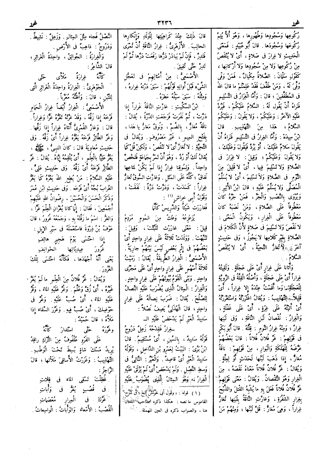 ركوعها وسجودها وطُهورها وهو أَن لا يُتِمَّ ركوعها وسجودها قال أَبو عبيد فمعنى الحديث لا غِرار في صلاة أَي لا يُنْقَص من ركوعها ولا من سجودها ولا أَركانها كقول سَلْمان الصلاة مكيال فمن وَفَّى وُفِّيَ له ومن طَفّفَ فقد علمتم ما قال الله في المُطَفِّفِين قال وأَما الغِرَارُ في التسليم فنراه أَن يقول له السَّلام عليكم فَيَرُدُّ عليه الآخر وعليكم ولا يقول وعليكم السلام هذا من التهذيب قال ابن سيده وأَما الغِرارُ في التّسليم فنراه أَن يقول سَلامٌ عليكَ أَو يَرُدَّ فيقول وعليك ولا يقول وعليكم وقيل لا غِرَارَ في الصلاة ولا تَسليم فيها أَي لا قليل من النوم في الصلاة ولا تسليم أَي لا يُسَلِّم المصلّي ولا يَسَلَّم عليه قال ابن الأَثير ويروى بالنصب والجر فمن جرّه كان معطوفاً على الصلاة ومن نصبه كان معطوفاً على الغِرار ويكون المعنى لا نَقْصَ ولا تسليمَ في صلاة لأَن الكلام في الصلاة بغير كلامها لا يجوز وفي حديث آخر تُغارُّ التحيّةُ أَي يُنْقَص السلامُ وأَتانا على غِرارٍ أَي على عجلة ولقيته غِراراً أَي على عجلة وأَصله القلَّةُ في الرَّوِية للعجلة وما أَقمت عنده إلا غِراراً أَي قليلاً التهذيب ويقال اغْتَرَرْتُه واسْتَغْرَرْتُه أَي أَتيته على غِرّة أَي على غفلة والغِرار نُقصانُ لبن الناقة وفي لبنها غِرارٌ ومنه غِرارُ النومِ قِلّتُه قال أَبو بكر في قولهم غَرَّ فلانٌ فلاناً قال بعضهم عرَّضه للهلَكة والبَوارِ من قولهم ناقة مُغارٌّ إذا ذهب لبنها لحَدث أَو لعلَّة ويقال غَرَّ فلان فلاناً معناه نَقَصه من الغِرار وهو النقصان ويقال معنى قولهم غَرَّ فلان فلاناً فعل به ما يشبه القتلَ والذبح بِغرار الشّفْرة وغارَّت الناقةُ بلبنها تُغارُّ غِراراً وهي مُغارٌّ قلّ لبنها ومنهم من قال ذلك عند كراهيتها للولد وإنكارها الحالِبَ الأَزهري غِرارُ الناقةِ أَنْ تُمْرَى فَتَدِرّ فإن لم يُبادَرْ دَرُّها رفَعَت دَرَّها ثم لم تَدِرّ حتى تُفِيق الأَصمعي من أَمثالهم في تعَجُّلِ الشيء قبل أوانِه قولهم سَبَقَ درَّتُه غِرارَه ومثله سَبَقَ سَيْلُه مَطرَه ابن السكيت غارَّت الناقةُ غراراً إِذا دَرَّت ثم نفرت فرجعت الدِّرَة يقال ناقة مُغارٌّ بالضم ونُوق مَغارُّ يا هذا بفتح الميم غير مصروف ويقال في التحية لا تُغارَّ أَي لا تَنْقُصْ ولكن قُلْ كما يُقال لك أَو رُدَّ وهو أَن تمرَّ بجماعة فتخصَّ واحداً ولِسُوقنا غِرارٌ إذا لم يكن لمتاعها نَفاقٌ كله على المثل وغارَّت السوقُ تُغارُّ غِراراً كسَدَت ودَرَّت دَرَّةً نفَقَت وقول أَبي خراش
