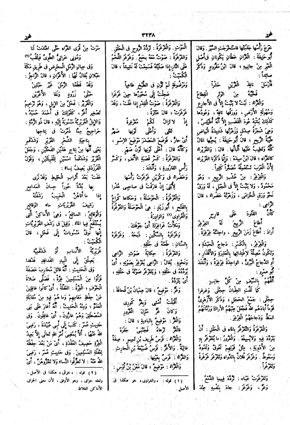 خرج رأْسها جَذَبَتْها فاسْتَخْرَجَت السَّيْرَ وقال أَبو حنيفة الغَرّانِ خَطّانِ يكونان في أَصل العَيْر من جانبيه قال ابن مقروم وذكر صائداً فأَرْسَلَ نافِذَ الغَرَّيْن حَشْراً فخيَّبه من الوَتَرِ انْقِطاعُ والغرّاء نبت لا ينبت إِلاّ في الأَجارِع وسُهولةِ الأَرض ووَرَقُها تافِةٌ وعودها كذلك يُشْبِه عودَ القَضْب إلاّ أَنه أُطَيْلِس وهي شجرة صدق وزهرتها شديدة البياض طيبة الريح قال أَبو حنيفة يُحبّها المال كله وتَطِيب عليها أَلْبانُها قال والغُرَيْراء كالغَرّاء قال ابي سيده وإِنما ذكرنا الغُرَيْراء لأَن العرب تستعمله مصغراً كثيراً والغِرْغِرُ من عشب الربيع وهو محمود ولا ينبت إِلا في الجبل له ورق نحو ورق الخُزامى وزهرته خضراء قال الراعي كأَن القَتُودَ على قارِحٍ أَطاع الرَّبِيعَ له الغِرْغِرُ أراد أَطاع زمن الربيع واحدته غِرْغِرة والغِرْغِر بالكسر دَجاج الحبشة وتكون مُصِلّةً لاغتذائها بالعَذِرة والأَقْذار أَو الدجاجُ البرّي الواحدة غِرْغرة وأَنشد أَبو عمرو أَلُفُّهُمُ بالسَّيفِ من كلِّ جانبٍ كما لَفَّت العِقْبانُ حِجْلى وغِرغِرا حِجْلى جمع الحَجَلِ وذكر الأَزهري قوماً أَبادهم الله فجعل عِنَبَهم الأَراك ورُمَّانَهم المَظَّ ودَجاجَهم الغِرْغِرَ والغَرْغَرَةُ والتَّغَرْغُر بالماء في الحَلْقِ أَن يتردد فيه ولا يُسيغه والغَرُورُ ما يُتَغَرْغَرُ به من الأَدْوية مثل قولهم لَعُوق ولَدُود وسَعُوط وغَرْغَر فلانٌ بالدواء وتَغَرْغَرَ غَرْغَرةً وتَغَرْغُراً وتَغَرْغَرَت عيناه تردَّد فيهما الدمع وغَرَّ وغَرْغَرَ جادَ بنفسه عند الموت والغَرْغَرَةُ تردُّد الروح في الحلق والغَرْغَرَةُ صوتٌ معه بَجَحٌ وغَرْغَرَ اللحمُ على النار إِذا صَلَيْتَه فسمعت له نشِيشاً قال الكميت ومَرْضُوفة لم تُؤْنِ في الطَّبْخِ طاهِياً عَجِلْتُ إلى مُحْوَرِّها حين غَرْغَرا والغَرْغَرة صوت القدر إذا غَلَتْ وقد غَرْغَرت قال عنترة إِذ لا تَزالُ لكم مُغَرْغِرة تَغْلي وأَعْلى لَوْنِها صَهْرُ أَي حارٌّ فوضع المصدر موضع الاسم وكأَنه قال أَعْلى لونِها لونُ صَهْر والغَرْغَرةُ كَسْرُ قصبة الأَنف وكَسْرُ رأْس القارورة وأَنشد وخَضْراء في وكرَيْنِ غَرْغَرْت رأْسها لأُبْلِيَ إن فارَقْتُ في صاحِبي عُذْرا والغُرْغُرةُ الحَوْصلة وحكاها كراع بالفتح أَبو زيد هي الحوصلة والغُرْغُرة والغُراوي