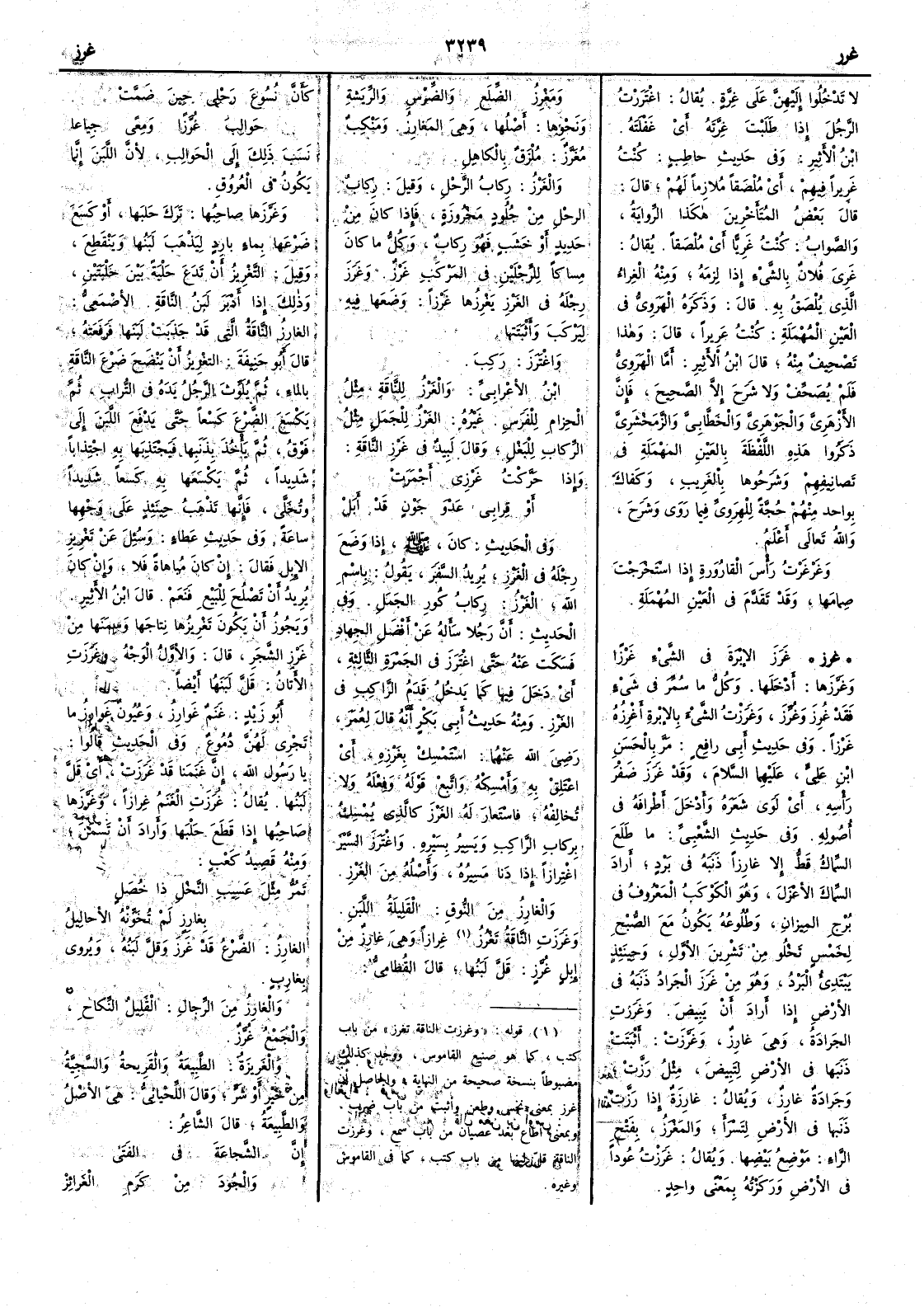 غِرازاً وهي غارِزٌ من إِبل غُرَّزٍ قَلَّ لبنها قال القُطامي كأَنَّ نُسُوعَ رَحْلي حينَ ضَمَّتْ حَوالِبَ غُرَّزاً ومِعًى جِياعا نسب ذلك إِلى الحوالب لأَن اللبن إِنما يكون في العروق وغَرَّزَها صاحِبُها ترك حلبها أَو كَسَع ضَرْعَها بماء بارد ليذهب لبنها وينقطع وقيل التَّغْرِيزُ أَن تَدَعَ حَلْبَةً بين حلبتين وذلك إِذا أَدبر لبن الناقة الأَصمعي الغارِزُ الناقةُ التي قد جَذَبَتْ لبنها فرفعته قال أَبو حنيفة التَّغْرِيزُ أَن يَنْضَح ضَرْعَ الناقة بالماء ثم يُلَوِّثَ الرجلُ يَدَه في التراب ثم يَكْسَعَ الضَّرْعَ كَسْعاً حتى يدفع اللبن إِلى فوق ثم يأْخذ بذنبها فيجتذبها به اجتذاباً شديداً ثم يكسعها به كسعاً شديداً وتُخَلَّى فإِنها تذهب حينئذ على وجهها ساعة وفي حديث عطاء وسئل عن تَغْرِيزِ الإِبل فقال إِن كان مُباهاةً فلا وإِن كان يريد أَن تَصْلُحَ للبيع فَنَعَمْ قال ابن الأَثير ويجوز أَن يكون تَغْرِيزُها نِتاجَها وسِمَنَها من غَرْزِ الشجر قال والأَول الوجه وغَرَزَتِ الأَتانُ قَلَّ لبنها أَيضاً أَبو زيد غَنَمٌ غَوارِزُ وعُيونٌ غَوارِزُ ما تجري لهن دُموع وفي الحديث قالوا يا رسول الله إِن غنمنا قد غَرَزَتْ أَي قلّ لبنها يقال غَرَزَت الغنم غِرازاً وغَرَّزَها صاحبُها إِذا قطع حلبها وأَراد أَن تَسْمَنَ ومنه قصيد كعب تمرُّ مِثلَ عَسِيبِ النَّخْلِ ذا خُصَلٍ بغارِزٍ لم تُخَوِّنْهُ الأَحالِيلُ الغارِزُ الضَّرْعُ قد غَرَزَ وقَلَّ لبنه ويروى بغارب والغارِزُ من الرجال القليل النكاح والجمع غُرَّزٌ والغَرِيزَةُ الطبيعةُ والقريحةُ والسَّجِيَّة من خير أَو شر وقال اللحياني هي الأَصل والطبيعة قال الشاعر إِنّ الشَّجاعَةَ في الفَتى والجُودَ من كَرَمِ الغَرائزْ