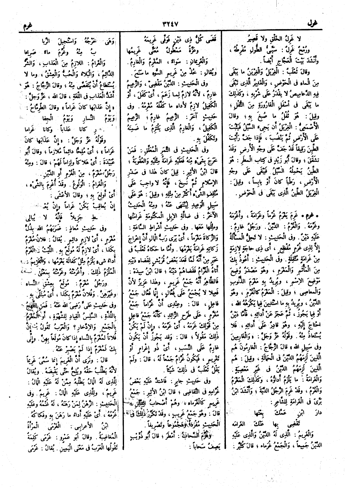 ( غرم ) غَرِمَ يَغرَمُ غُرْماً وغَرامةً وأغرَمَه وغَرَّمَه والغُرْمُ الدَّيْنُ ورَجُلٌ غارمٌ عليه دَيْنٌ وفي الحديث لا تَحِلُّ المسأَلة إلاَّ لِذِي غُرمٍ مُفْظِعٍ أَي ذي حاجة لازمة من غَرامة مُثْقِلة وفي الحديث أعوذ بك من المَأْثَم والمَغْرَمِ وهو مصدر وضع موضع الاسم ويريد به مَغْرَمَ الذنوب والمعاصي وقيل المَغْرَم كالغُرْم وهو الدَّيْن ويريد به ما اسْتُدِين فيما يكرهه الله أَو فيما يجوز ثم عجز عن أَدائه فأَما دين إحتاج إليه وهو قادر على أَدائه فلا يستعاذ منه وقوله عز وجل والغارِمِين وفي سبيل الله قال الزجاج الغارمون هم الذين لَزِمَهم الدَّيْنُ في الحَمالة وقيل هم الذين لزمهم الدين في غير معصية والغَرامةُ ما يلزم أَداؤه وكذلك المَغْرَمُ والغُرْمُ وقد غَرِمَ الدِّيةَ وأَنشد ابن بري في الغَرامة للشاعر دار ابْنِ عَمِّكَ بِعْتَها تَقْضي بها عَنْكَ الغَرامه والغَرِيم الذي له الدِّيْن والذي عليه الدين جميعاً والجمع غُرَماء قال كثير قَضى كلُّ ذِي دَيْنٍ فَوَفَّى غَرِيمَه وعَزَّةُ مَمْطُولٌ مُعَنّىً غرِيمُها والغَرِيمان سَواءٌ المُغْرِمُ والغارِمُ ويقال خُذْ مِنْ غَرِيمِ السُّوء ما سَنَحَ وفي الحديث الدَّيْنُ مَقْضيٌّ والزَّعِيمُ غارِمٌ لأَنه لازم لما زَعَم أَي كَفَل أَو الكفيل لازم لأَداء ما كَفَّله مُغْرِمُه وفي حديث آخر الزَّعِيم غارِمٌ الزَّعِيم الكفيل والغارِم الذي يلتزم ما ضَمِنه وتكَفَّل به وفي الحديث في الثَّمر المُعَلَّق فمن خرج بشيء منه فعليه غَرامةُ مِثْلَيْه والعقوبة قال ابن الأثير قيل كان هذا في صدر الإسلام ثم نُسخ فإنه لا واجب على مُتْلِف الشيء أَكثر من مثله وقيل هو على سبيل الوعيد لينتهي عنه ومنه الحديث الآخر في ضالَّةِ الإبل المكتومة غَرامَتُها ومِثْلُها معها وفي حديث أشراط الساعة والزكاة مَغْرَماً أي يَرَى رَبُّ المال أن إخراج زكاته غَرامةٌ يَغرَمُها وأَما ما حكاه ثعلب في خبر من أَنه لما قعد بعض قريش لقضاء دينه أَتاه الغُرَّامُ فقضاهم دَيْنَه قال ابن سيده فالظاهر أَنه جمع غَرِيمٍ وهذا عزيز إن فَعِيلاً لا يجمع على فُعَّال إنما فُعَّال جمع فاعل قال وعندي أن غُرَّاماً جمع مُغَرِّم على طرح الزائد كأَنه جمع فاعل من قولك غَرَمَه أَي غَرَّمَه وإن لم يكن ذلك مقولاً قال وقد يجوز أن يكون غارمٌ على النسب أي ذو إغرام أو تَغْريم فيكون غُرَّامٌ جمعاً له قال ولم يقل ثعلب في ذلك شيئاً وفي حديث جابر فاشْتَدَّ عليه بَعْضُ غُرَّامِه في التَّقاضي قال ابن الأثير جمع غَرِيم كالغُرَماء وهم أصحاب الدين قال وهو جمع غريب وقد تكرر ذلك في الحديث مفرداً ومجموعاً وتصريفاً وغُرِّمَ السحابُ أَمطَرَ قال أَبو ذؤيب يصف سحاباً وَهَى خَرْجُهُ واسْتُجِيلَ الرَّبا بُ مِنْهُ وغُرِّمَ ماءً صَرِيحا والغَرامُ اللازم من العذاب والشرُّ الدائم والبَلاءُ والحُبُّ والعشق وما لا يستطاع أَن يُتَفَصَّى منه وقال الزجاج هو أَشدُّ العذاب في اللغة قال الله عز وجل إن عذابها كان غراماً وقال الطرماح وَيَوْمُ النِّسارِ وَيَوْمُ الجِفا رِ كانا عَذاباً وكانا غَراما وقوله عز وجل إن عذابها كان غراماً أي مُلِحّاً دائماً ملازماً وقال أبو عبيدة أي هلاكاً ولِزاماً لهم قال ومنه رَجُلٌ مُعْرَمٌ من الغُرْم أَو الدَّيْن والغَرام الوَلُوعُ وقد أُغْرِم بالشيء أي أُولِع به وقال الأَعشى إنْ يُعاقِبْ يَكُنْ غَراماً وإن يُعْ طِ جَزِيلاً فإنَّه لا يُبالي وفي حديث معاذ ضَرَبَهُمُ الله بِذُلٍّ مُغْرَمٍ أي لازم دائم يقال فلان مُغْرَمٌ بكذا أي لازم له مُولَعٌ به الليث الغُرْمُ أَداء شيء يلزم مثل كفالة يَغْرَمها والغَرِيمُ المُلْزَم ذلك وأَغْرَمْتُه وغَرَّمْته بمعنى ورجل مُغْرَمٌ مُولَعٌ بعشق النساء وغيرهن وفلان مُغْرَمٌ بكذا أي مُبتَلىً به وفي حديث عليّ رضي الله عنه فَمَنِ اللَّهِجُ باللذَّة السَّلِسُ القِياد للشهوة أَو المُغْرَمُ بالجَمْع والادِّخار ؟ والعرب تقول إن فلاناً لمُغْرَمٌ 
